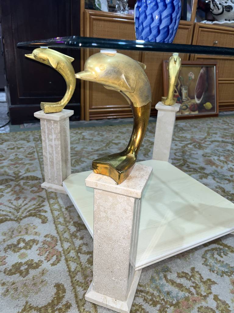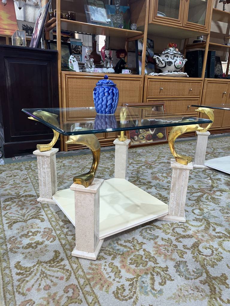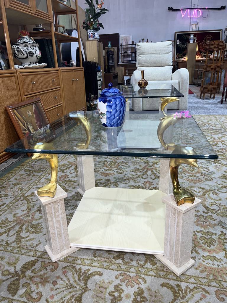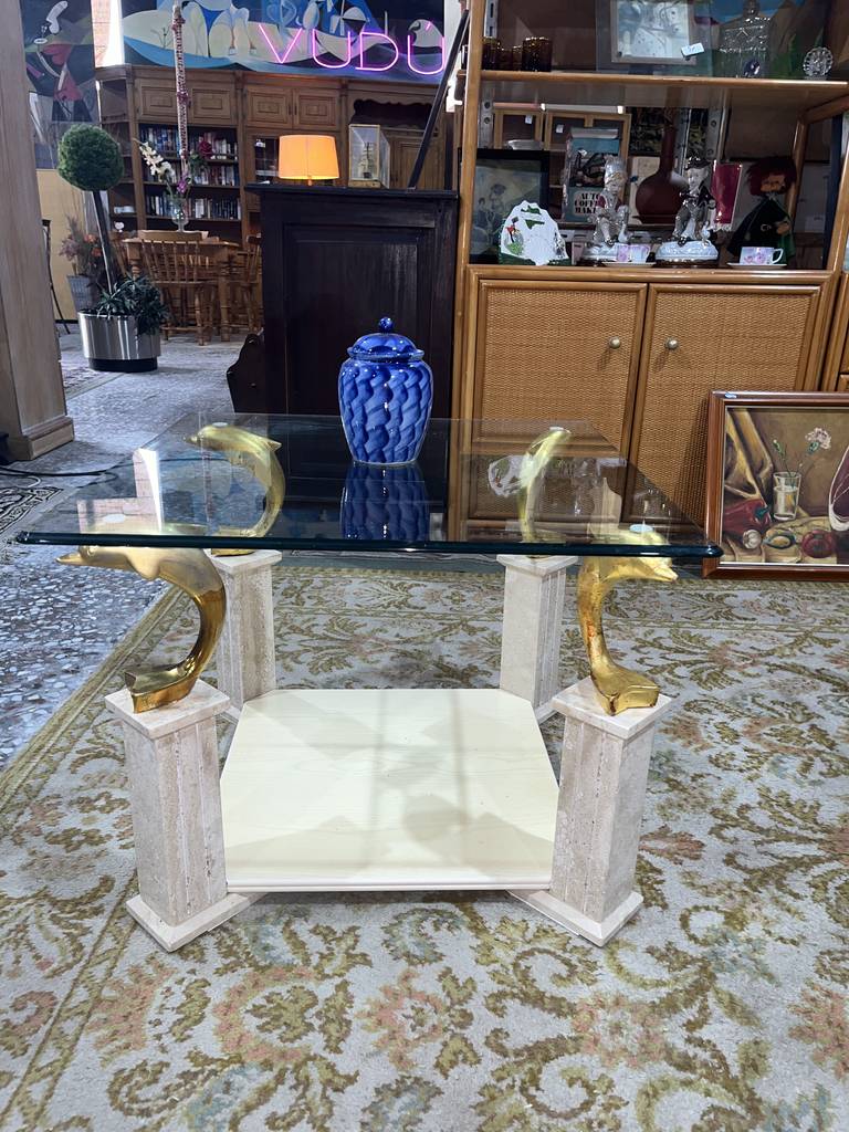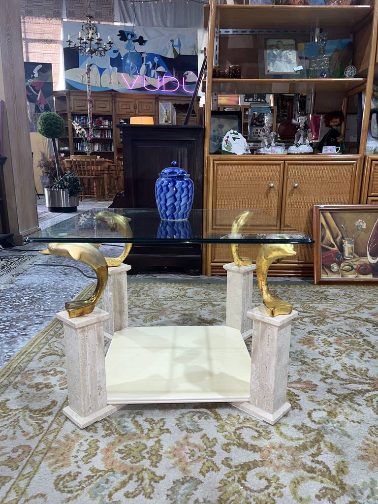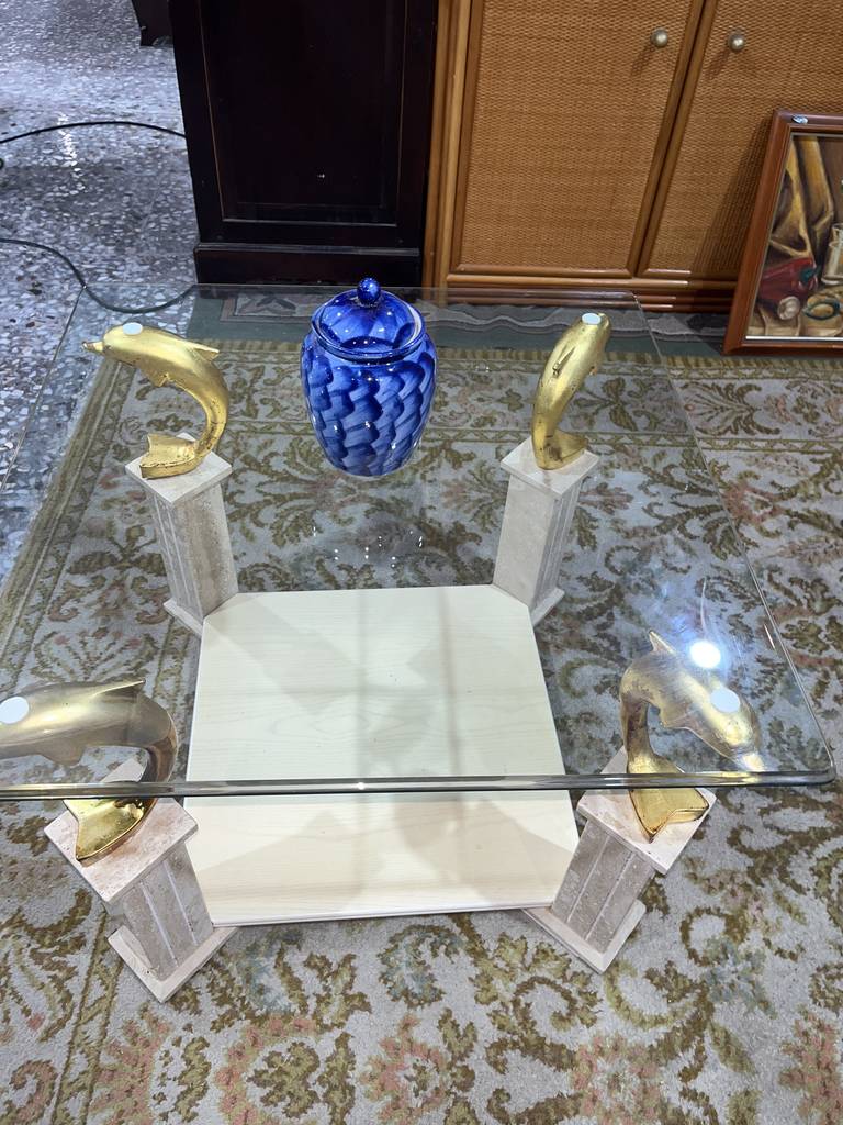Mesa de centro cuadrada muy bonita y selecta. Se trata de una mesa de centro única con cuatro delfines de color dorado a modo de sujeción del cristal superior y con un tablón inferior ideal para colocar revistas o libros. Aprovecha esta oportunidad de hacer resaltar tu salón comedor con una mesa única y elegante. Como podemos observar en las fotografías se encuentra en buenas condiciones.