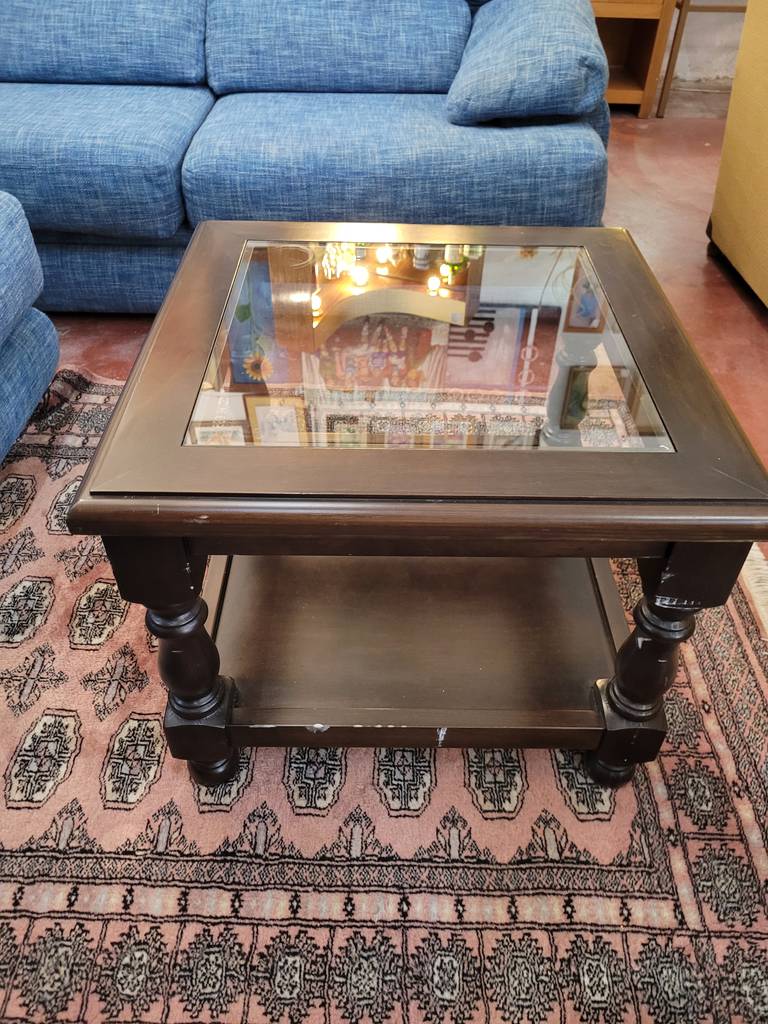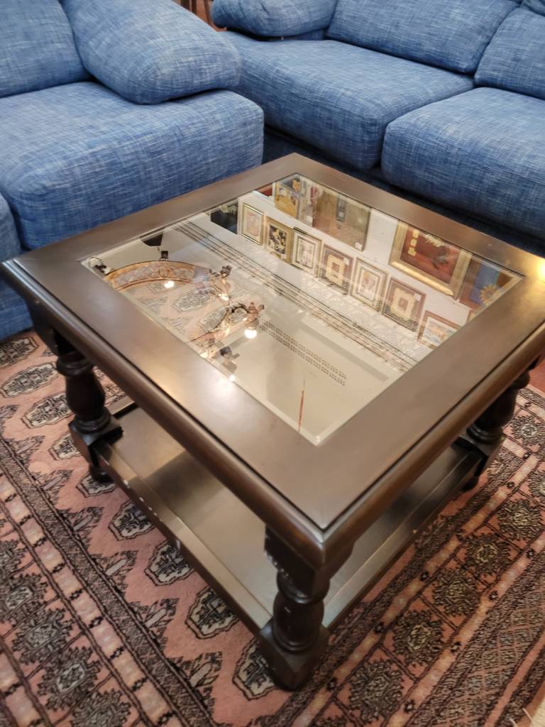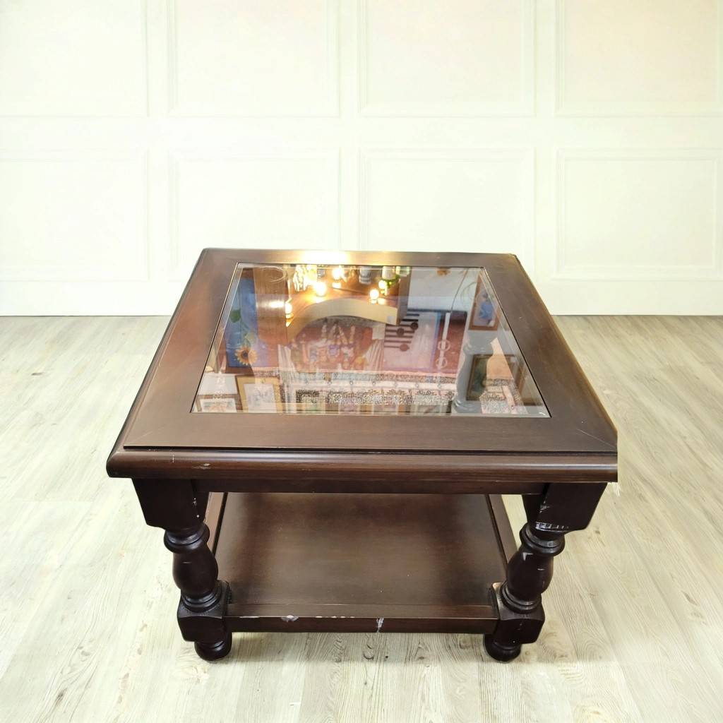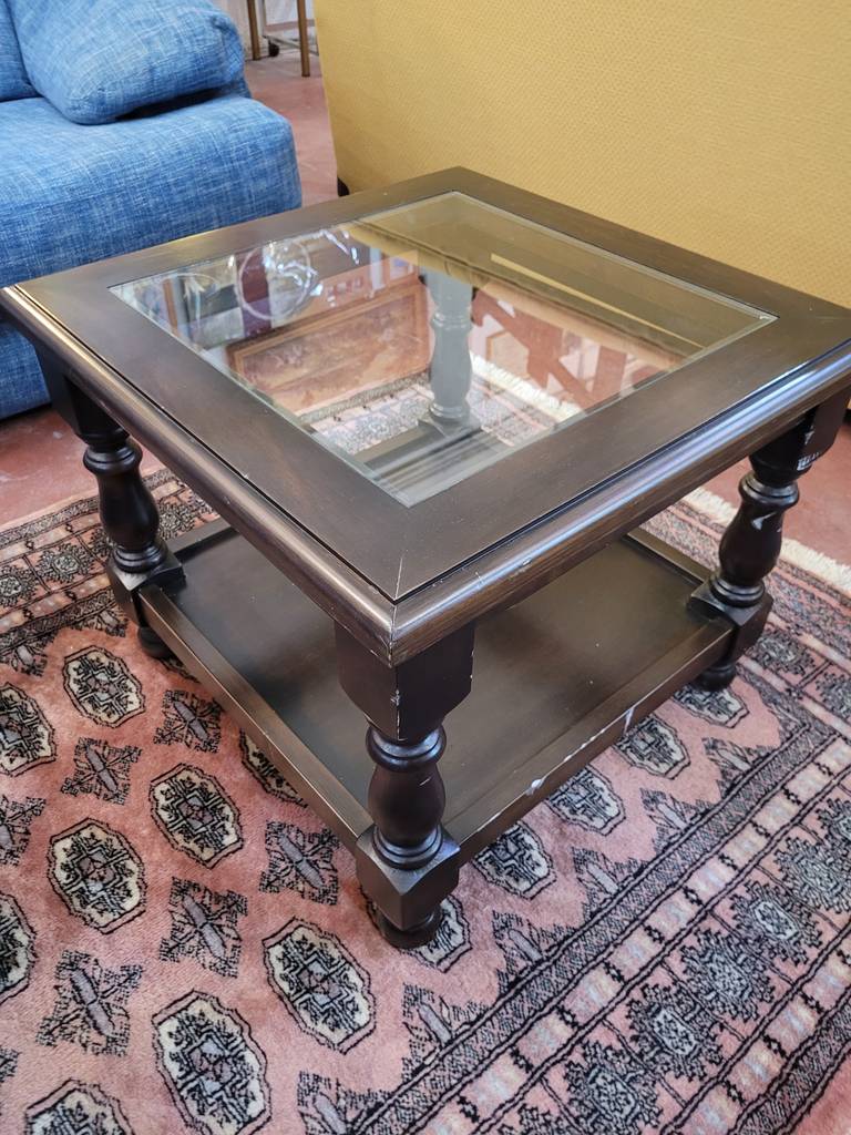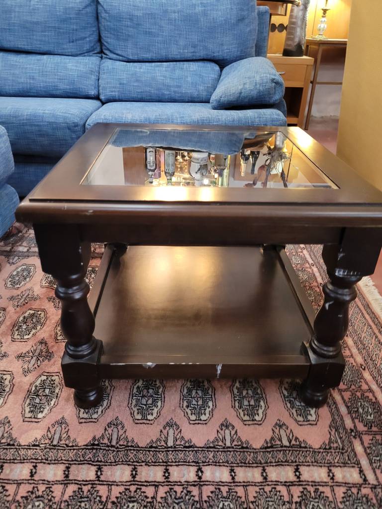 Mesa de centro con forma cuadrada de estilo clásico que ha sido fabricada con madera de buena calidad y robusta. Incorpora también un cristal central transparente en el centro y un habitáculo abierto inferior ideal para colocar libros o revistas. Sus cuatro patas torneadas la hacen muy estable. Es ideal para colocar en un salón comedor.
