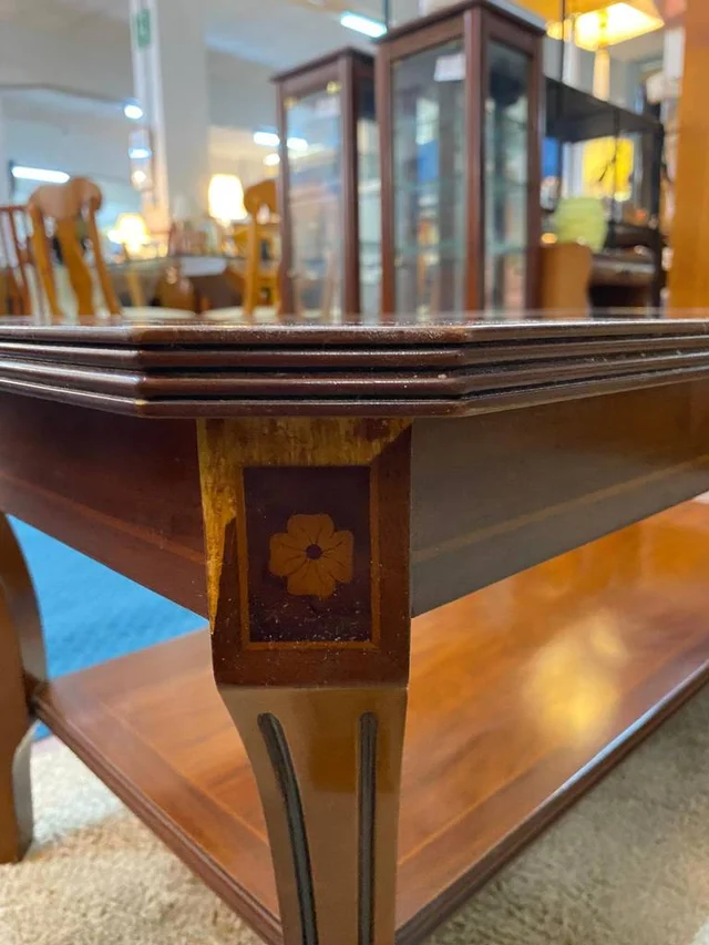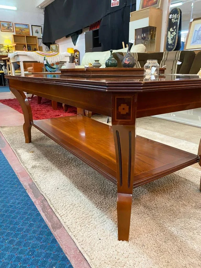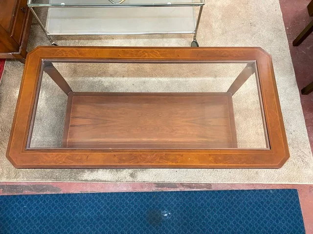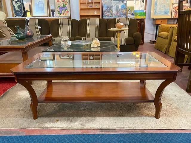 Mesa de centro con una forma rectangular que está fabricada en madera de buena calidad de color marrón oscuro. Se trata de una mesa de centro que tiene una superficie con un cristal grueso y tiene otra superficie inferior opaca. Es una mesa ideal para colocarla en un salón comedor entre un sofá y una televisión. Como se puede observar en las fotografías se encuentra en buenas condiciones.