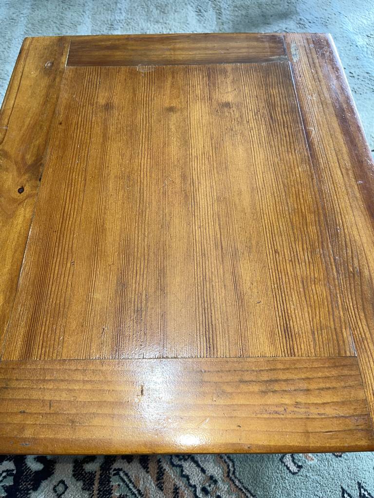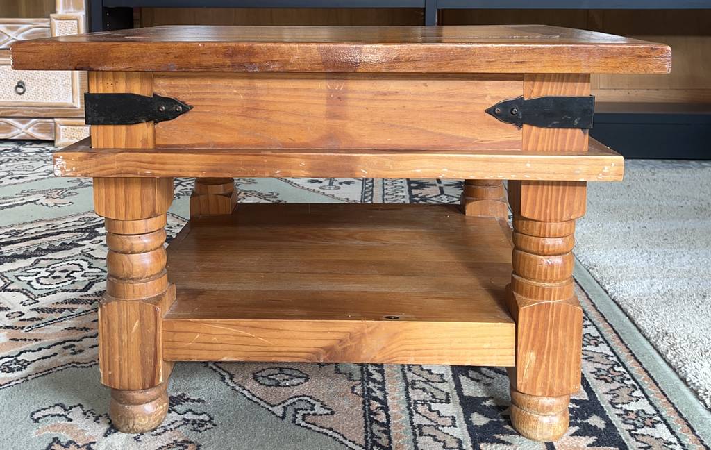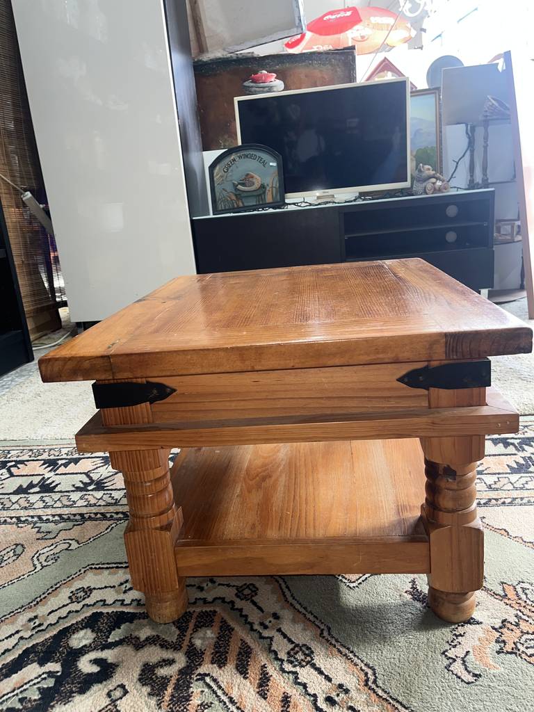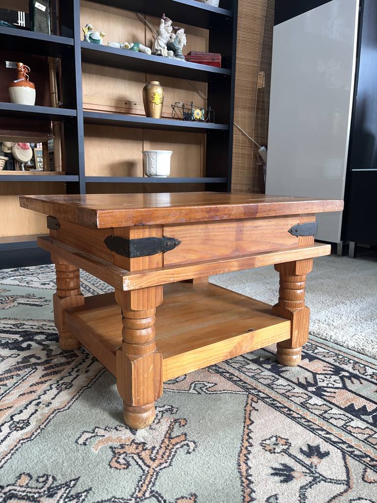 Mesa de centro de estilo rústico que ha sido fabricada con madera de buena calidad y robusta. Se trata de una mesa de centro compuesta por un tablón superior para tomar café o té y de un tablón grueso inferior perfecto para colocar revistas o libros. Es una mesa de centro ideal para aportar un toque rústico a nuestro salón comedor frente al sofá. Como podemos observar en las fotografías presenta rasguños