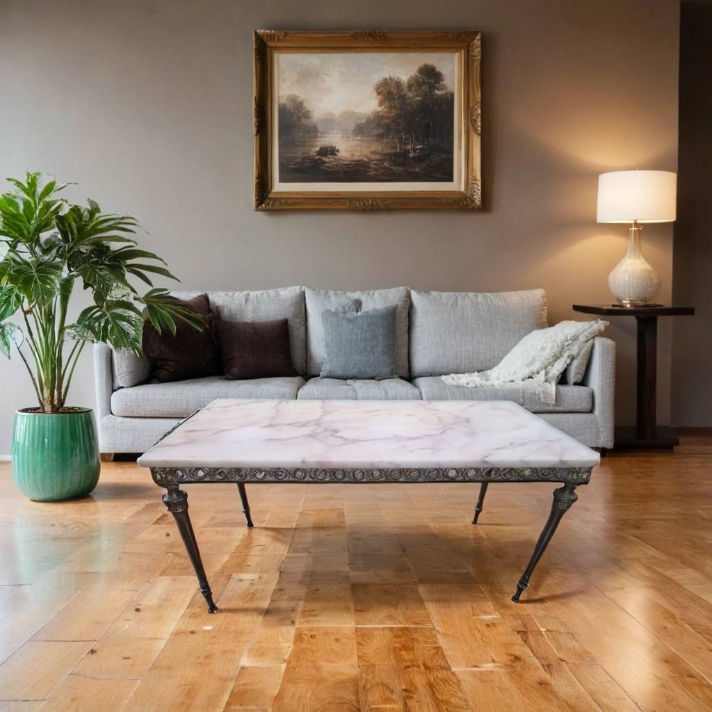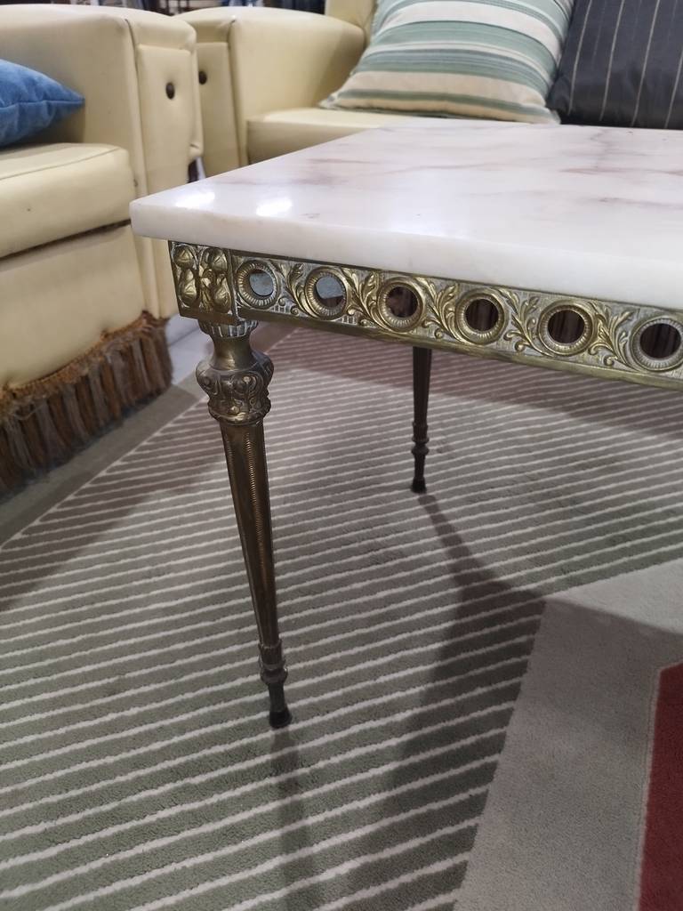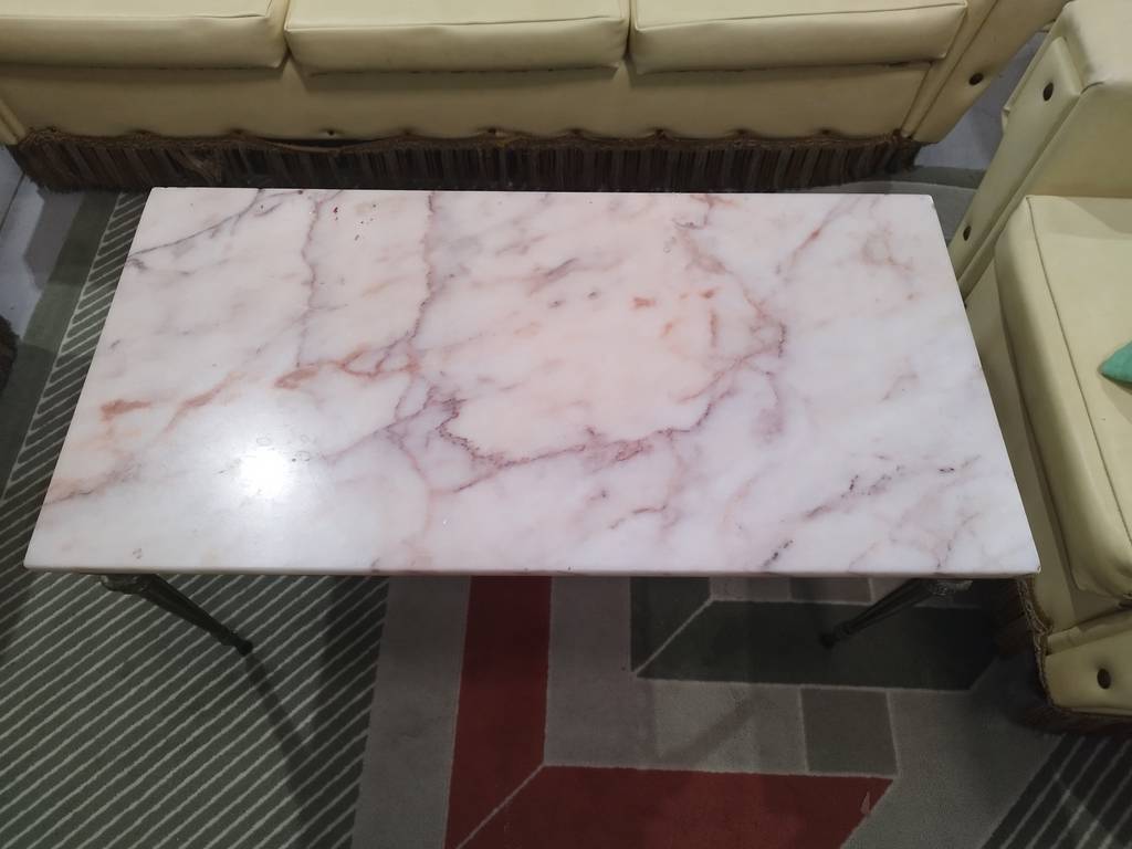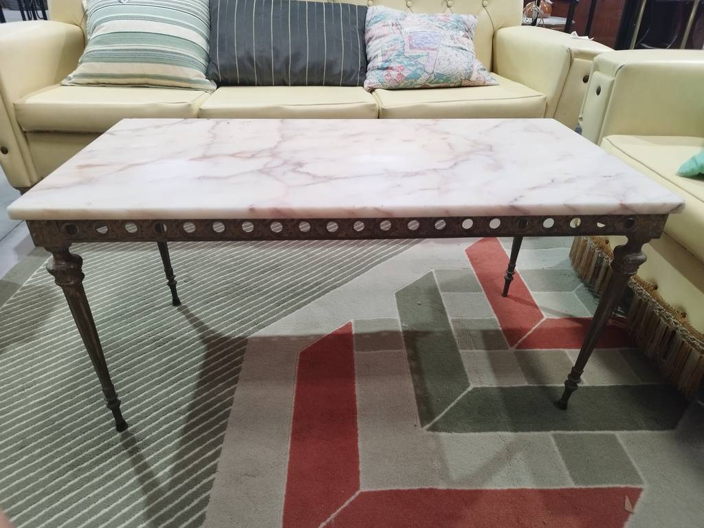 Mesa de centro de estilo vintage con un diseño elegante compuesta por unas patas de forja y con formas realizadas con precisión y detalle así como una parte superior con un mármol grueso de buena calidad. Es una mesa de centro ideal para colocar frente al sofá en nuestro salón comedor. Como podemos observar en las fotografías presenta desperfectos.