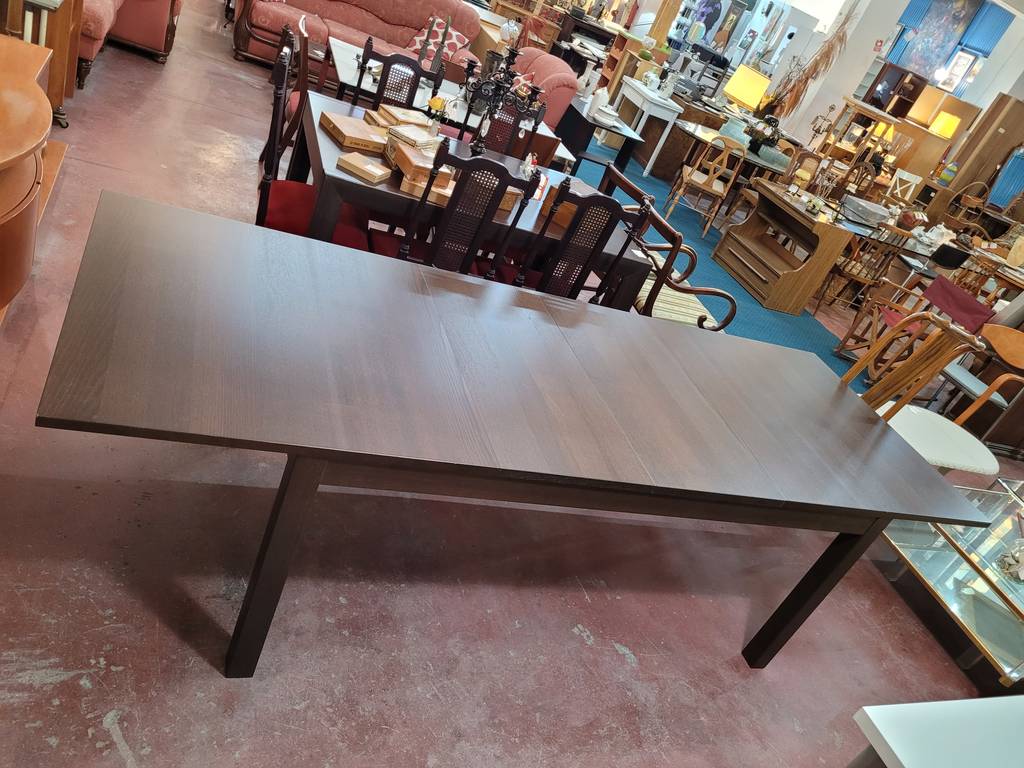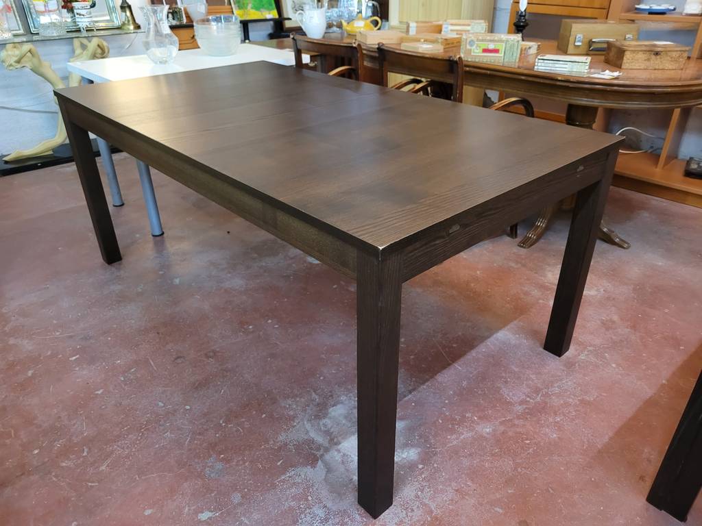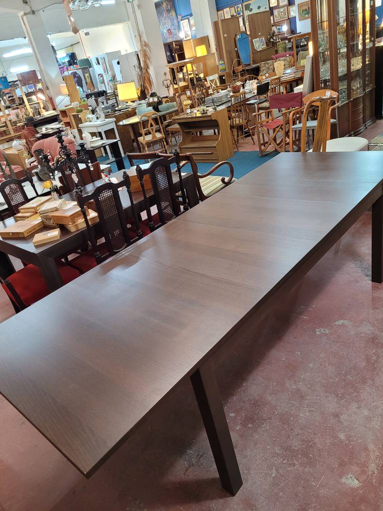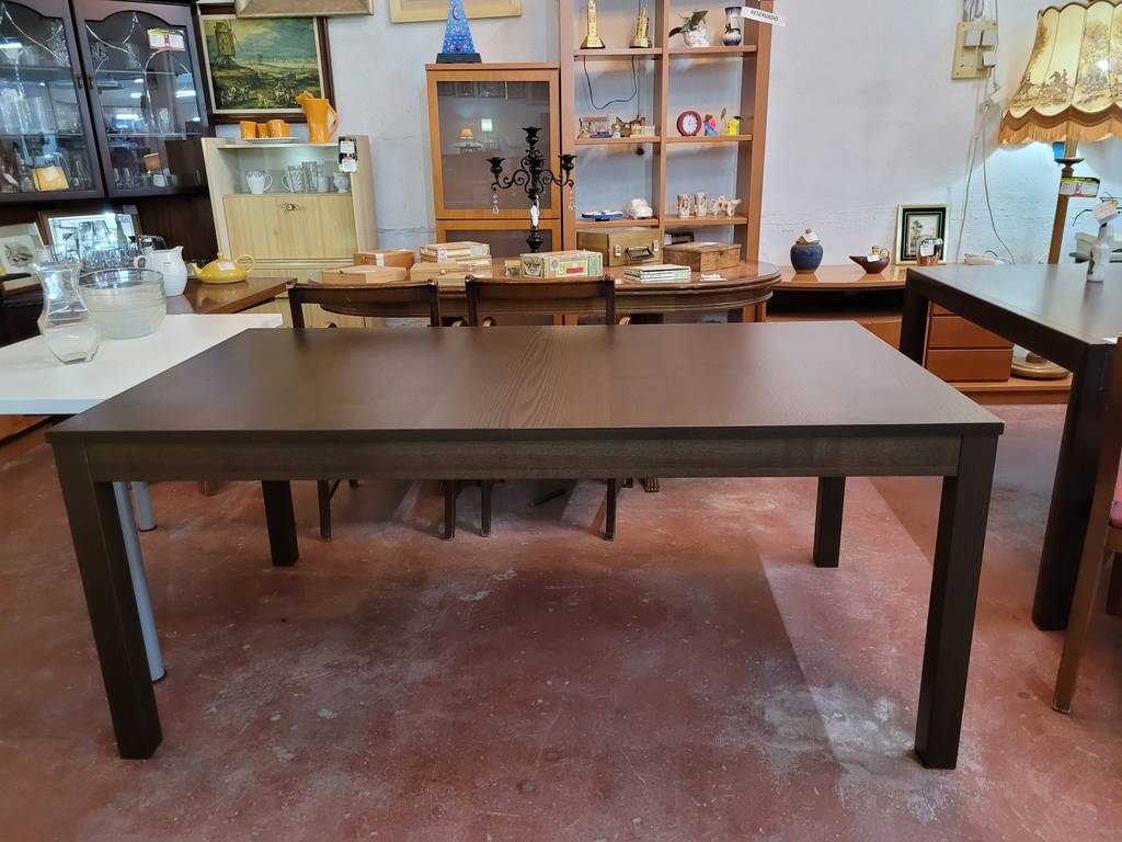 Mesa de comedor modelo Bjursta de la marca de muebles Ikea. Se trata de una mesa rectangular fabricada con madera de buena calidad y robusta. Podemos extender la mesa con una balda que podemos adherir en un lateral. Es una mesa muy elegante ideal para colocar en un salón comedor. Como podemos observar en las fotografías presenta ligeros rasguños.