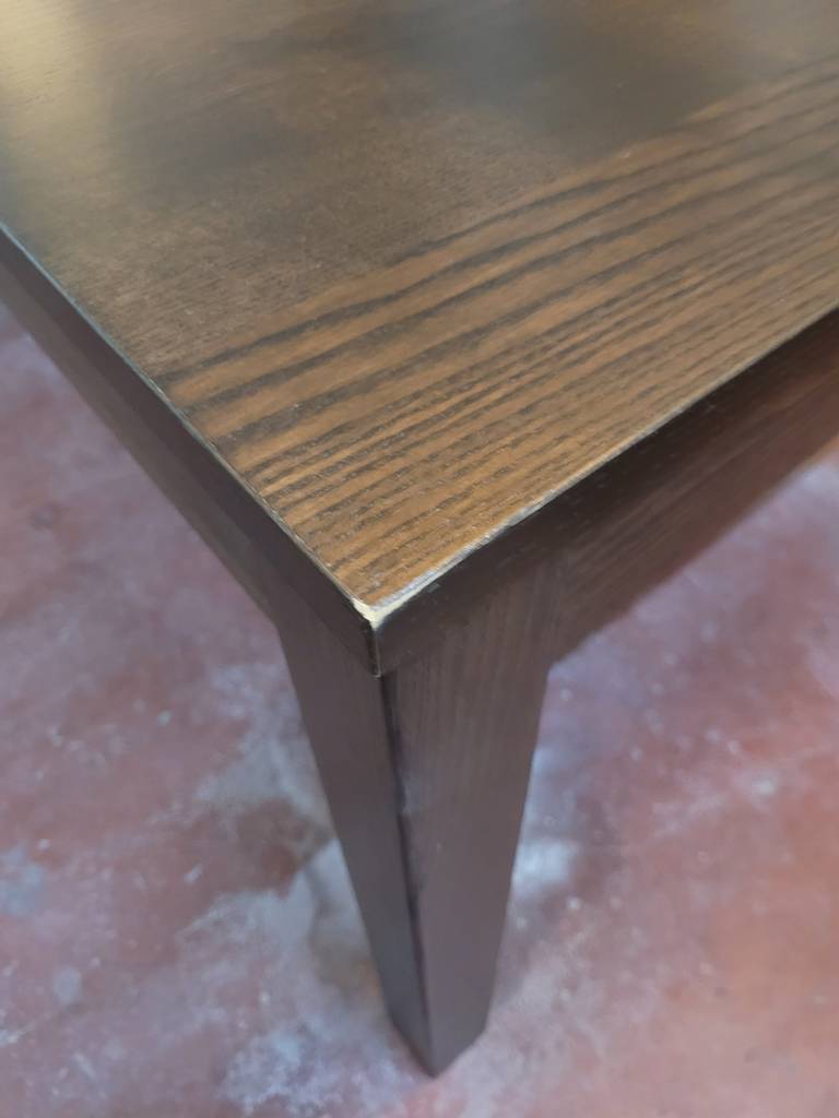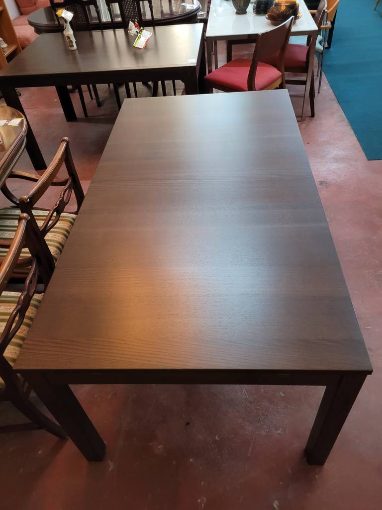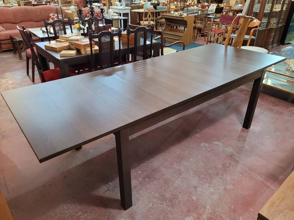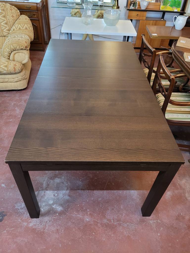Mesa de comedor modelo Bjursta de la marca de muebles Ikea. Se trata de una mesa rectangular fabricada con madera de buena calidad y robusta. Podemos extender la mesa con una balda que podemos adherir en un lateral. Es una mesa muy elegante ideal para colocar en un salón comedor. Como podemos observar en las fotografías presenta ligeros rasguños.