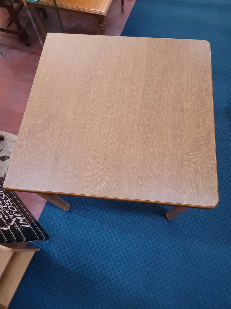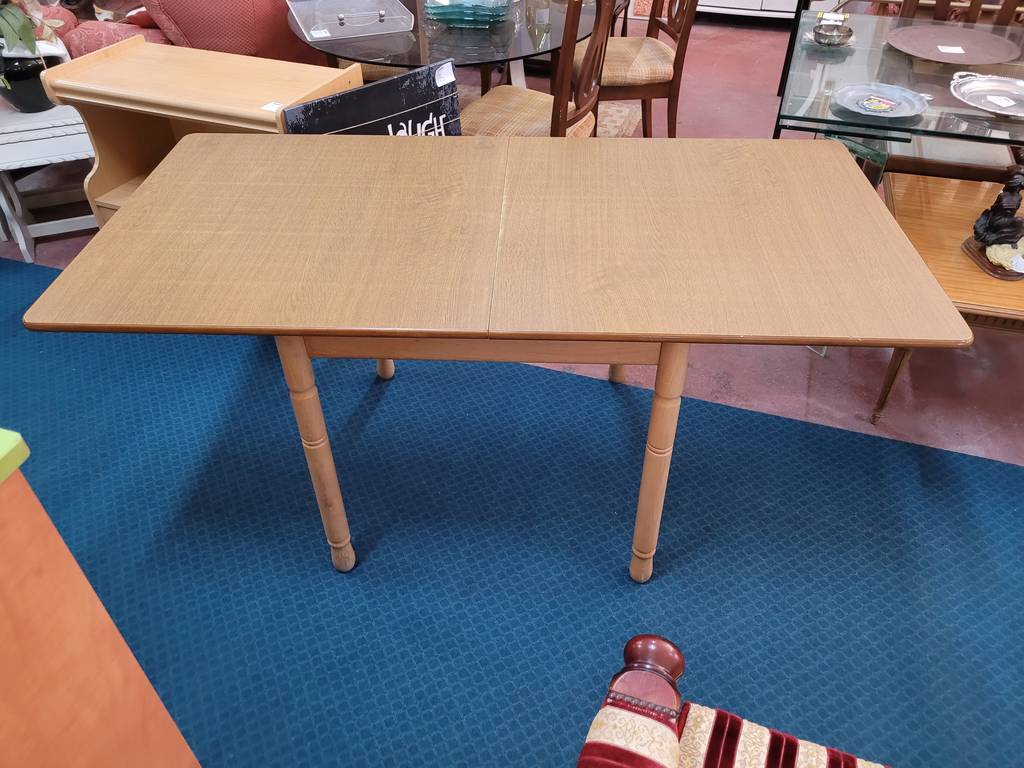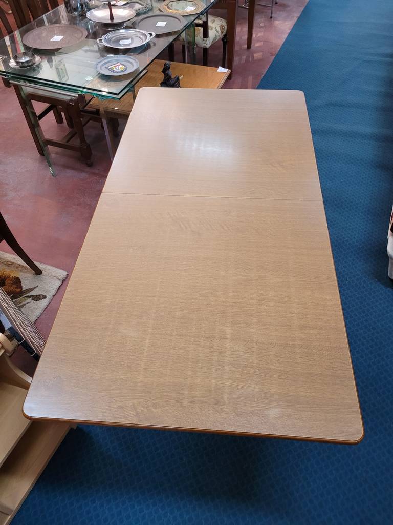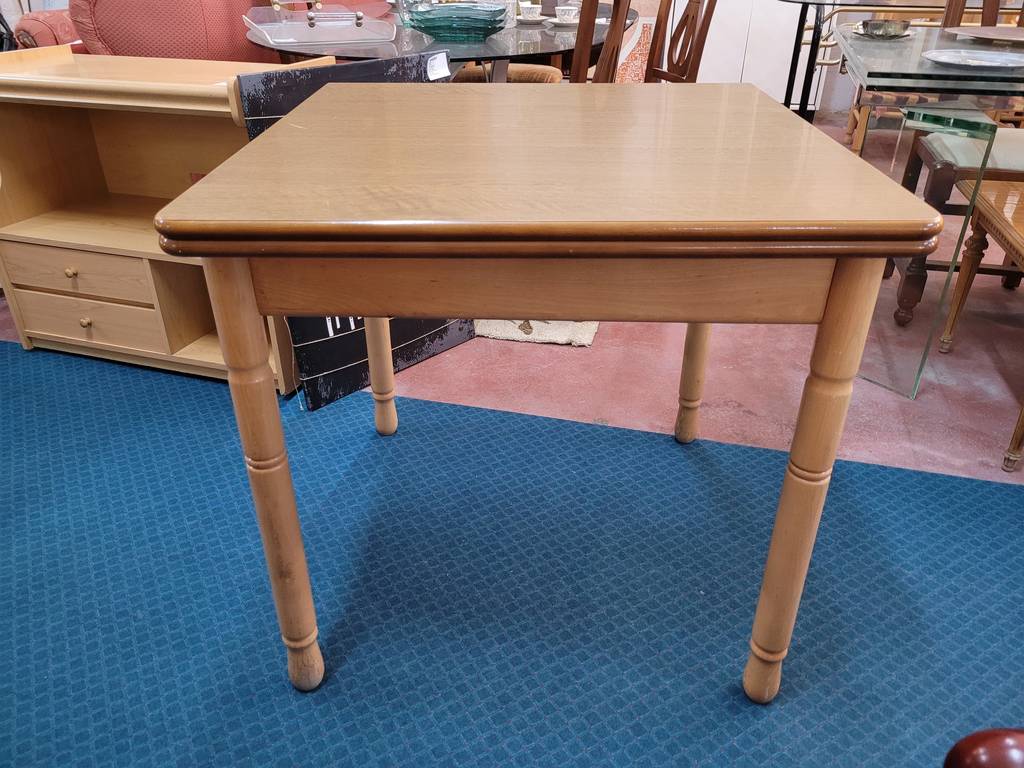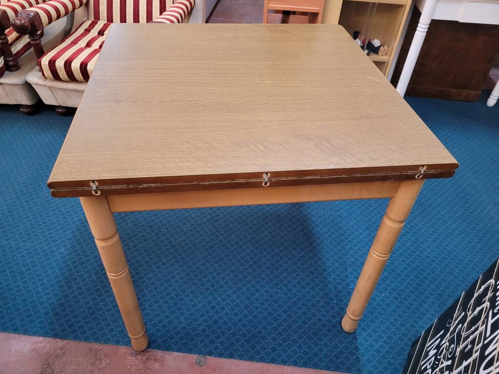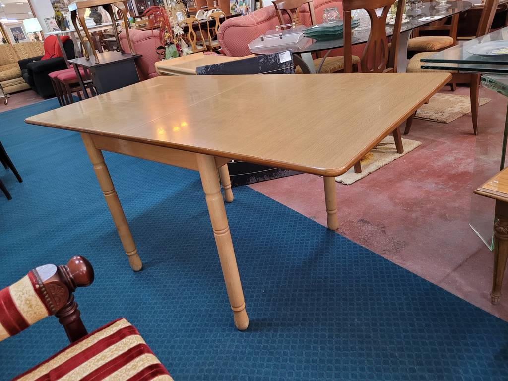Mesa de comedor plegable fabricada en madera de buena calidad de color marrón claro. Se trata de una mesa que tiene una forma cuadrada cuando está plegada, pero al abrirse adquiere una forma rectangular y alargada de gran tamaño. Es una mesa perfecta para colocarla en un salón comedor para comer con toda la familia. Como se puede observar en las fotografías se encuentra en buenas condiciones.