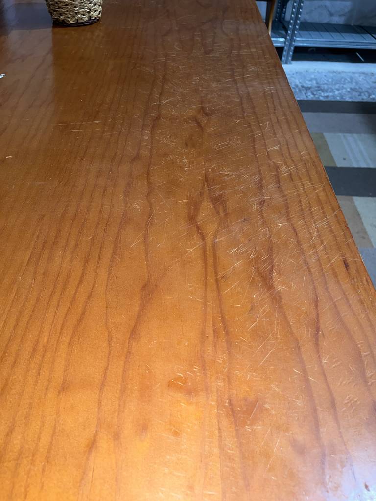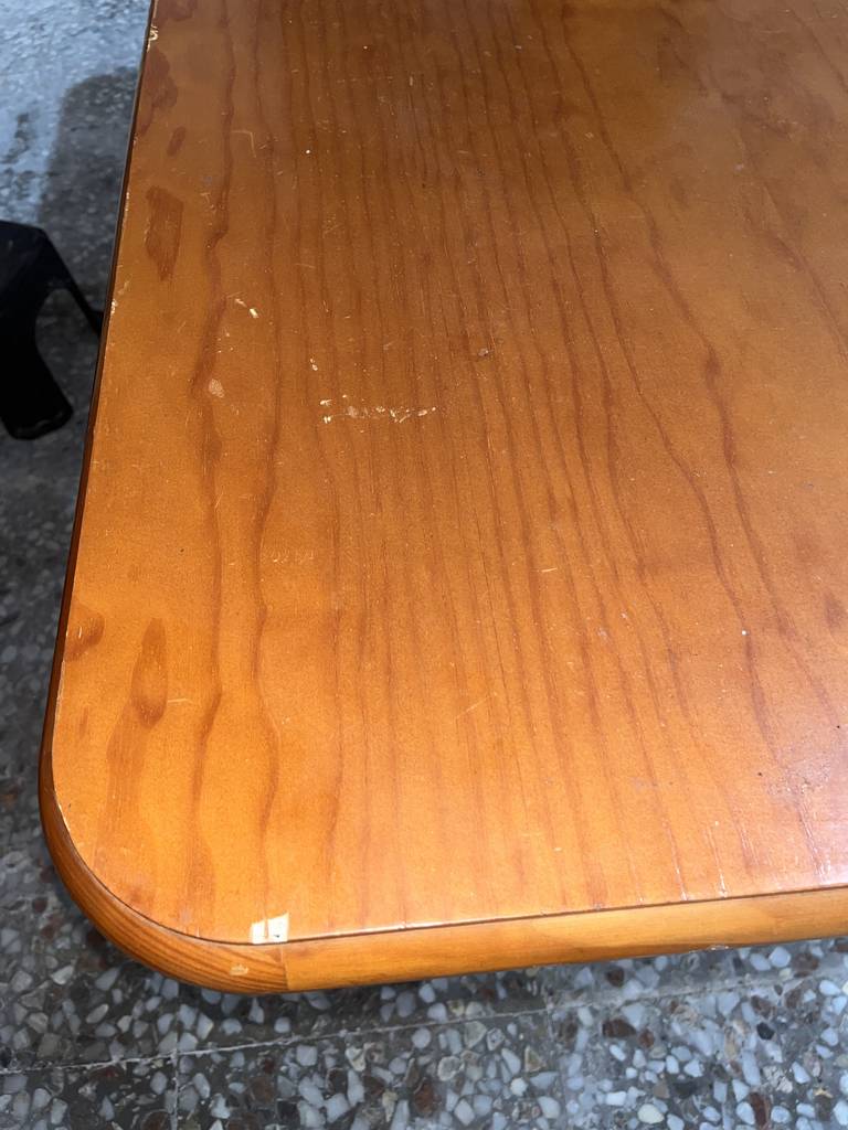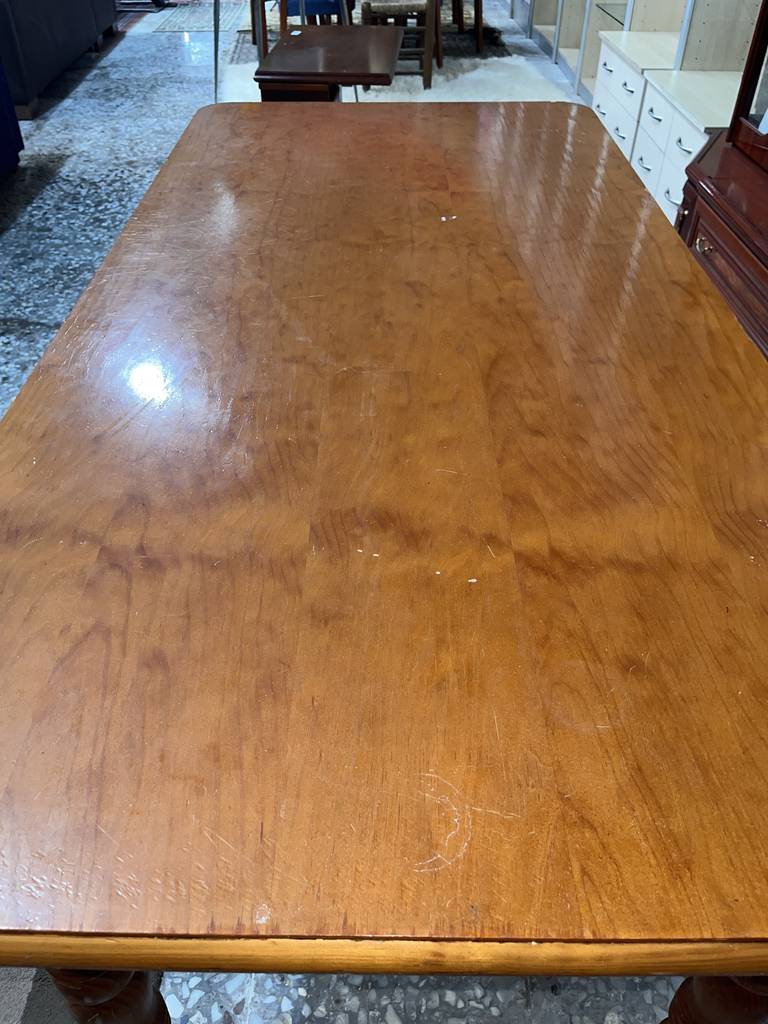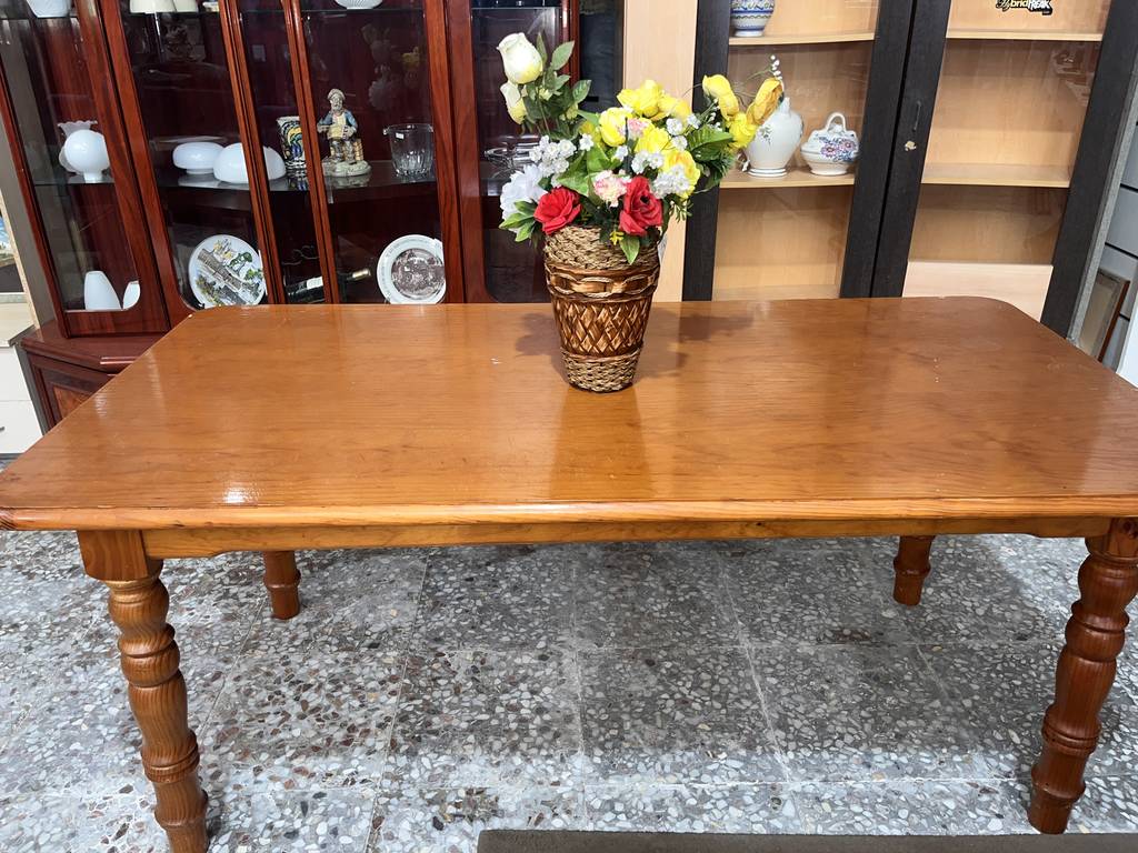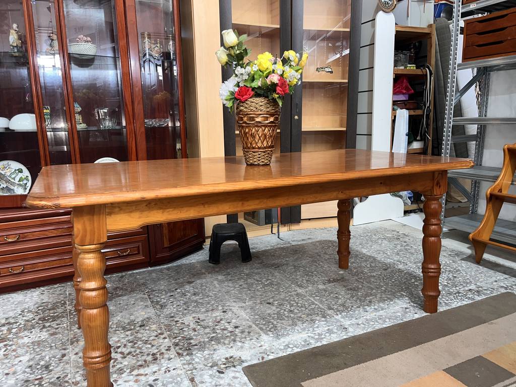 Mesa de comedor fabricada en madera de buena calidad de color marrón claro. Se trata de una mesa de comedor que tiene una superficie rectangular y alargada y cuenta con cuatro patas robustas. Es una mesa ideal para colocarla en un comedor para sentarse a comer a su alrededor toda la familia. Como se puede observar en las fotografías la mesa se encuentra algo deteriorada por el uso por lo que se recomienda restaurar.