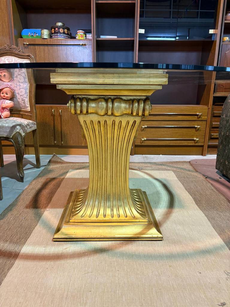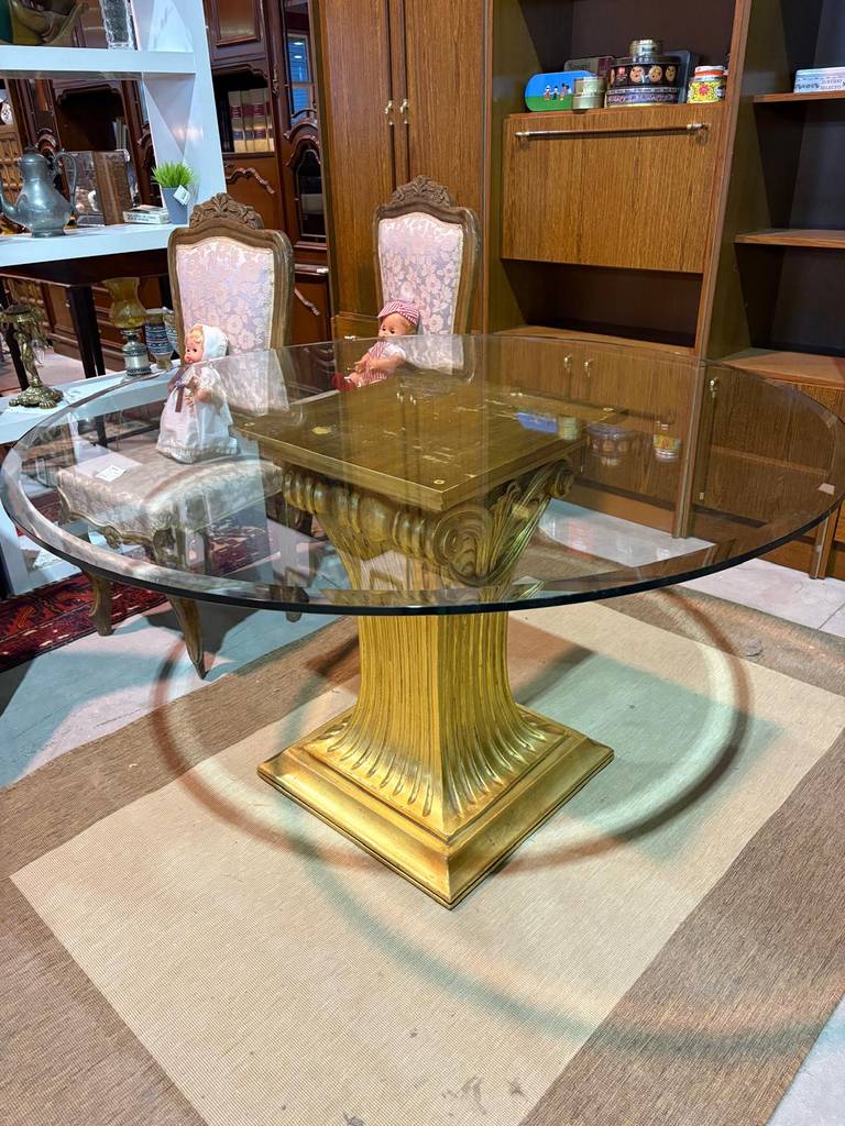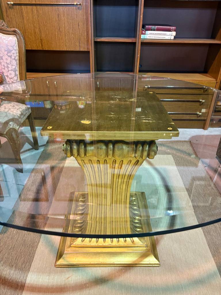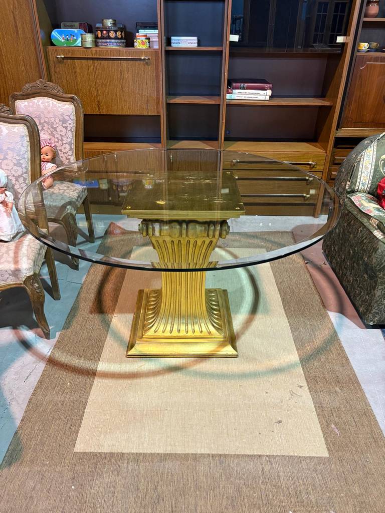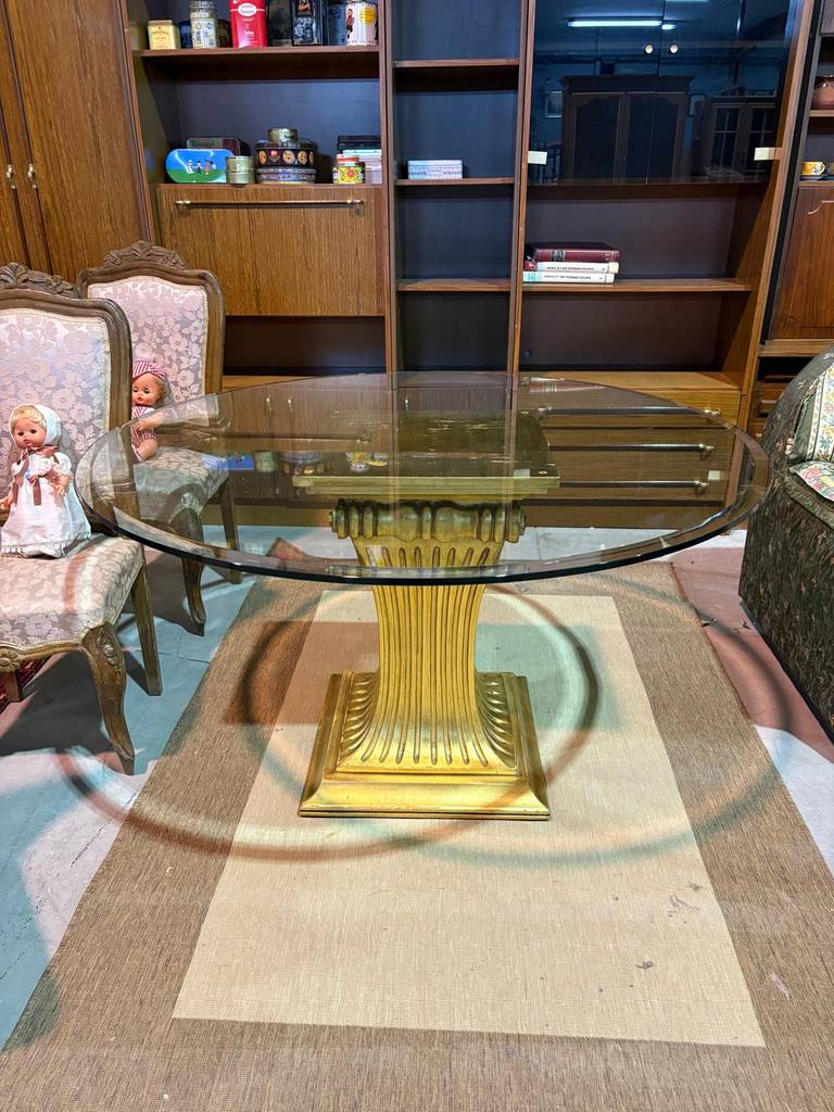 Mesa redonda muy bonita y elegante con una parte superior de un cristal grueso de buena calidad y transparente. Se asienta sobre una peana en forma de columna y de color dorado brillante. Es una mesa ideal para colocar en una sala de reuniones o en un estudio. Como podemos observar en las fotografías se encuentra en buenas condiciones y lista para ser utilizada.