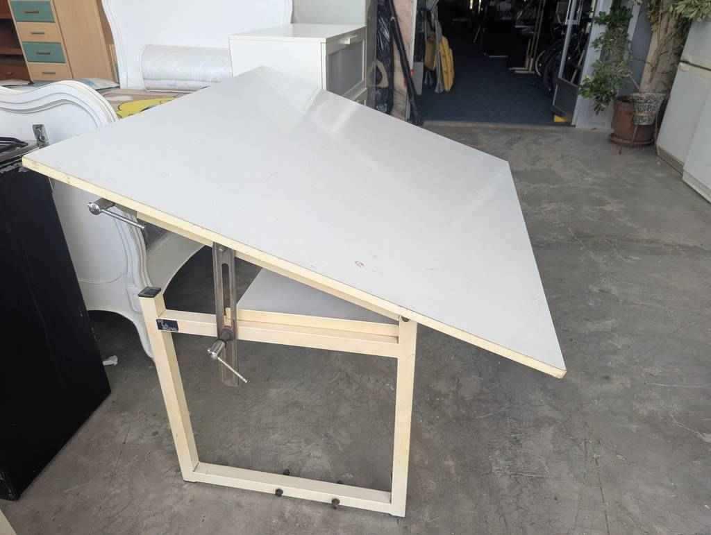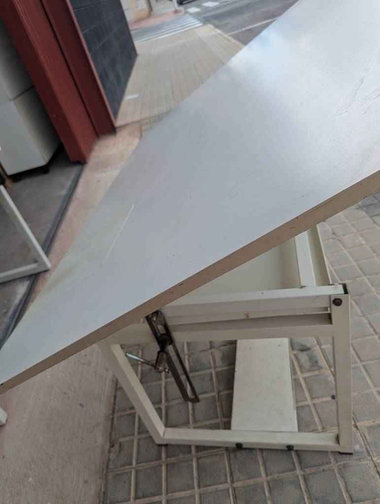 Mesa de dibujo de pequeño tamaño fabricada en madera de buena calidad de color blanco. Se trata de una mesa de dibujo que cuenta con dos patas robustas y tiene una superficie rectangular amplia que está inclinada hacia delante. Es una mesa ideal para tenerla en el hogar si te dedicas al dibujo de manera profesional. Como se puede observar en las fotografías se encuentra en buenas condiciones.