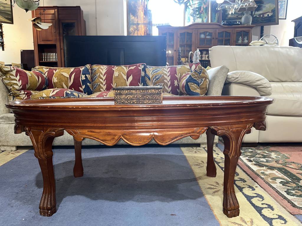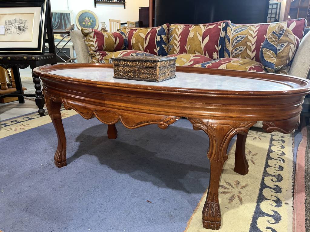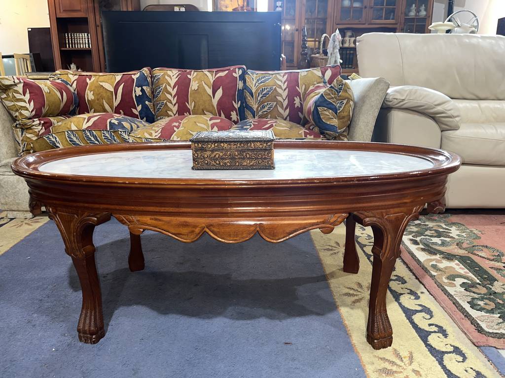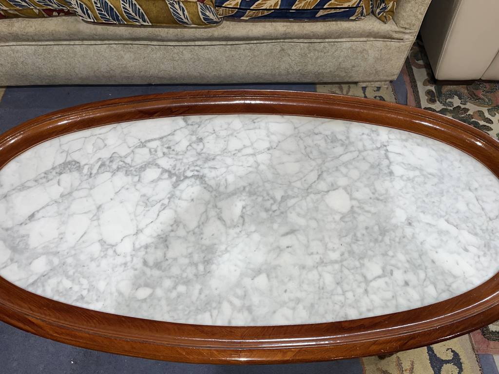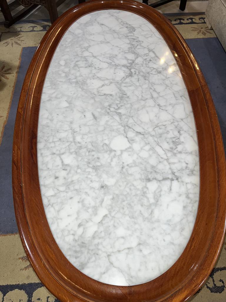 Mesa de mármol y madera de color marrón oscuro. Se trata de una mesa de mármol baja que tiene cuatro patas robustas y cuenta con una superficie ovalada y alargada. Es una mesa auxiliar o de centro que resulta perfecta para colocarla en un salón comedor enfrente de un sofá. Como se puede observar en las fotografías se encuentra en buenas condiciones.