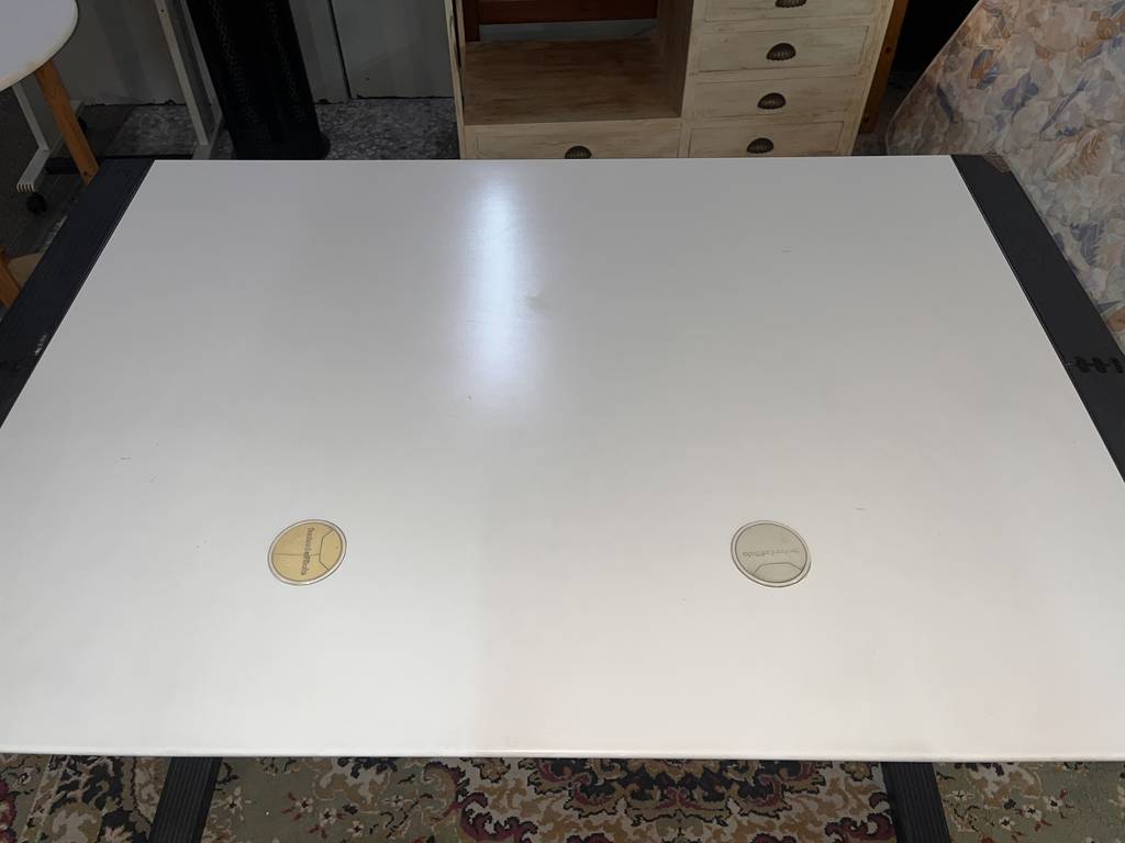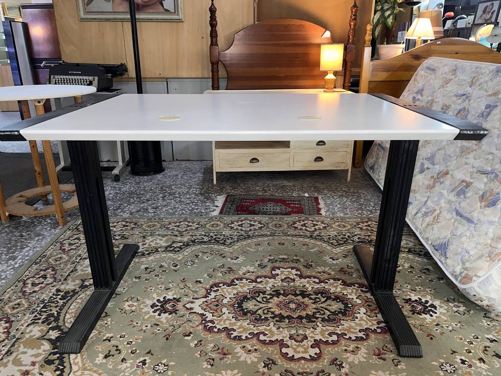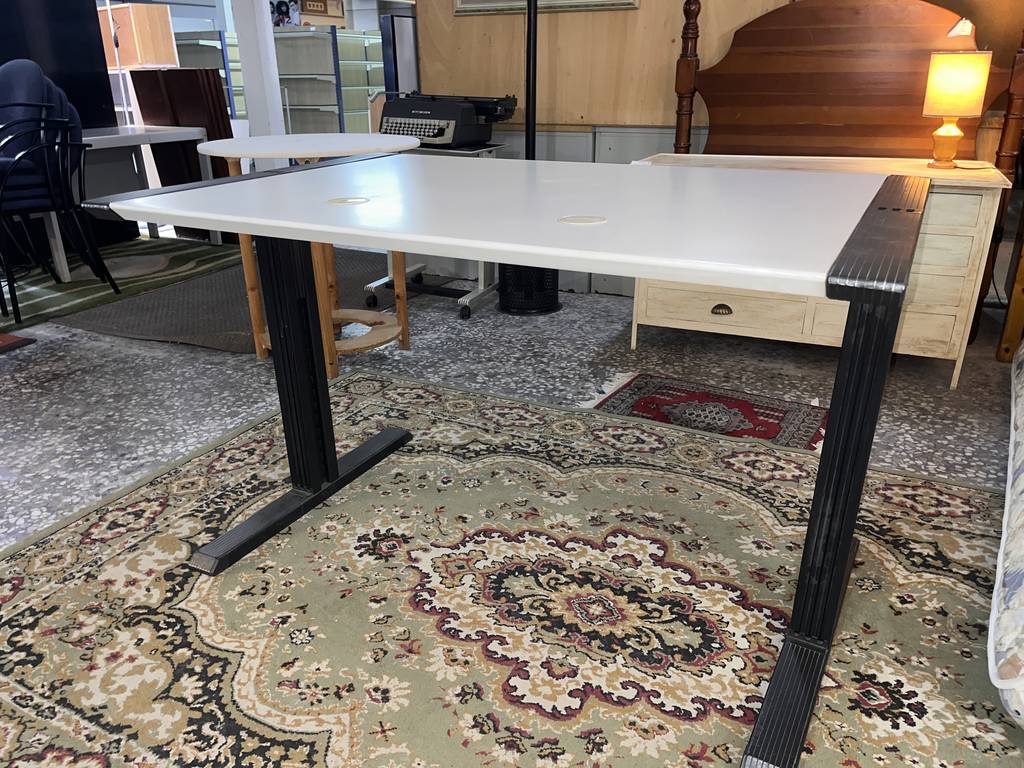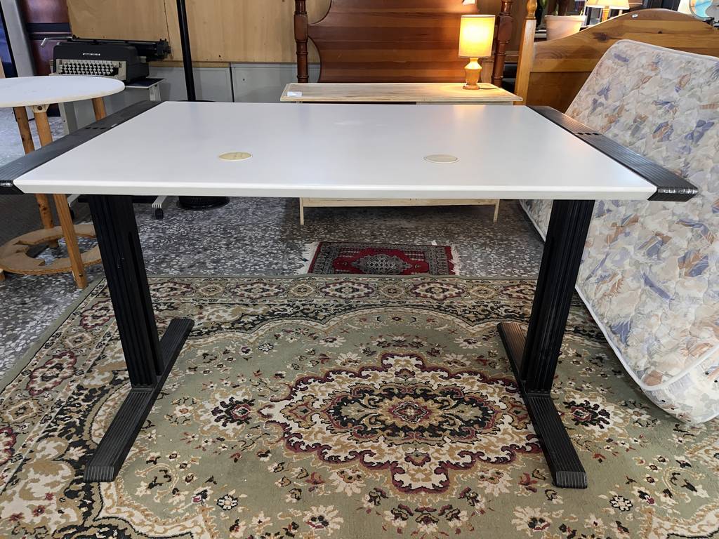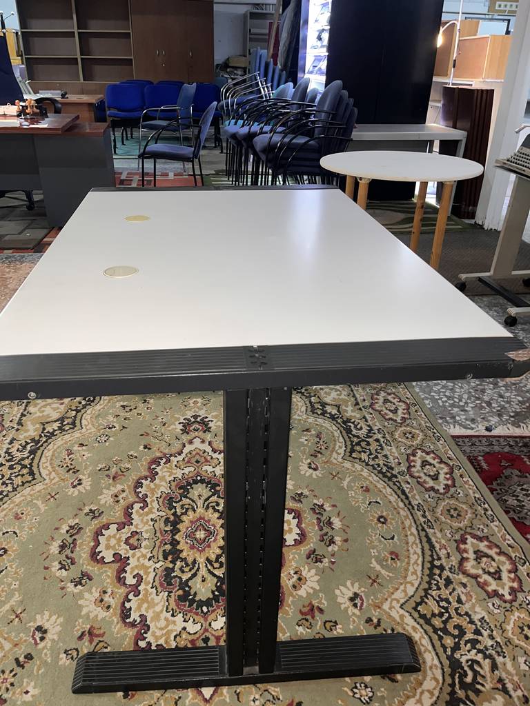 Mesa de oficina de tamaño medio con una base superior en color blanco y con dos huecos pasa cables para aportar un diseño estético sobrio. Su base de dos patas grandes en negro la hace una mesa estable y duradera. Es una mesa ideal para colocar en una recepción o despacho, por ejemplo. Como podemos observar en las fotografías se encuentra en buenas condiciones.