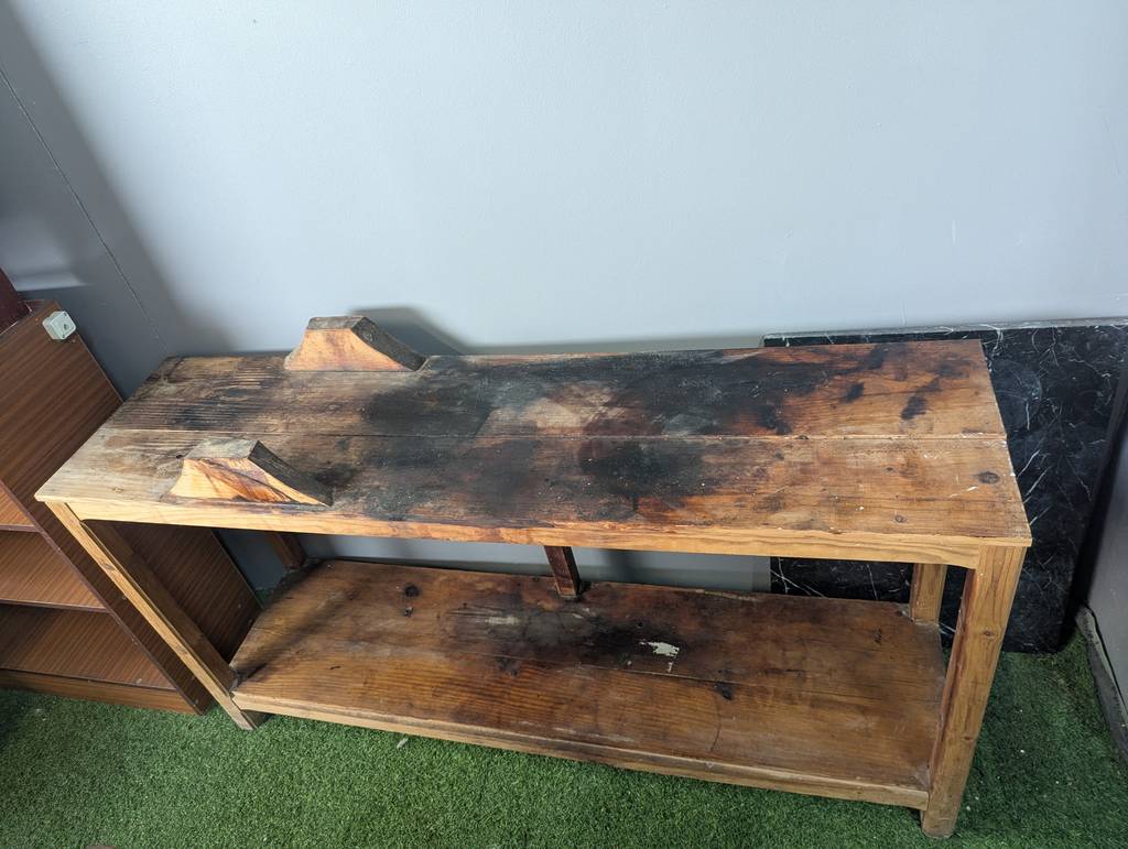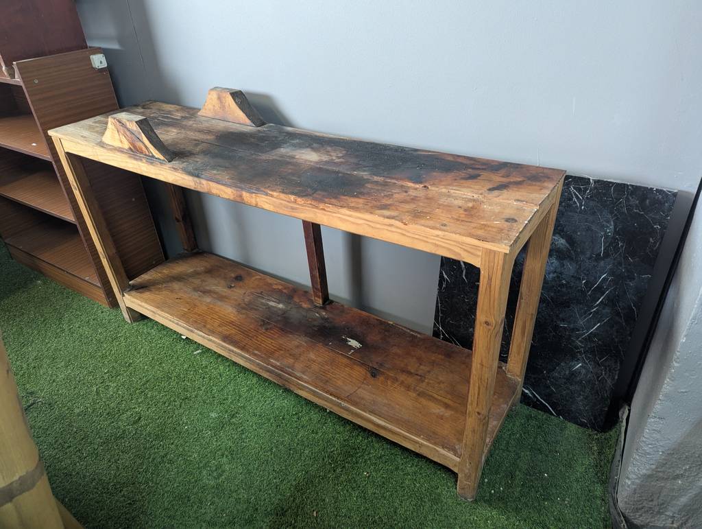 Mesa de taller fabricada en madera de buena calidad de color marrón oscuro. Se trata de una mesa de taller que cuenta con dos superficies alargadas y rectangulares y tiene cuatro patas resistentes. Es una mesa ideal para tenerla en un taller para realizar trabajos manuales. Como se puede observar en las fotografías la mesa se encuentra algo desgastada por el uso pero cumple su función correctamente.