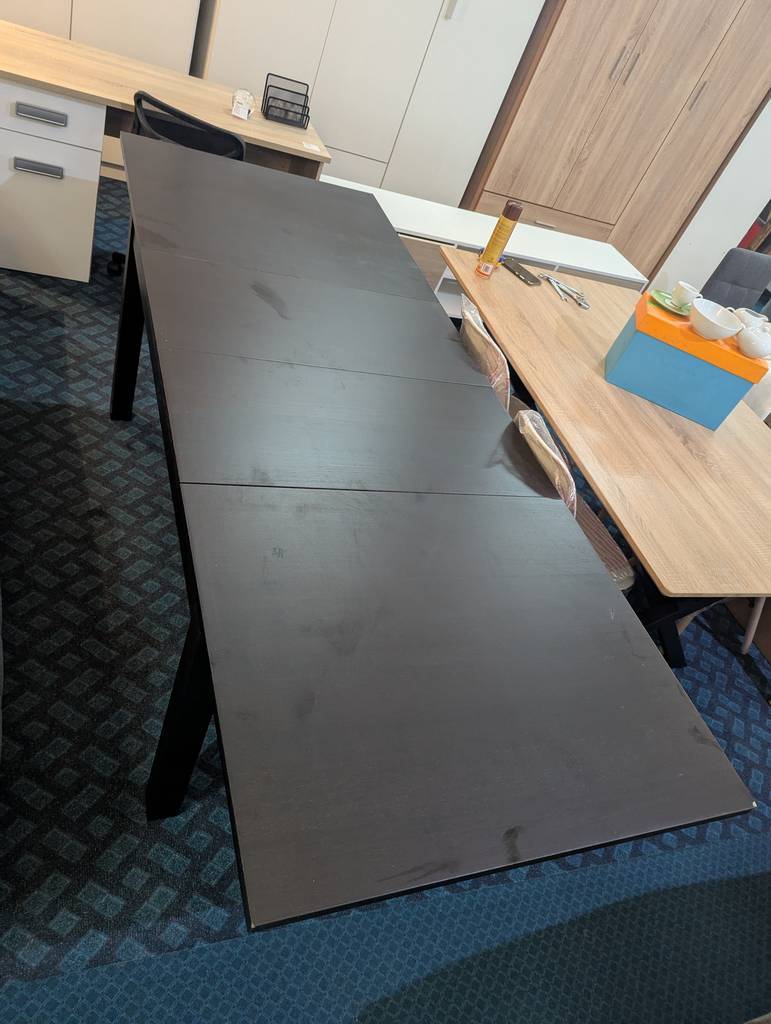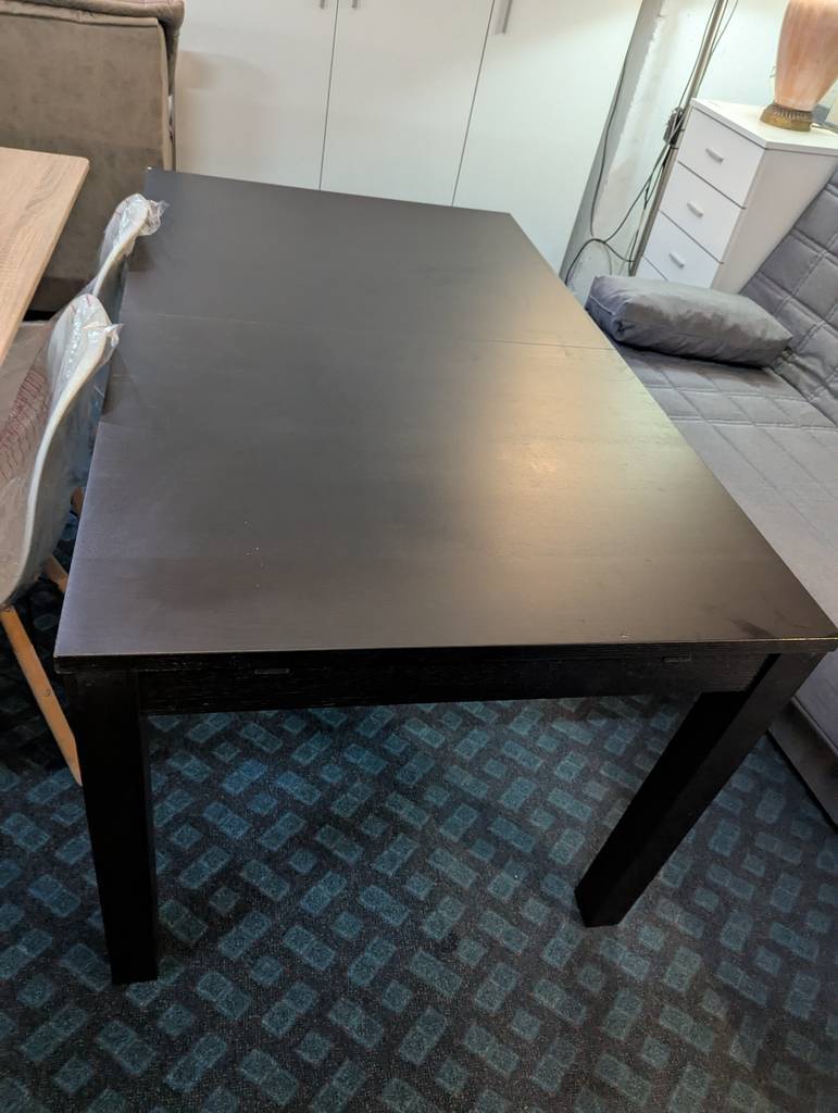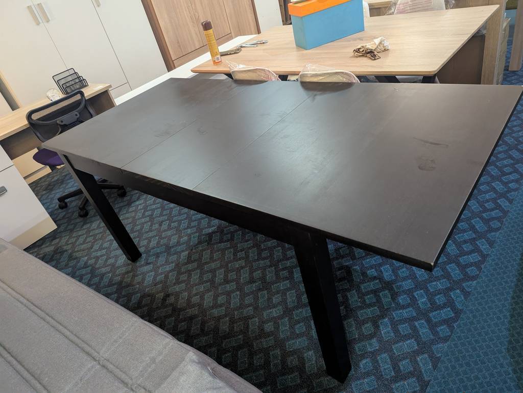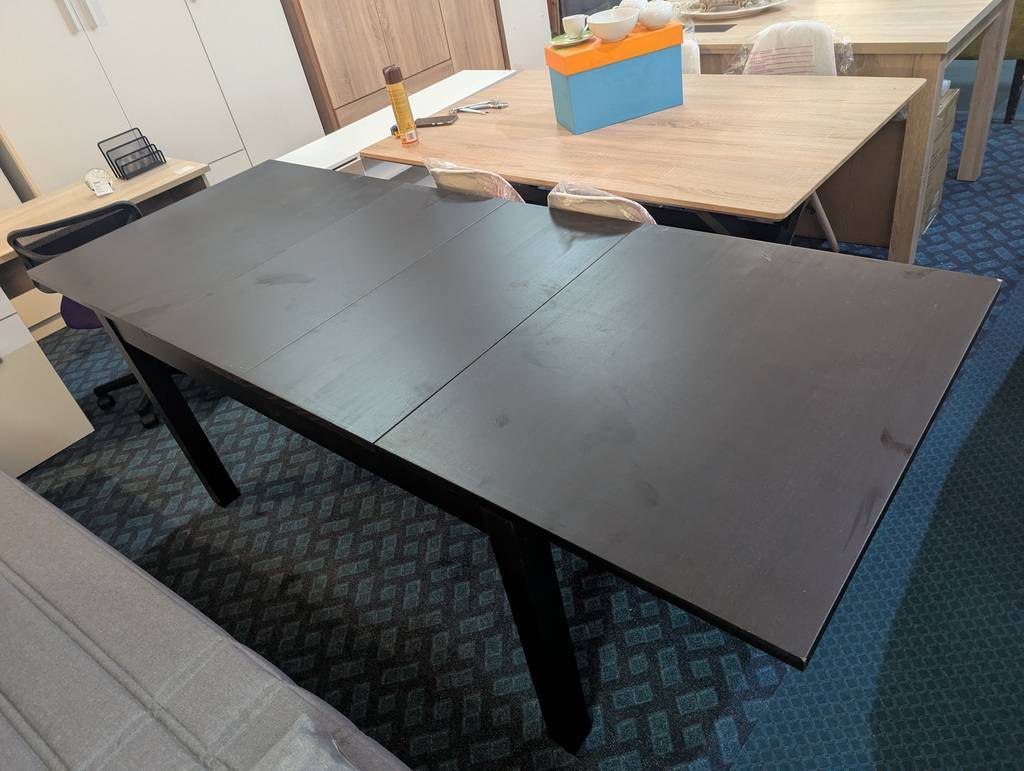 Mesa extensible fabricada en madera de buena calidad de color negro. Se trata de una mesa nueva que tiene una pequeña tara y se abre en tres secciones distintas. Es una mesa de gran tamaño que resulta ideal para colocarla en un salón comedor de estilo moderno para una familia numerosa. Como se puede observar en las fotografías se encuentra en buenas condiciones.