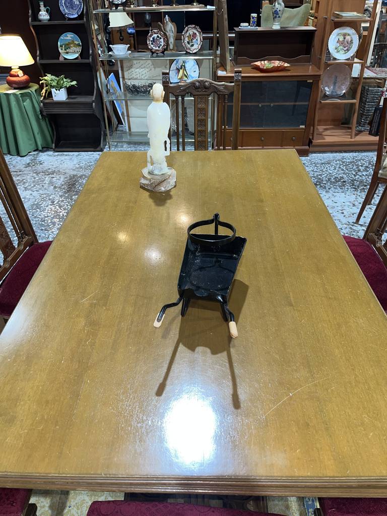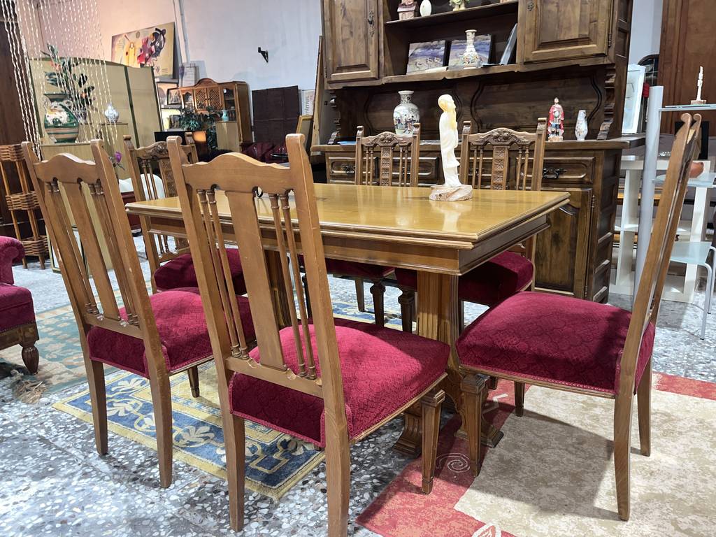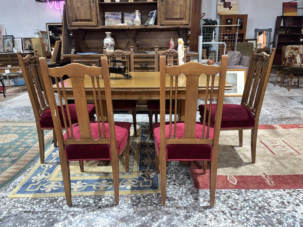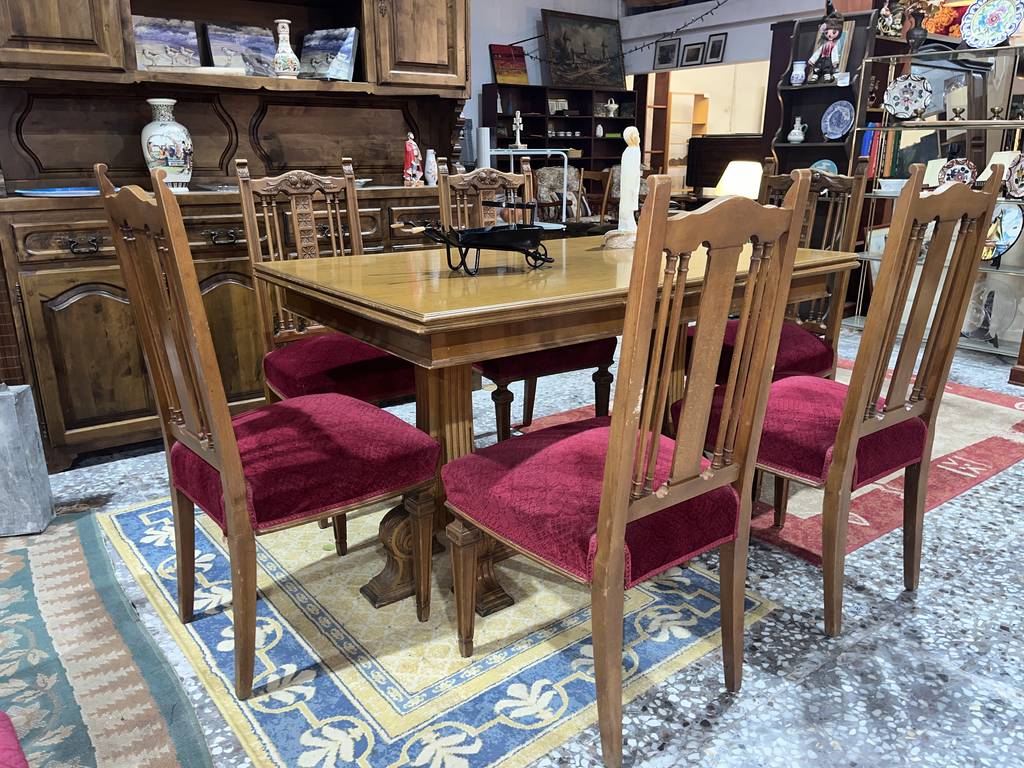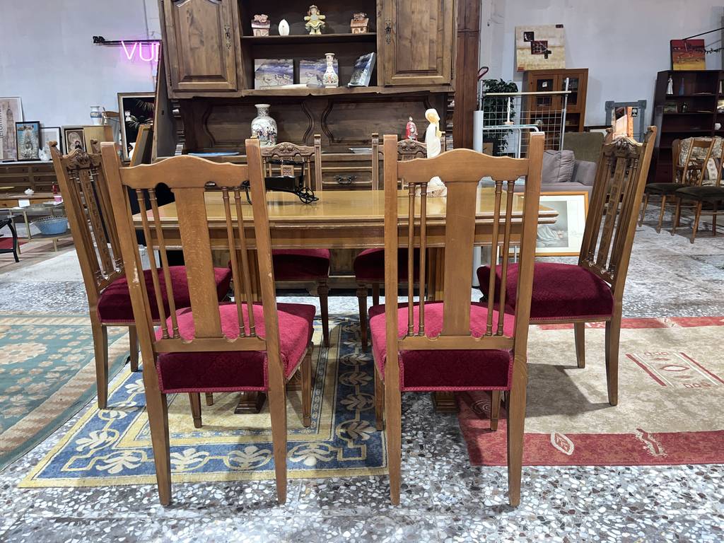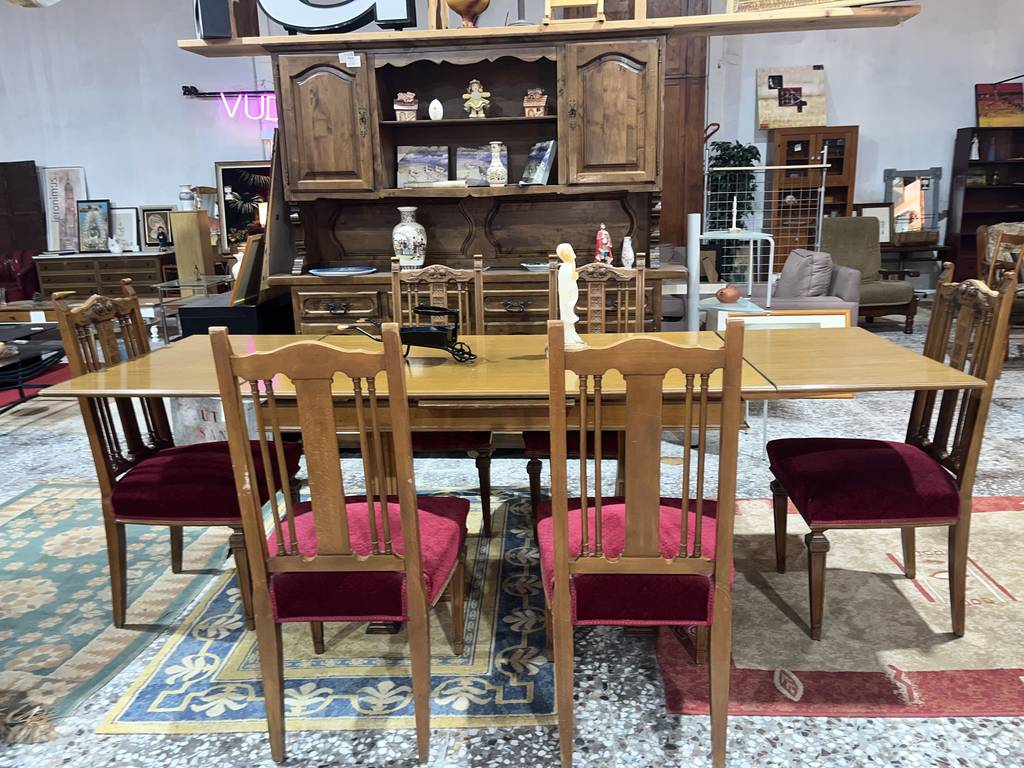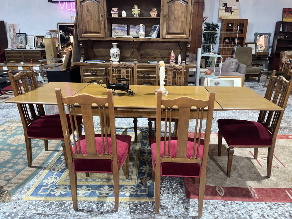 Conjunto compuesto por una mesa y 6 sillas. La mesa incluida es extensible y podemos convertirla en una gran mesa de comedor con dos baldas adheridas en los laterales. Las sillas incorporan unos asientos con un tapizado burdeos muy suave y agradable al tacto. Es un conjunto ideal para colocar en un salón comedor. Como podemos observar en las fotografías se encuentra en buenas condiciones.