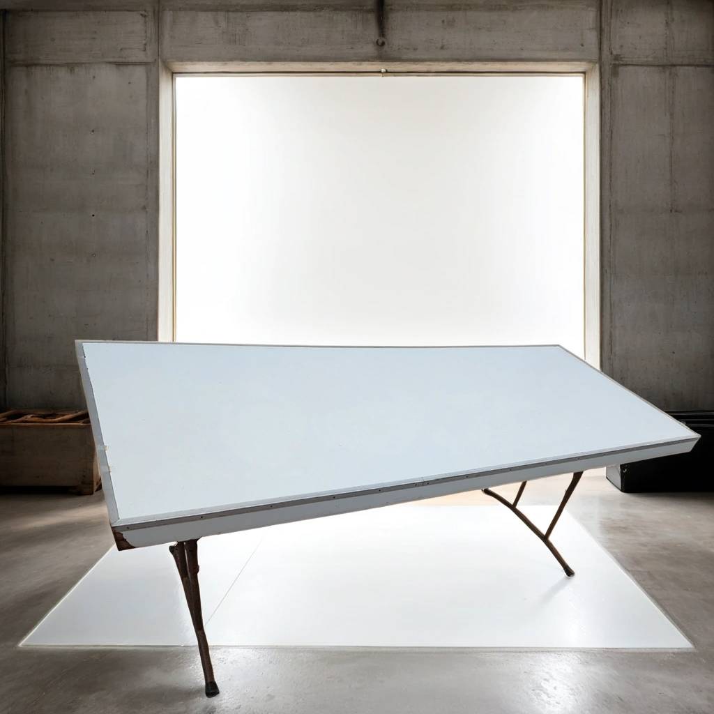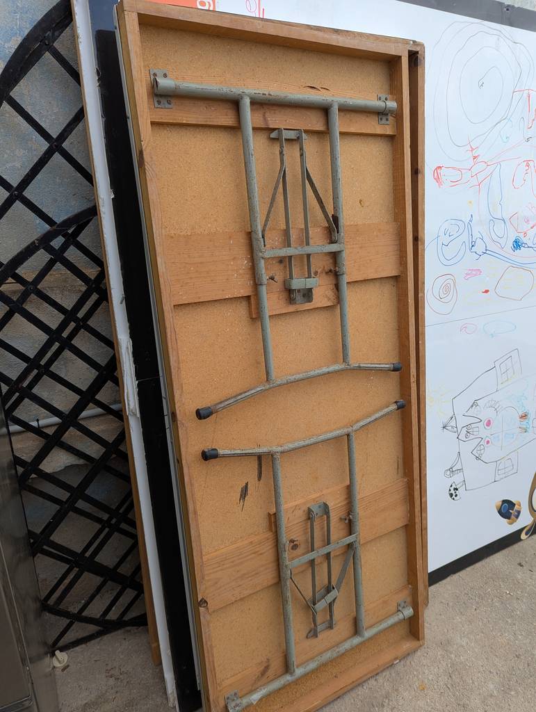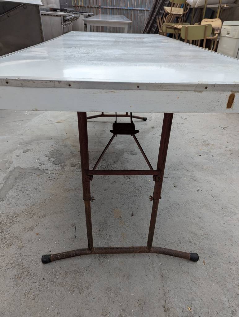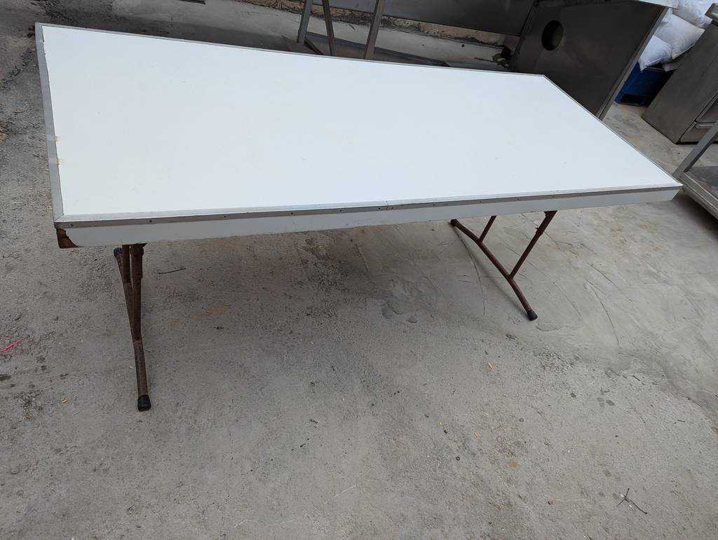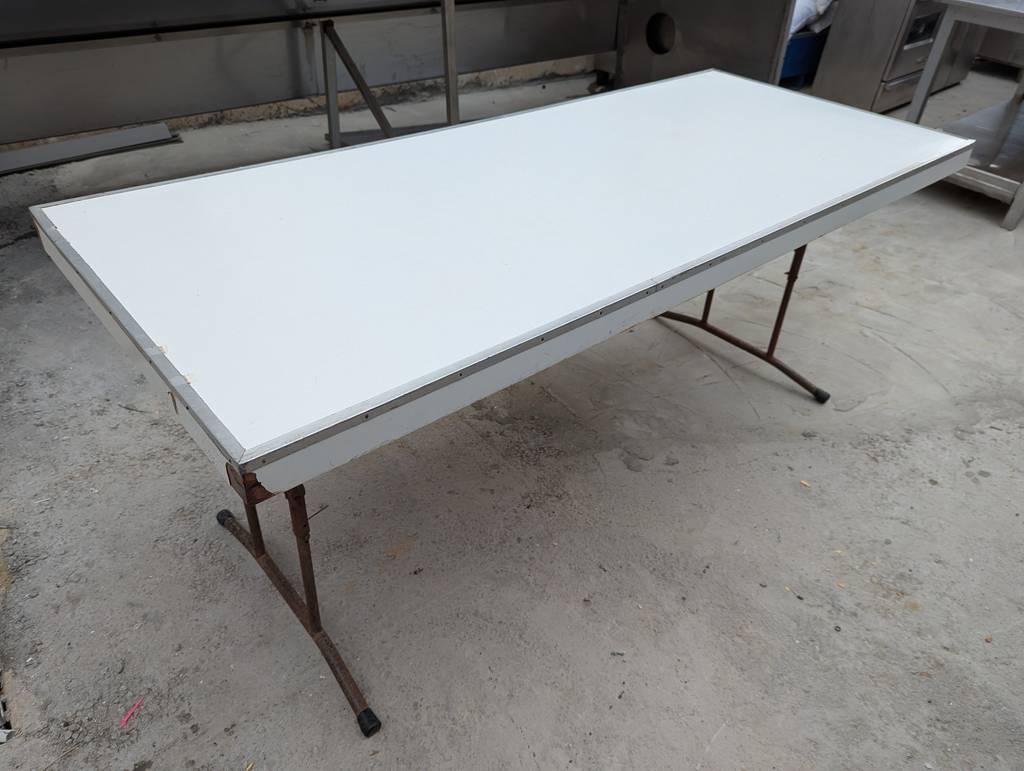 Mesa para catering de grandes dimensiones que se compone de un tablón grueso superior en color blanco y dos patas dobles en los laterales. Es una mesa que podemos plegar fácilmente para no ocupar mucho espacio cuando no la utilicemos. Puede ser utilizada para empresas de catering aunque también puede ser utilizada para celebraciones personales con mucha afluencia de gente. Como podemos observar en las fotografías se encuentra en buenas condiciones.