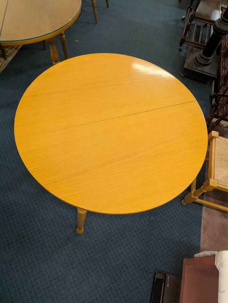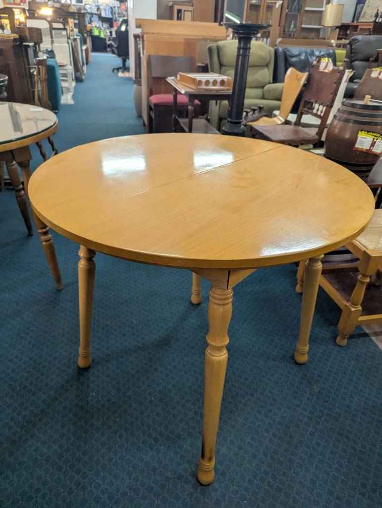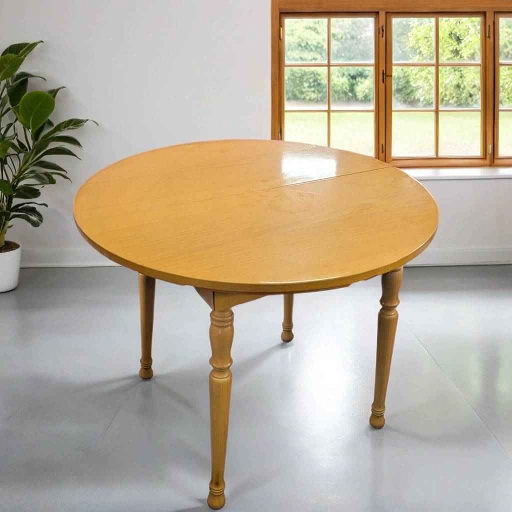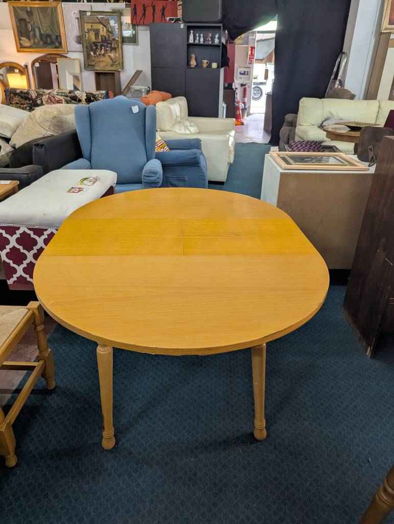 Mesa redonda extensible fabricada en madera de buena calidad de color marrón claro. Se trata de una mesa redonda que es extensible, por lo que aumenta de tamaño. Es una mesa ideal para colocarla tanto en una cocina como en un salón comedor para que se siente alrededor a comer una familia entera. Como se puede observar en las fotografías se encuentra en buenas condiciones.