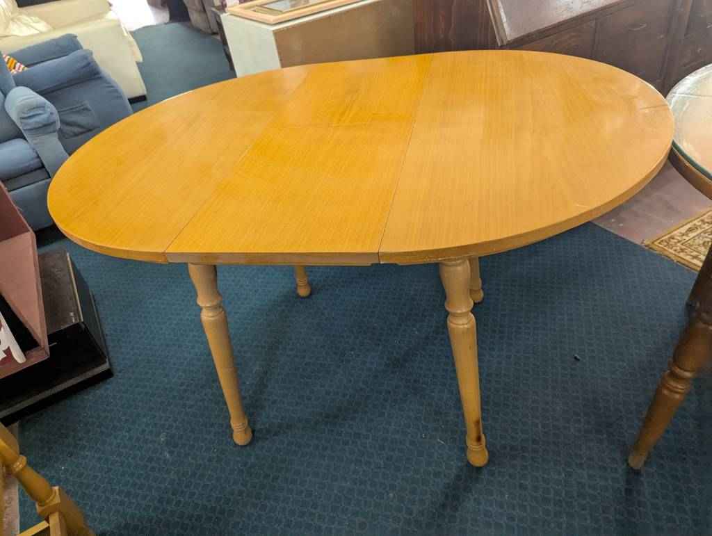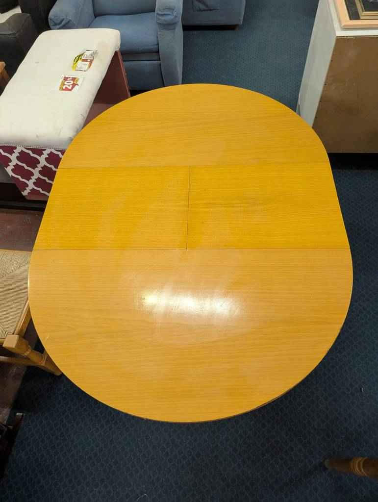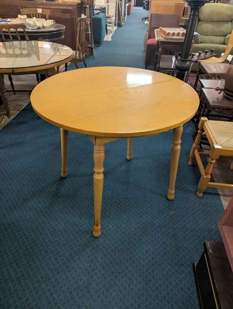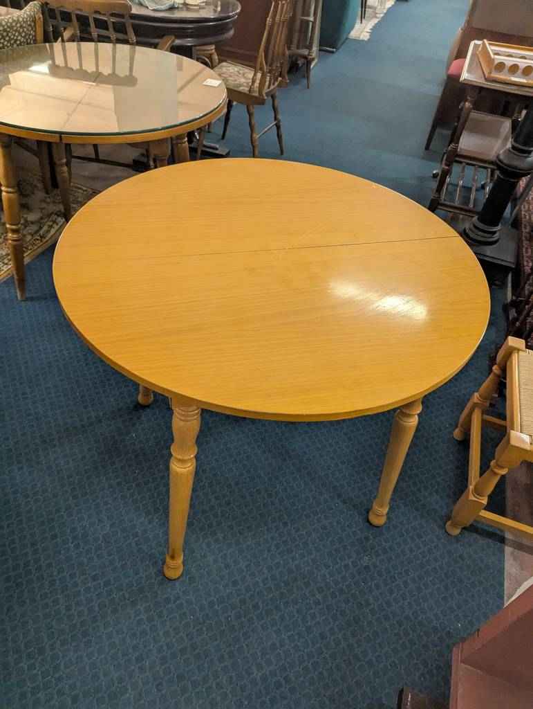 Mesa redonda extensible fabricada en madera de buena calidad de color marrón claro. Se trata de una mesa redonda que es extensible, por lo que aumenta de tamaño. Es una mesa ideal para colocarla tanto en una cocina como en un salón comedor para que se siente alrededor a comer una familia entera. Como se puede observar en las fotografías se encuentra en buenas condiciones.
