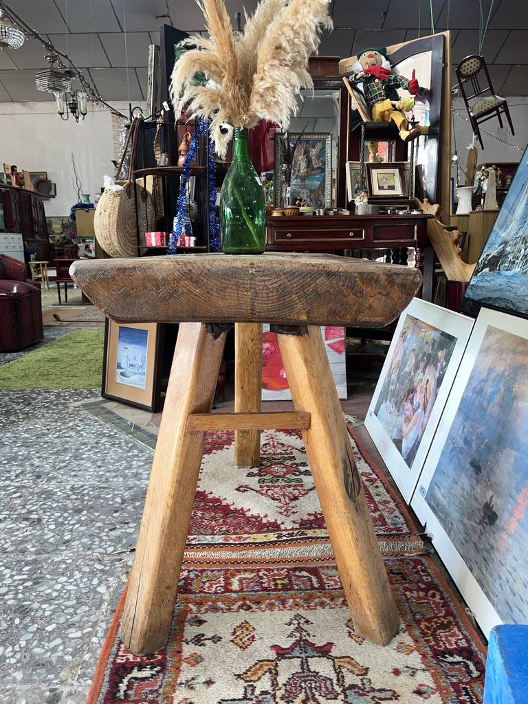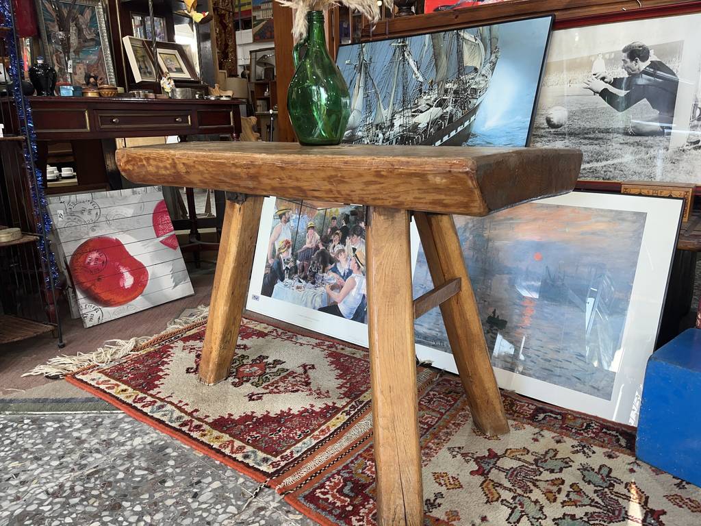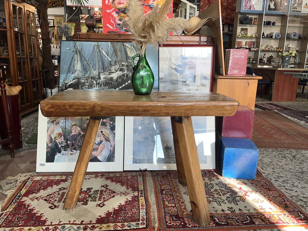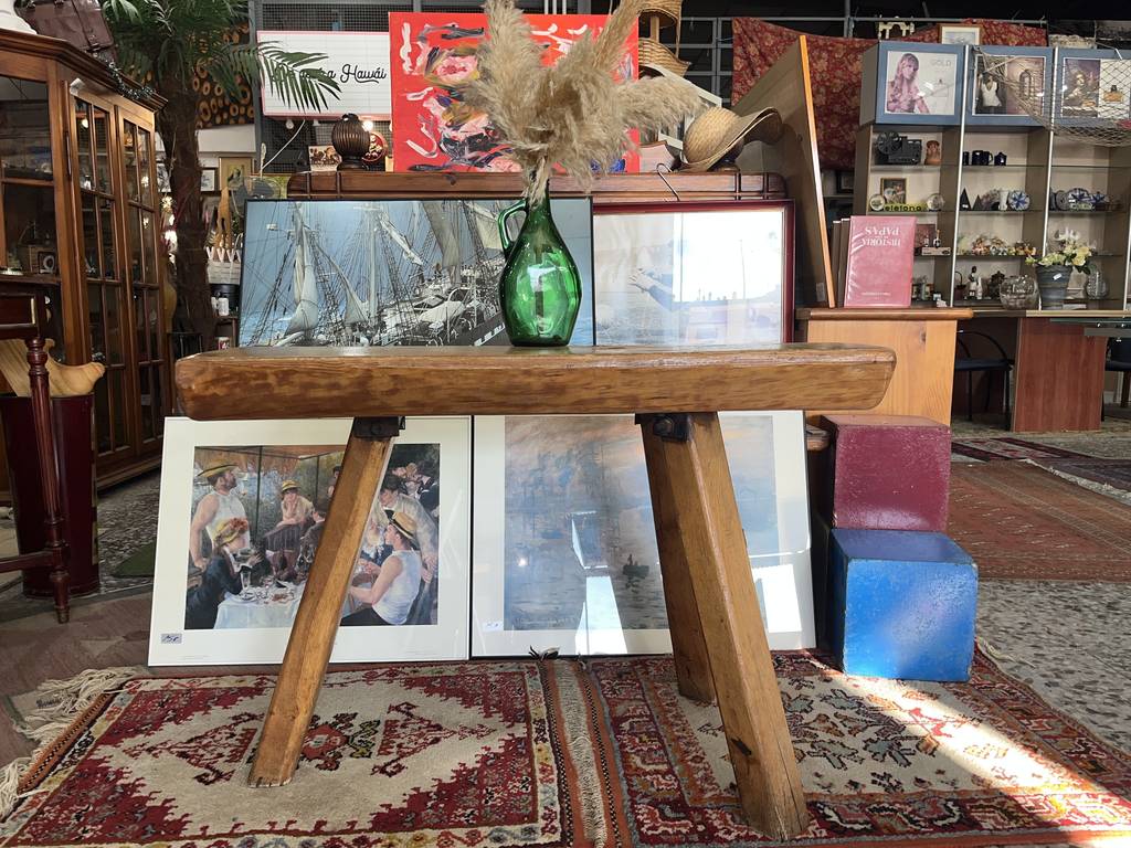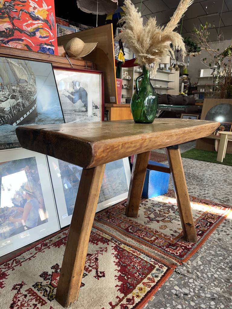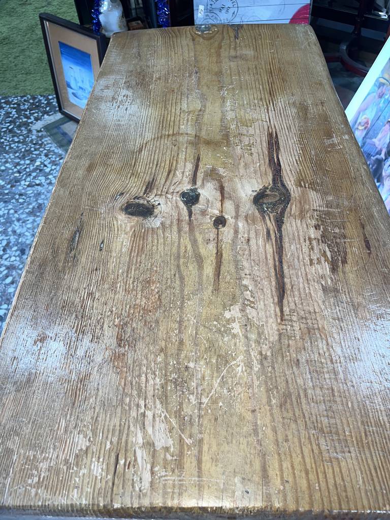 Mesa de estilo rústico que ha sido fabricada con madera de buena calidad y robusta. Se trata de una mesa muy estable con dos patas en un lateral unidas por un listón de madera y otra gruesa pata en el otro lado. Es ideal para colocarla como recibidor, por ejemplo, o también en un salón comedor. Como podemos observar en las fotografías presenta desperfectos.