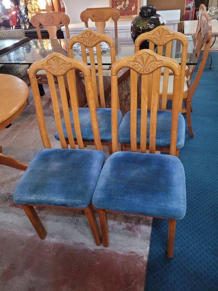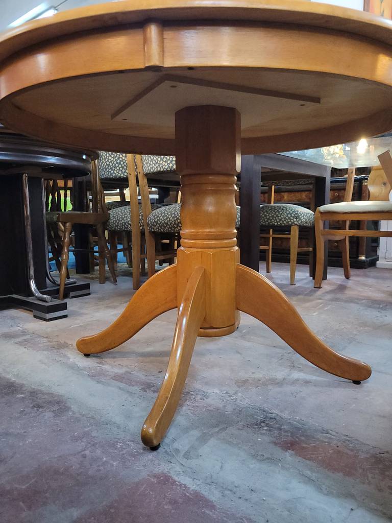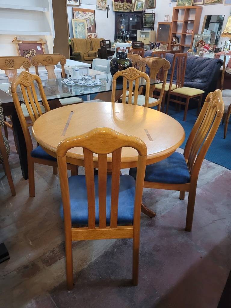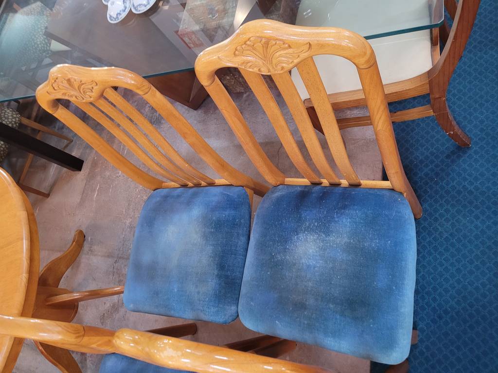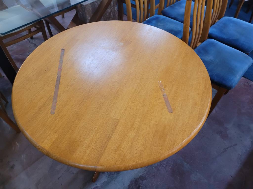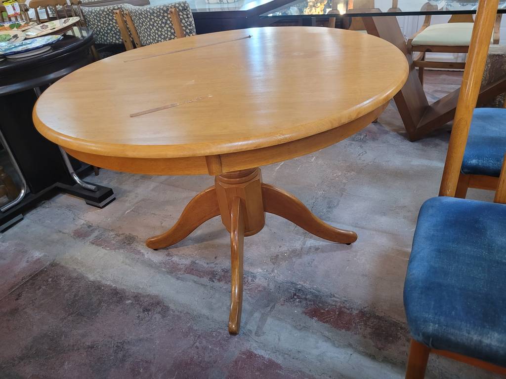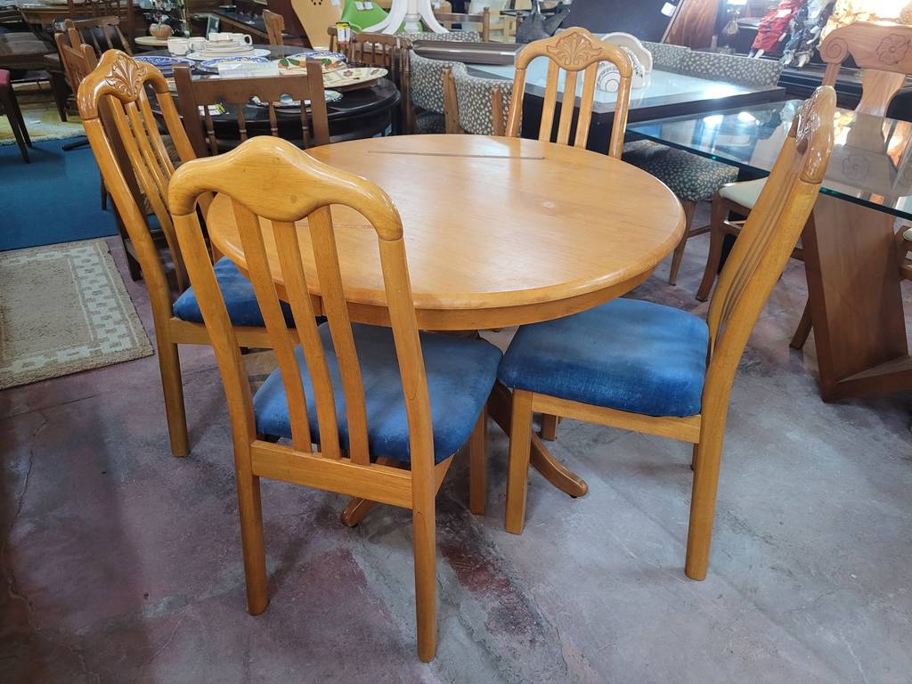 Conjunto formado por una mesa redonda y cuatro sillas, todo ello fabricado en madera de buena calidad y robusta de color marrón claro. Se trata de una mesa redonda que va acompañada de cuatro sillas que tienen el asiento tapizado de un bonito color azul. Es un conjunto ideal para colocarlo en un salón comedor. Como se puede observar en las fotografías se encuentra en buenas condiciones.