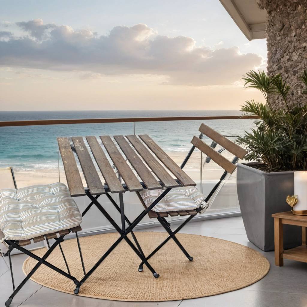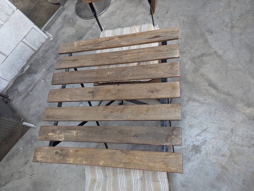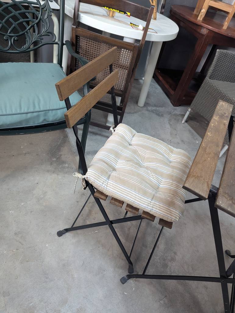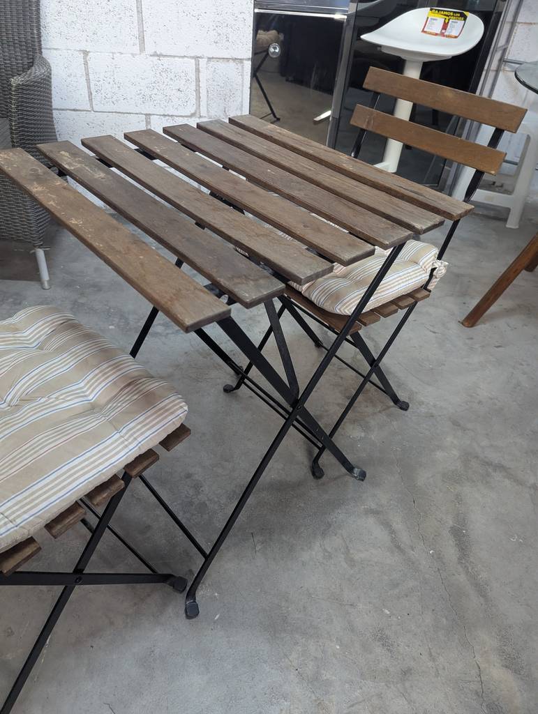 Mesa y dos sillas de madera y forja de la famosa tienda de muebles sueca Ikea. Se trata de una mesa cuyas patas son de forja y tiene una superficie formada por la unión de varios listones de madera que va acompañada por dos sillas. Es un conjunto ideal para colocarlo en una zona exterior del hogar como un patio o un jardín. Como se puede observar en las fotografías se encuentran en buenas condiciones.