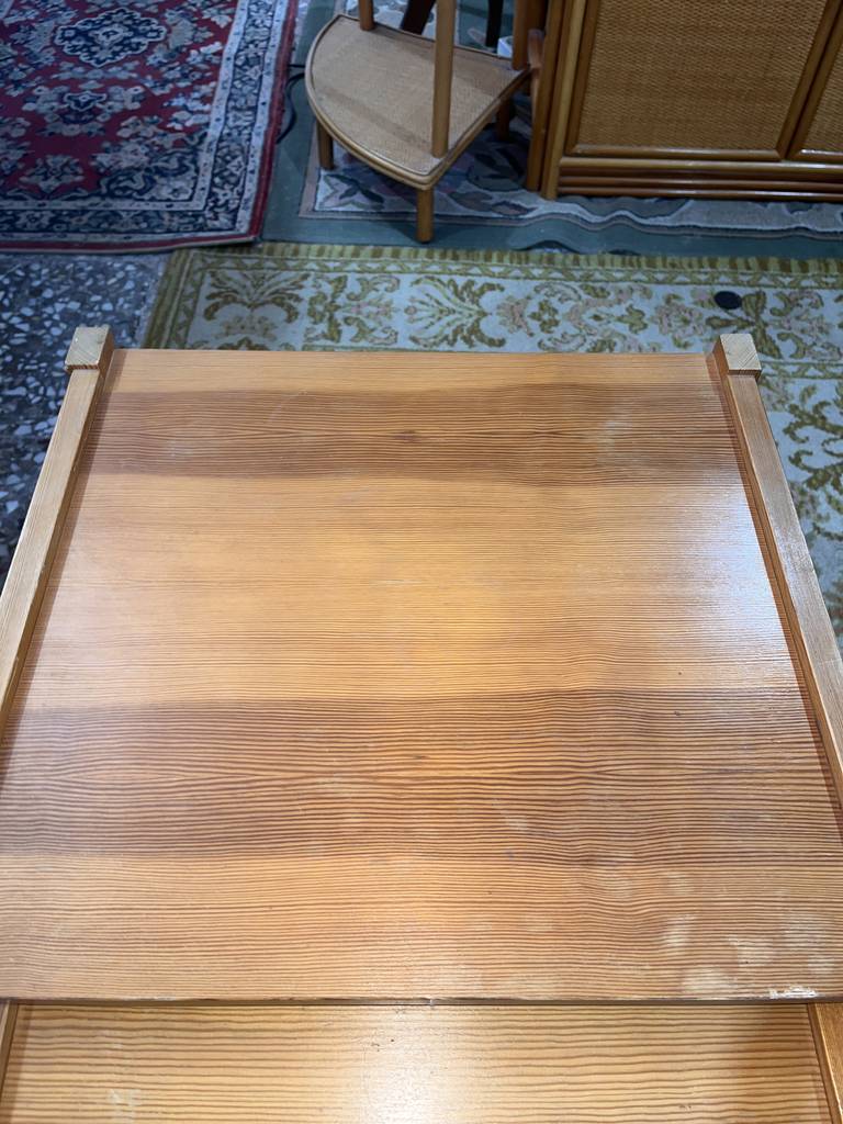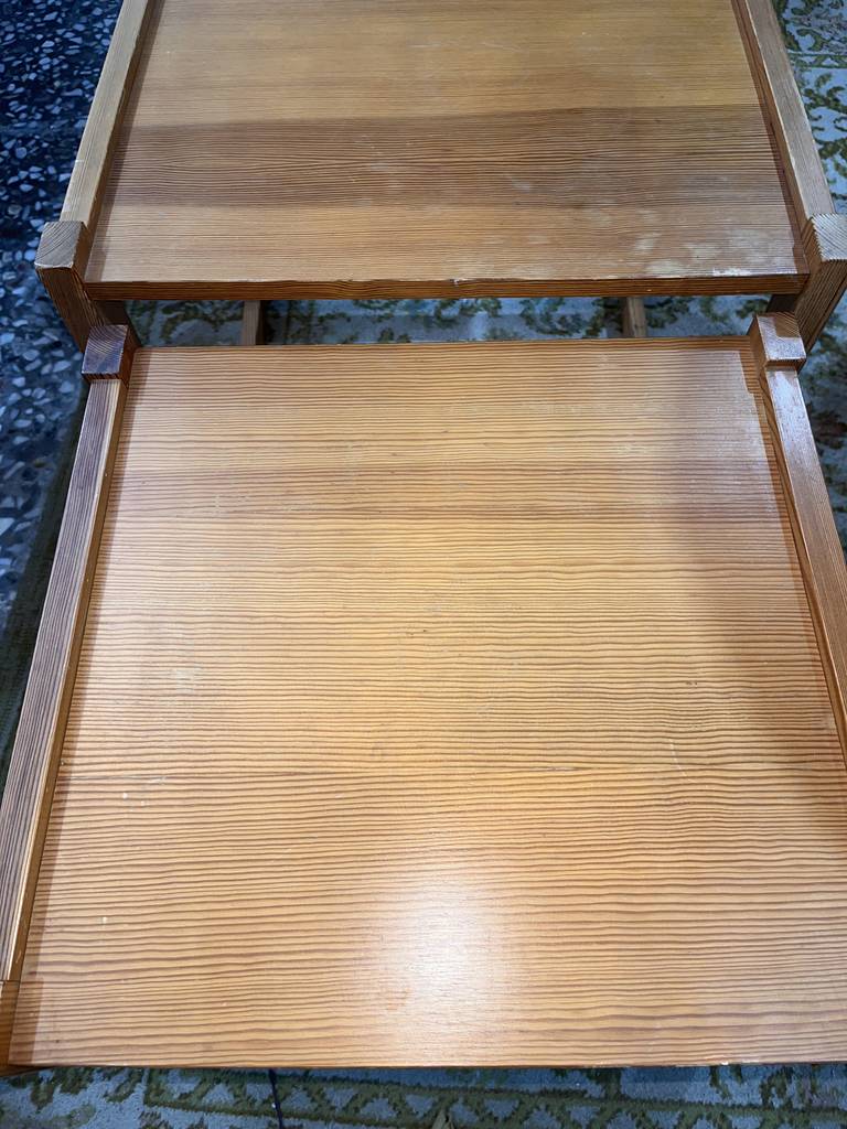 Pareja formada por dos mesas nido fabricadas en madera de buena calidad de color marrón claro. Se trata de dos mesas, una grande y la otra más pequeña, que se pueden guardar metiendo la pequeña dentro de la grande, por lo que ocupan poco espacio. Son dos mesas perfectas para colocarlas en un salón comedor y tenerlas como mesas auxiliares. Como se puede observar en las fotografías se encuentran en buenas condiciones.