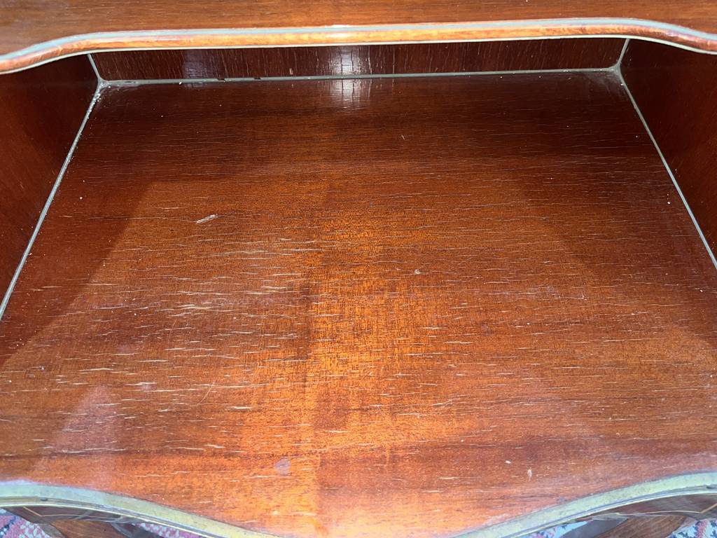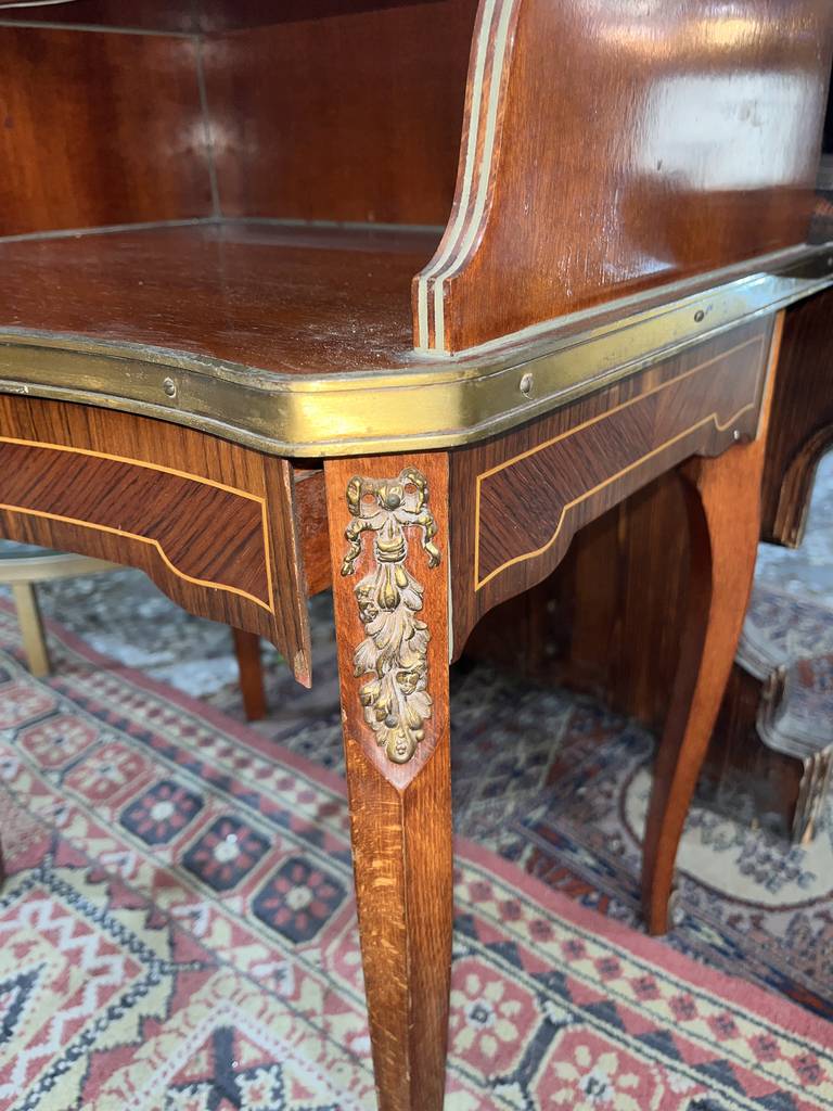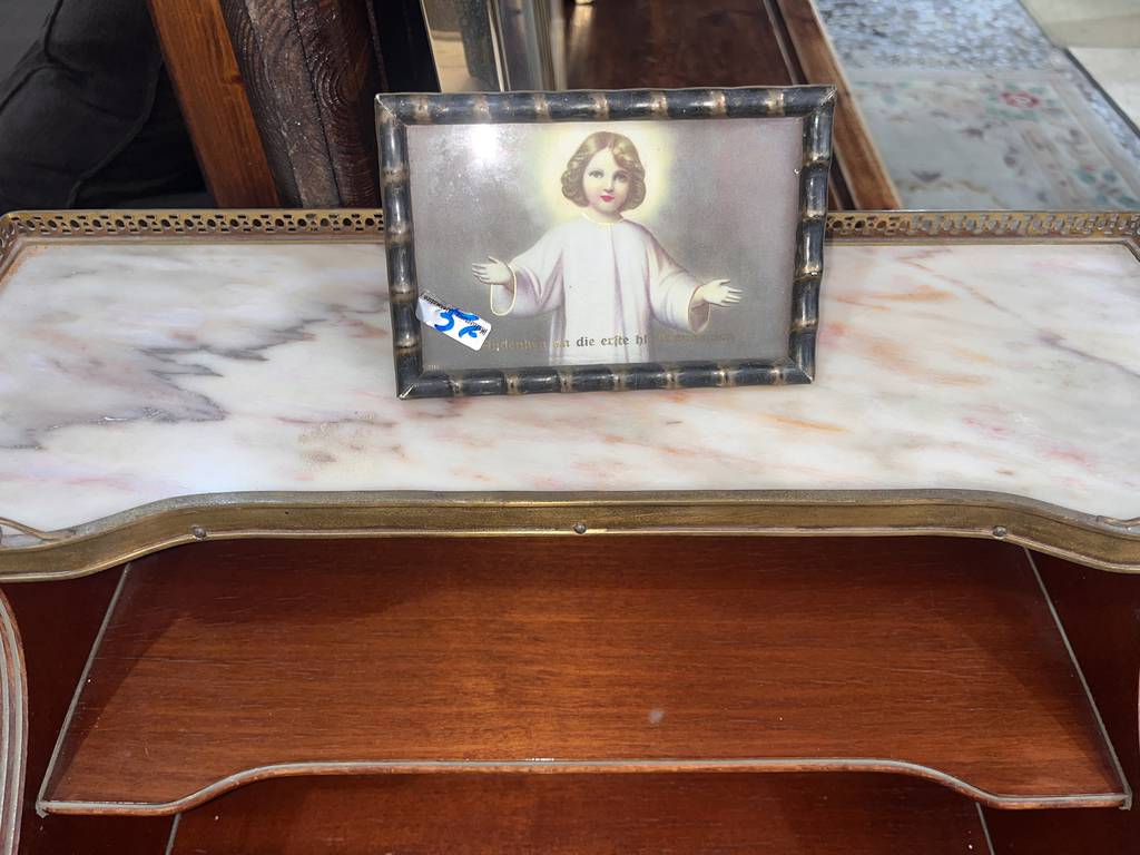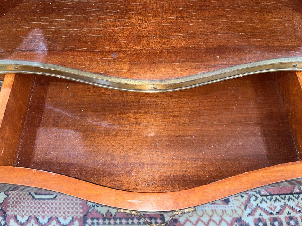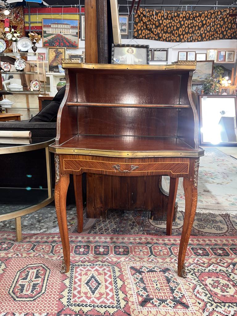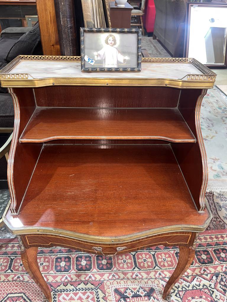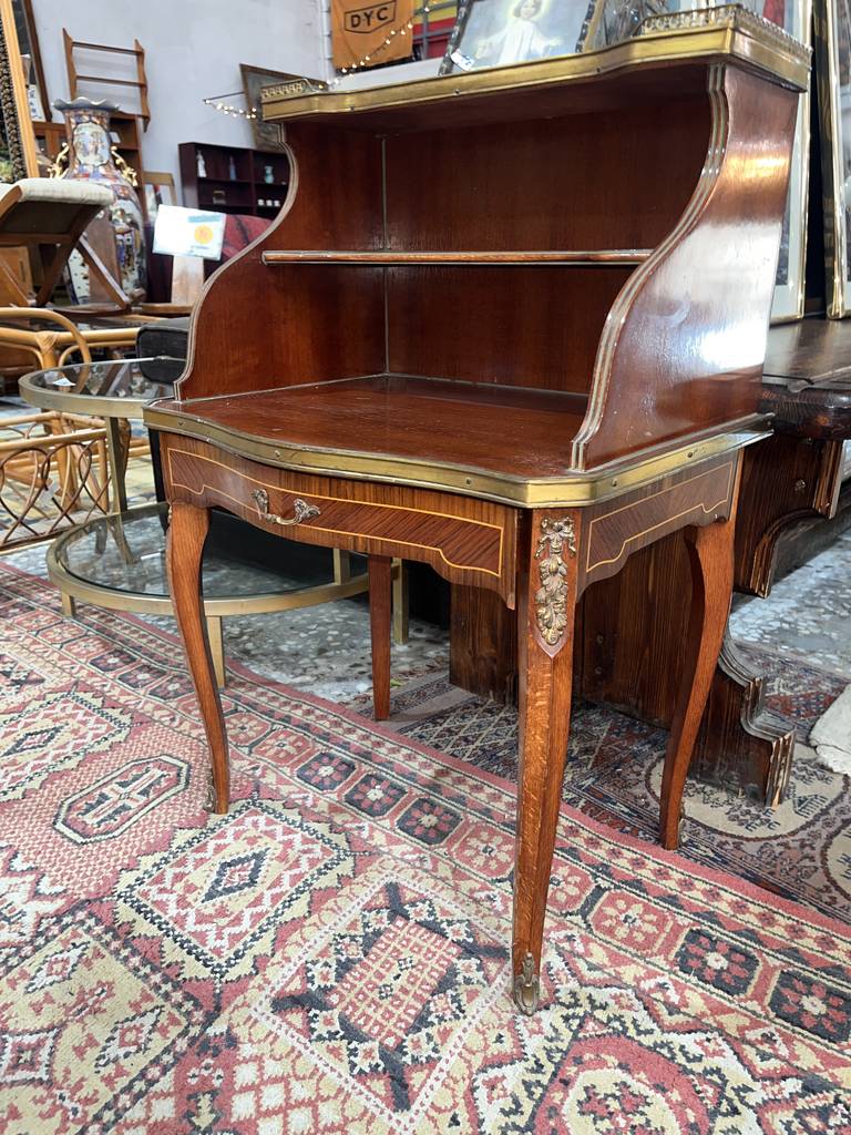 Mesita auxiliar de estilo clásico muy bonita y elegante que ha sido fabricada con madera de buena calidad y robusta. Se compone de dos habitáculos abiertos superiores en alto y con un cajón frontal. Es una mesita única con bonitos detalles realizados con gran precisión y finos bordes en color dorado. Como podemos observar en las fotografías presenta desperfectos.