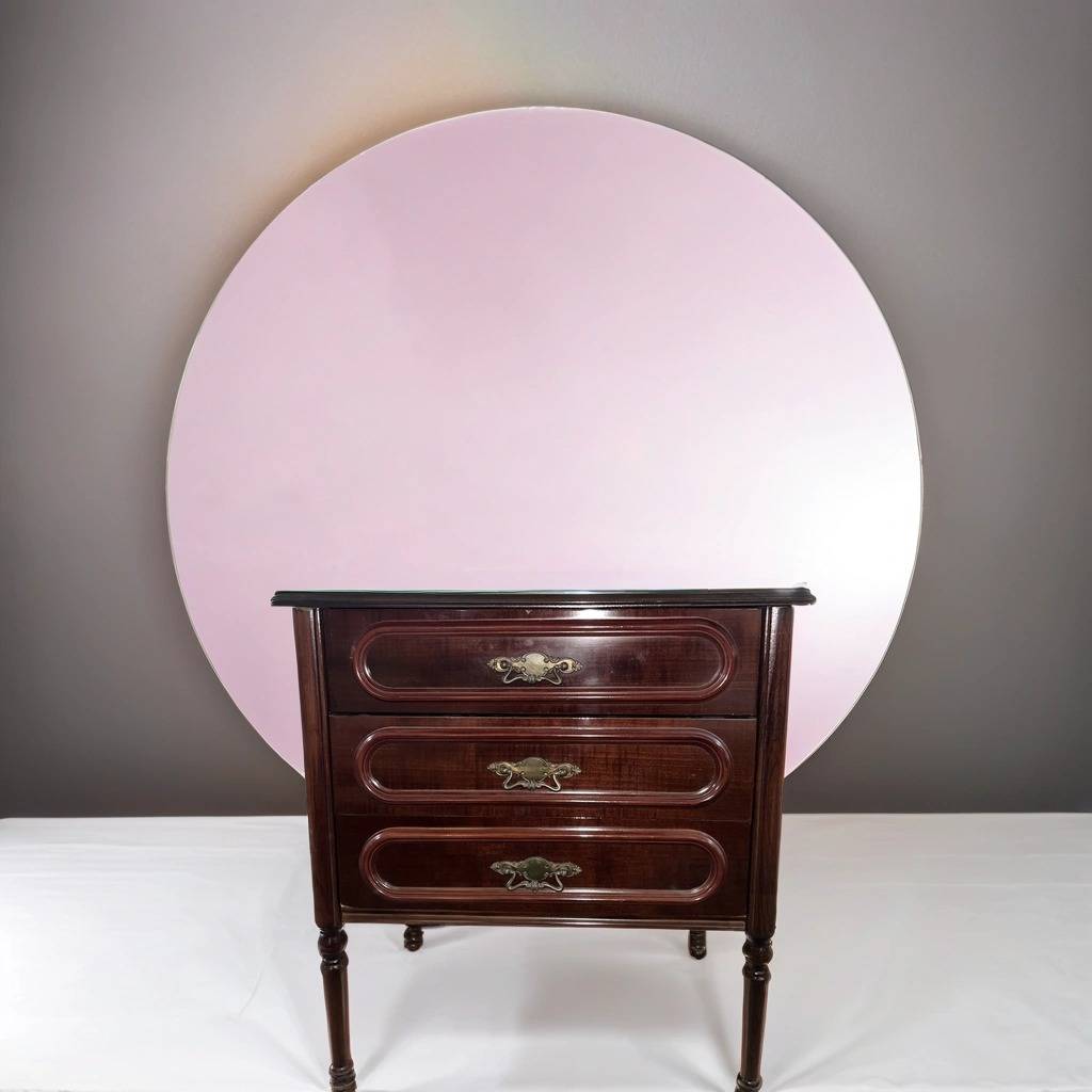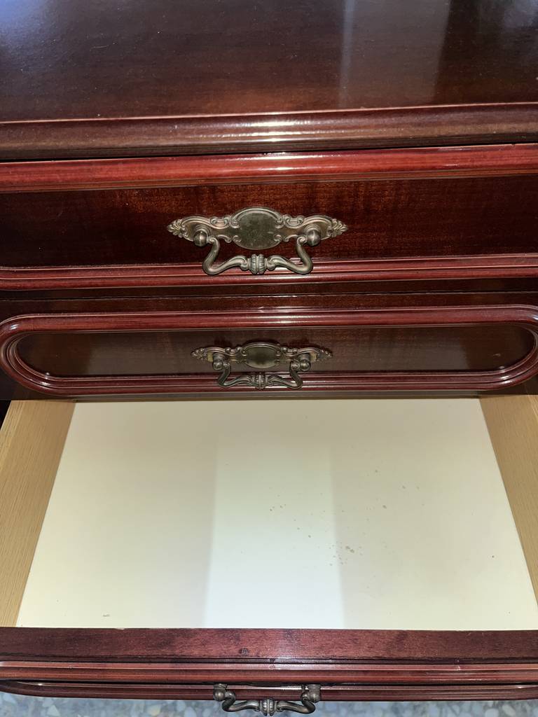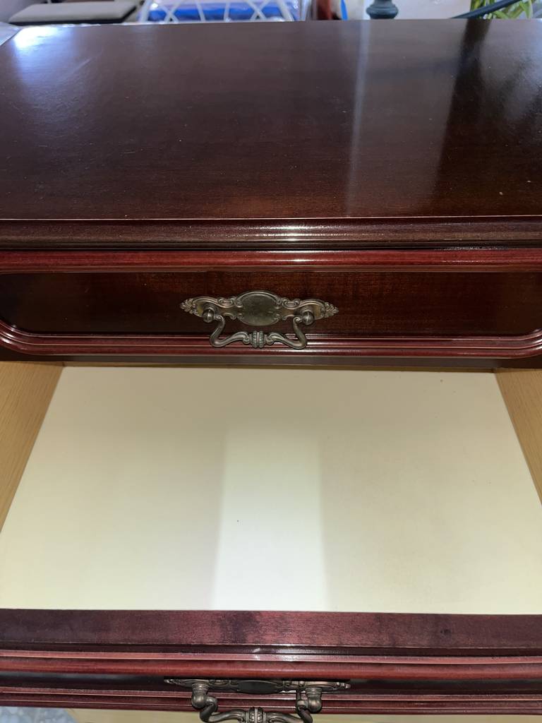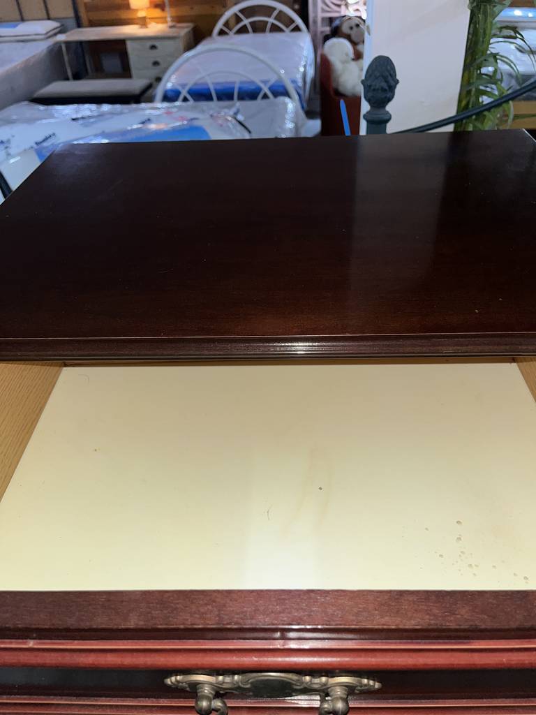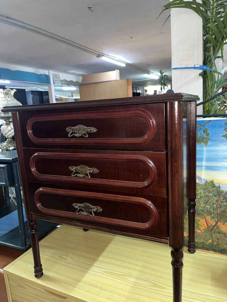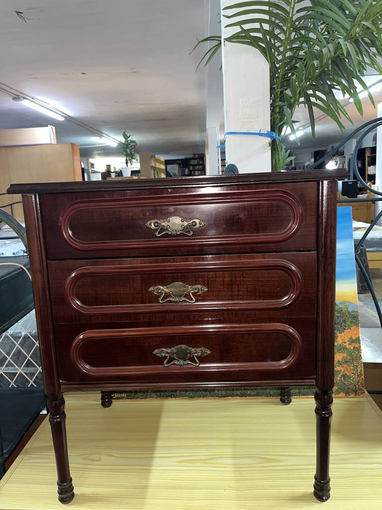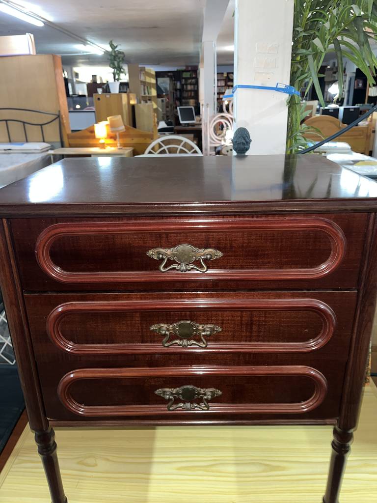Mesita de estilo clásico y elegante que ha sido fabricada en madera de buena calidad y robusta. En color caoba oscuro está bonita mesita está compuesta por una parte frontal con tres cajones con tiradores metálicos incorporados. Es una mesita ideal para colocar en un dormitorio. Como podemos observar en las fotografías se encuentra en buenas dimensiones.