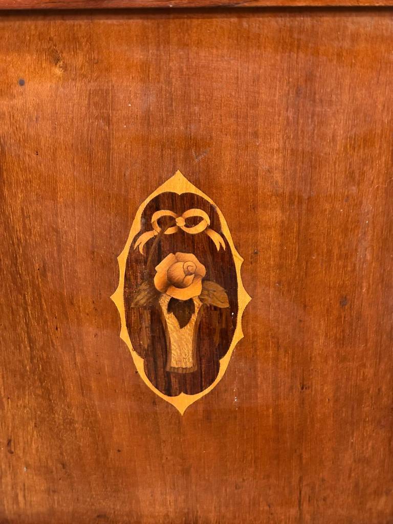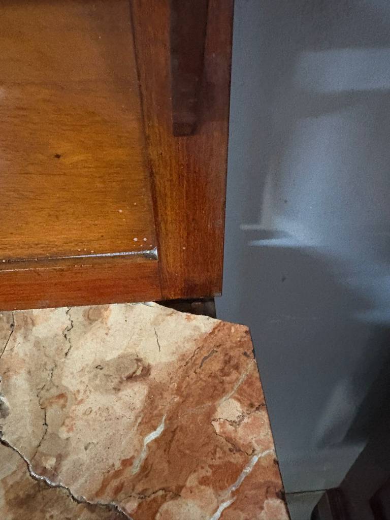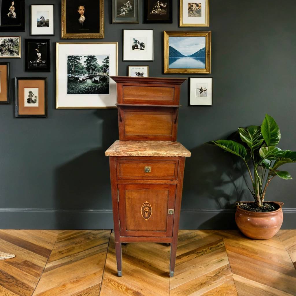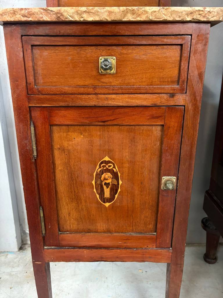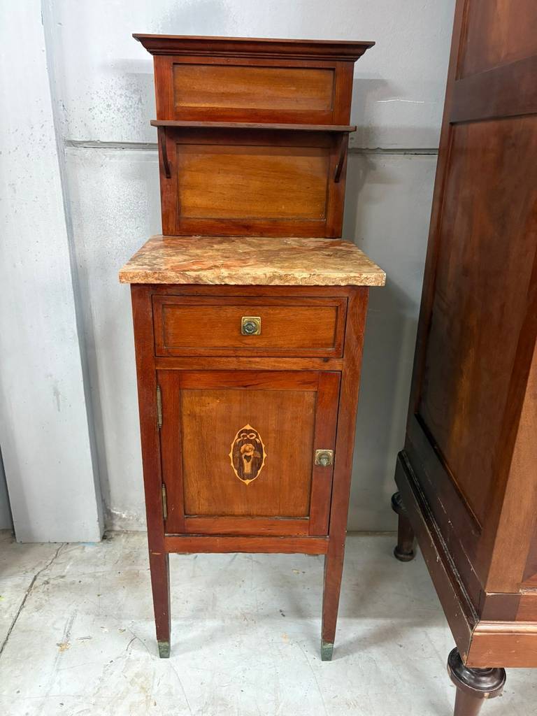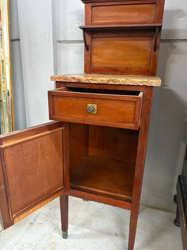 Mesita de noche de estilo clásico que ha sido fabricada con madera de buena calidad y robusta. Se compone de una parte superior con una leja y un mármol grueso, en la parte inferior un cajón y una puerta con compartimento interior. Es ideal para colocar en un dormitorio individual al lado de una cama. Como podemos observar en las fotografías el mármol está roto.
