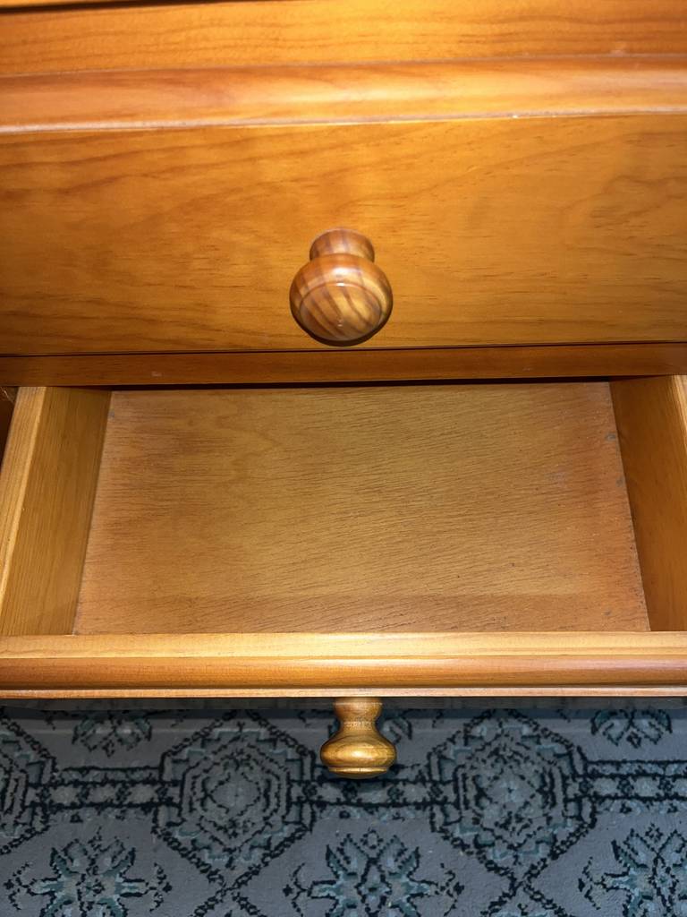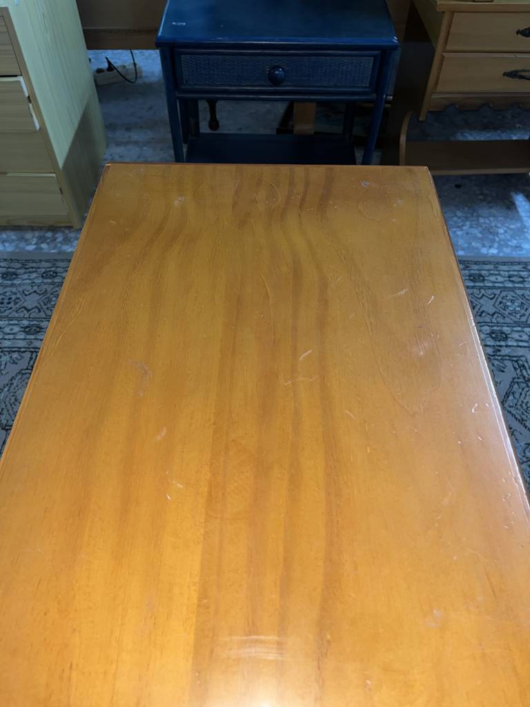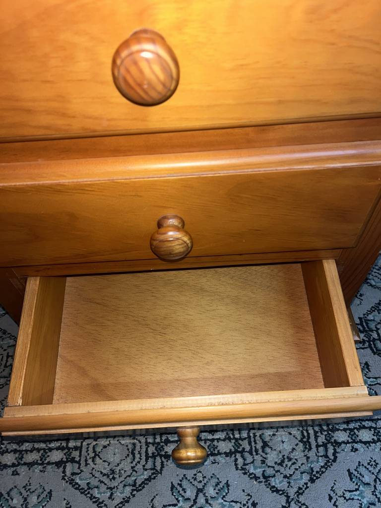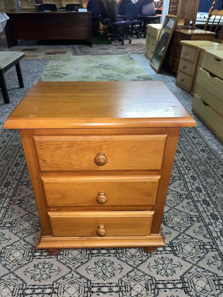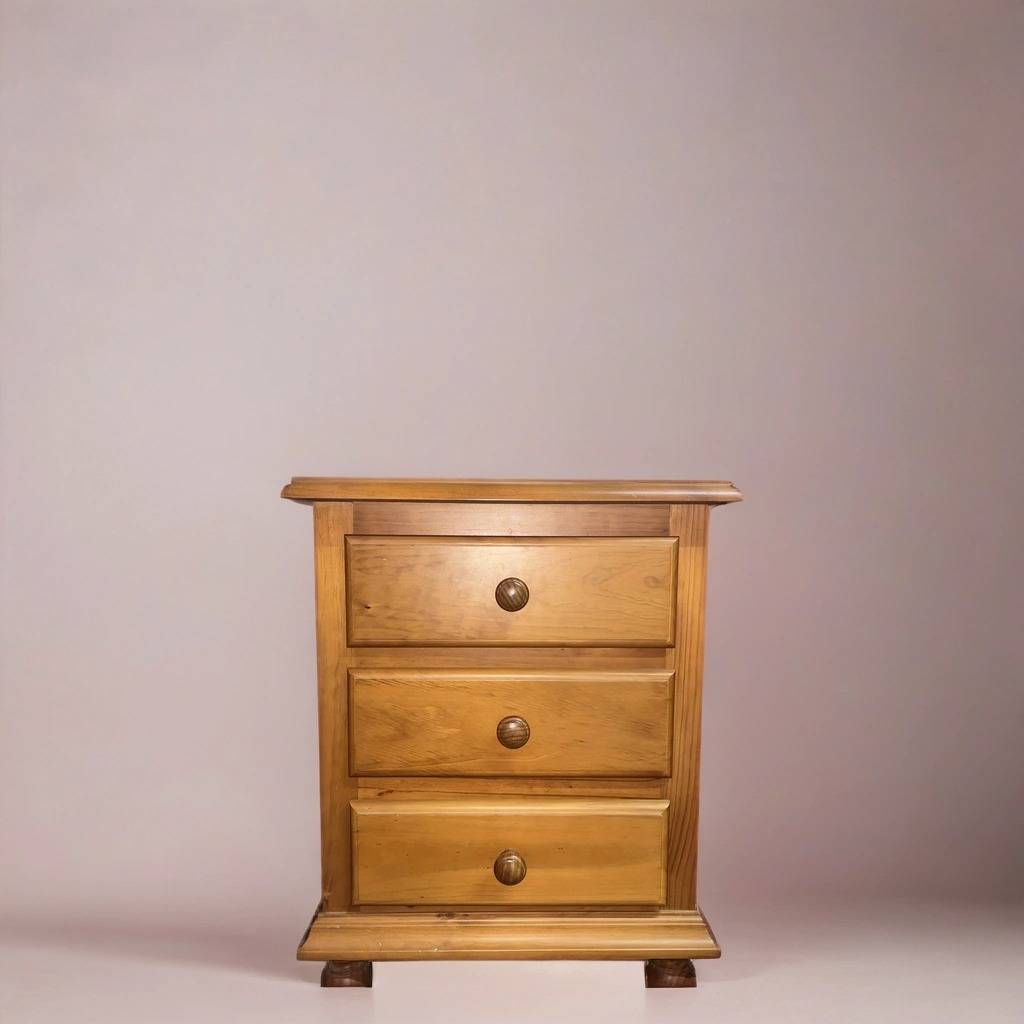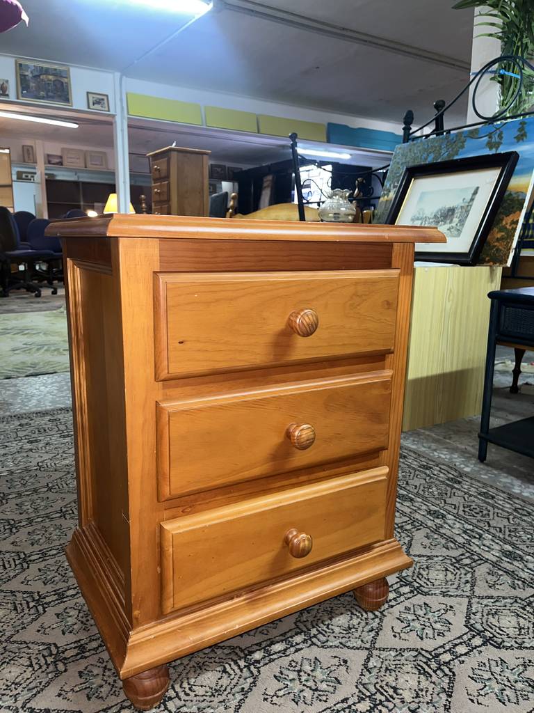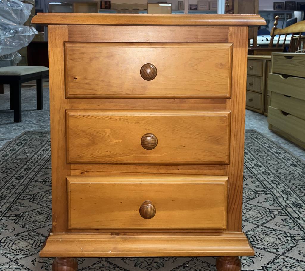 Mesita de noche de estilo rústico que ha sido fabricada con madera de buena calidad y robusta. Se compone de una parte frontal con tres cajones que incorporan cada uno un tirador grueso central para abrirlos fácilmente. Es una mesita ideal para colocar en un dormitorio al lado de nuestra cama. Como podemos observar en las fotografías presenta ligeros rasguños.