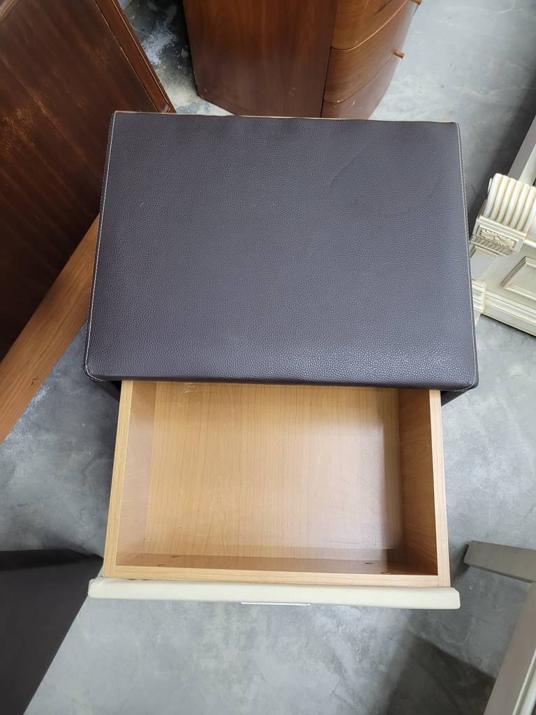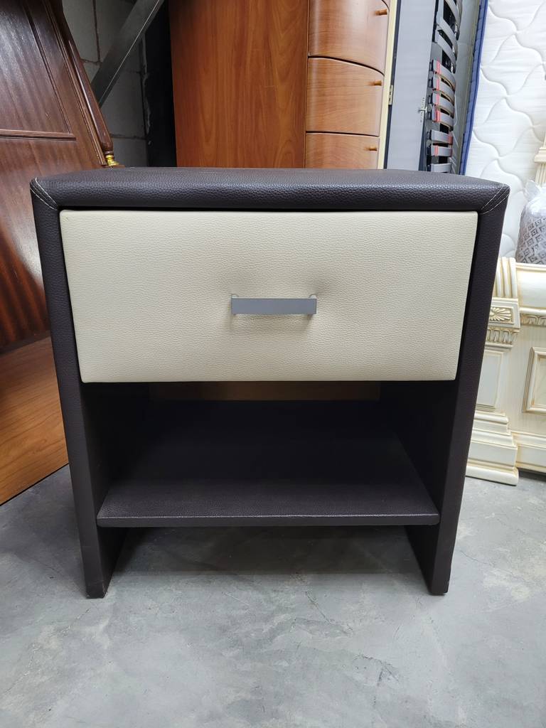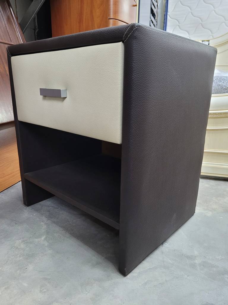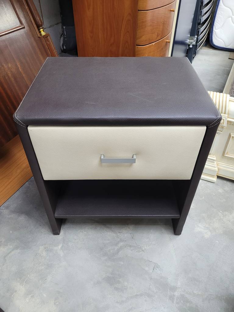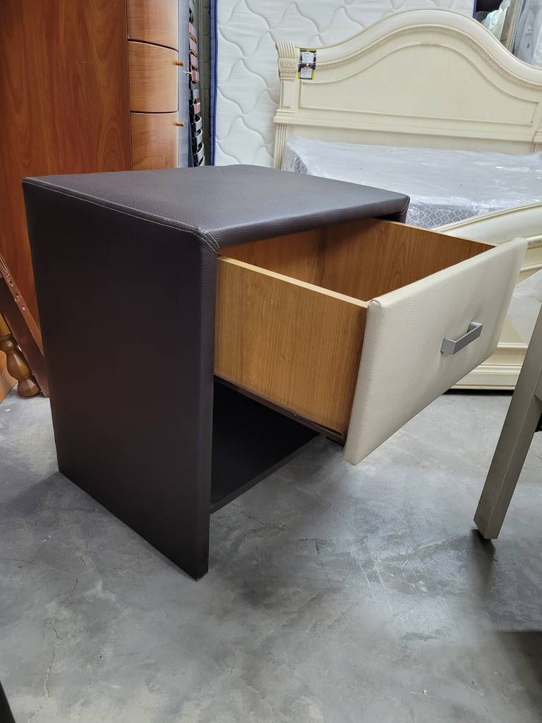 Mesita de estilo moderno muy original que ha sido forrada con polipiel. Se compone de una estructura en color oscuro y en el frontal un cajón blanco con tirador incorporado para abrirlo fácilmente. Es ideal para colocar en un dormitorio individual al lado de nuestra cama. Como podemos observar en las fotografías se encuentra en buenas condiciones.