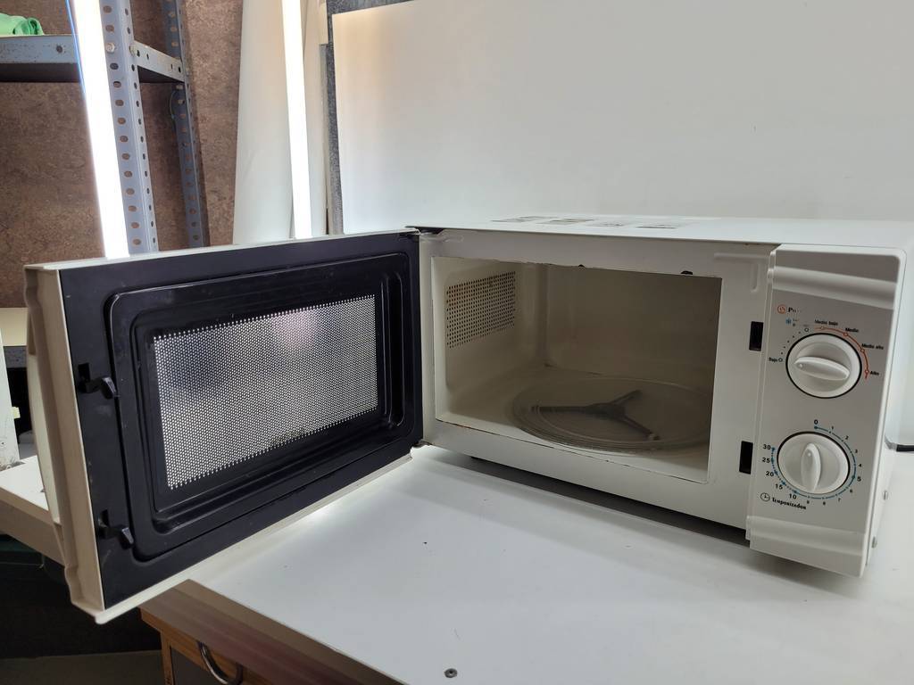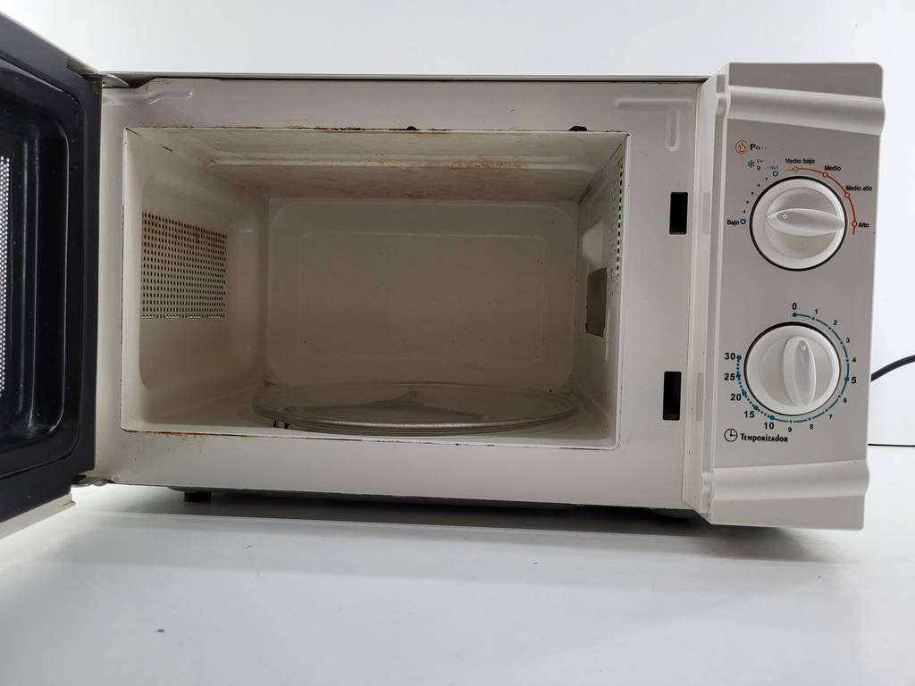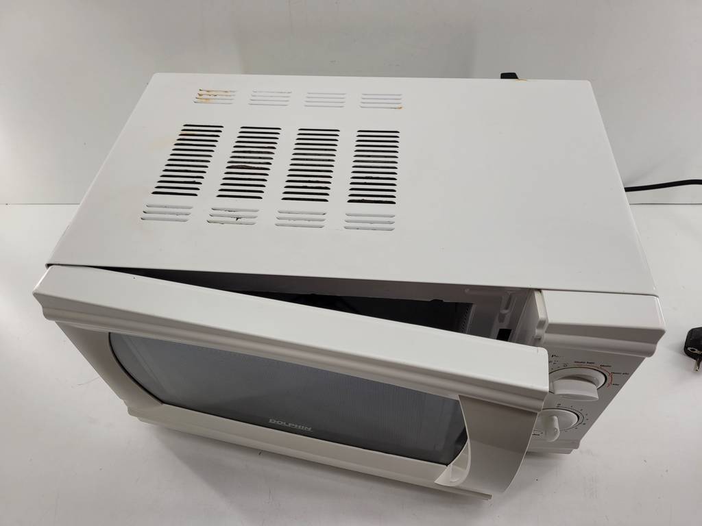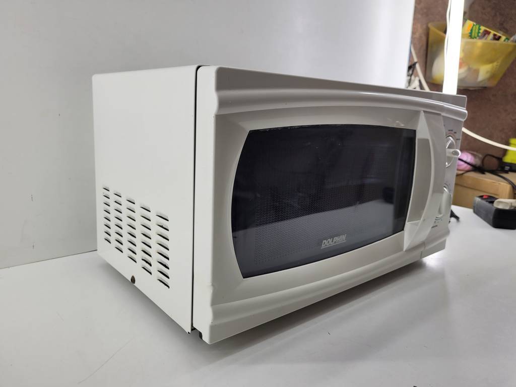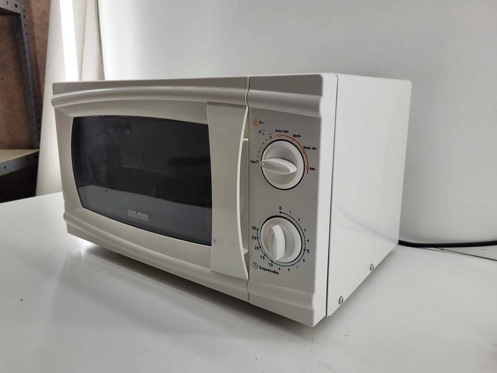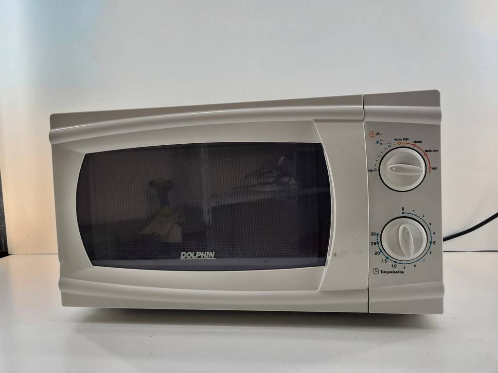 Microondas de la marca Dolphin de color gris mate. Se trata de un microondas que tiene dos ruedas grandes con los que controlar la potencia o modo de descongelación y el tiempo de cocinado o calentado de los alimentos. Es un microondas perfecto para sustituir uno en mal estado o para una cocina nueva. Como se puede observar en las fotografías presenta desgaste del uso.