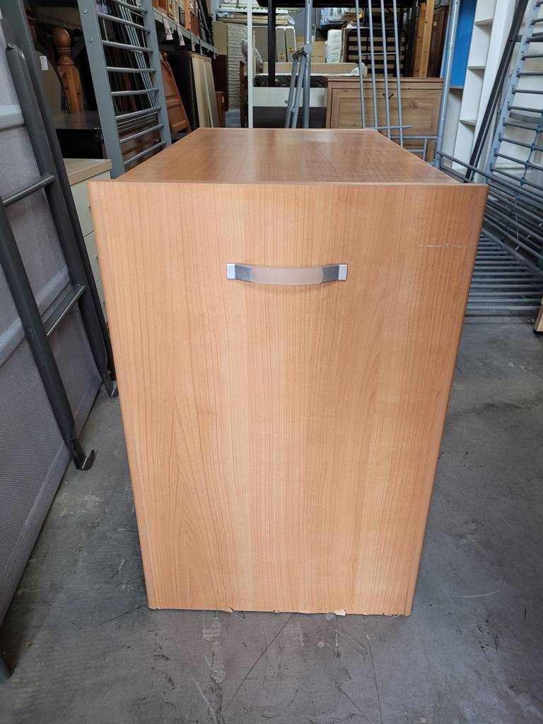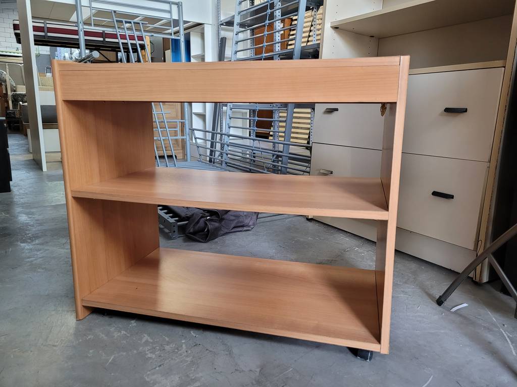 Mueble auxiliar fabricado en madera de buena calidad de color marrón claro. Se trata de un mueble auxiliar que cuenta con tres baldas y tiene ruedas para poder moverlo por las estancias con mayor facilidad. Es un mueble auxiliar que resulta ideal para colocarlo tanto en un estudio del hogar como en un dormitorio o un salón comedor. Como se puede observar en las fotografías se encuentra en buenas condiciones.