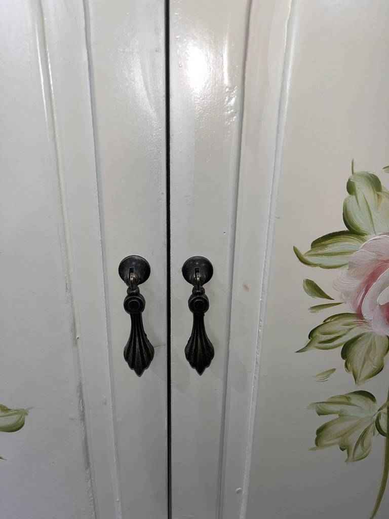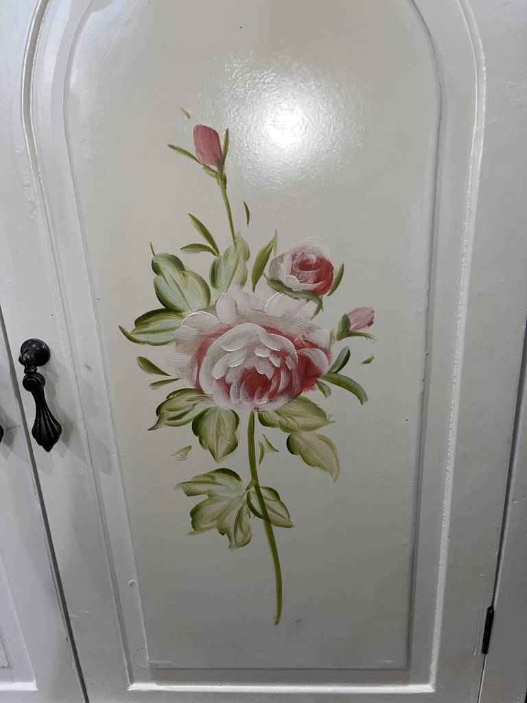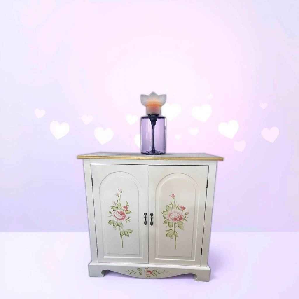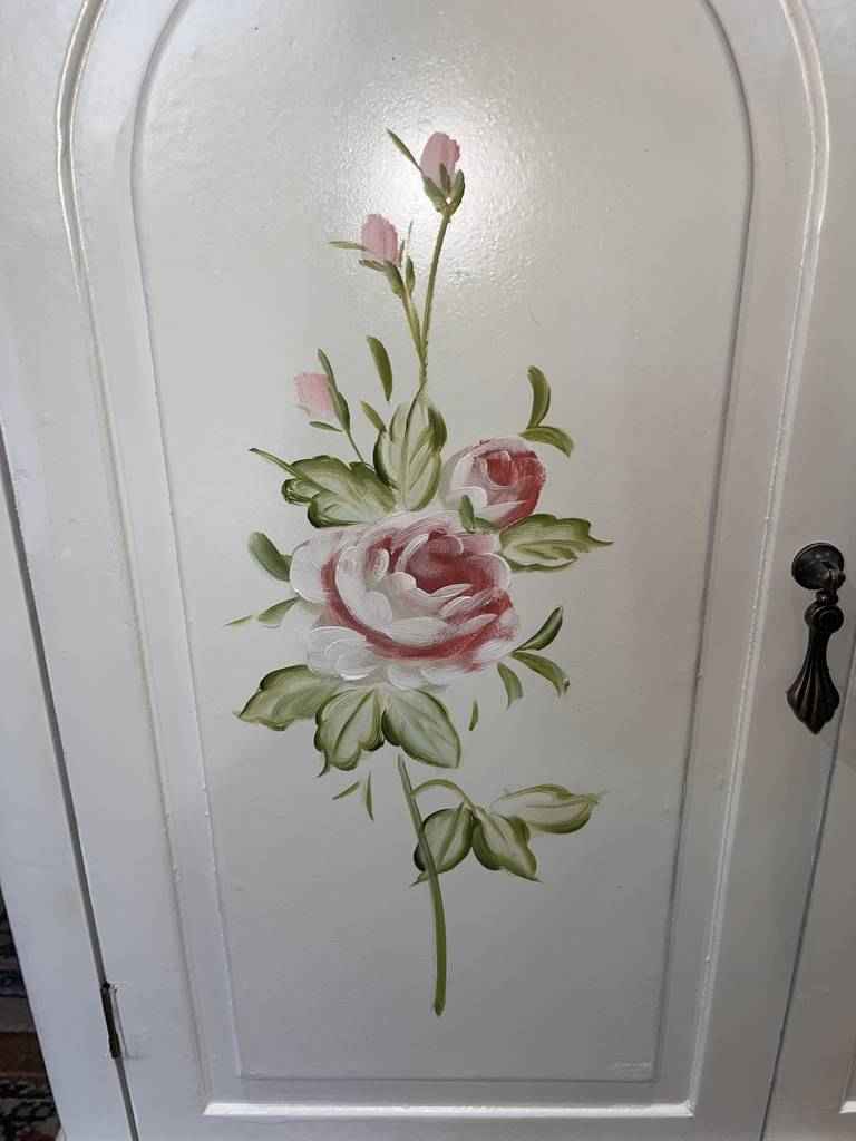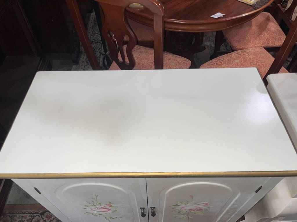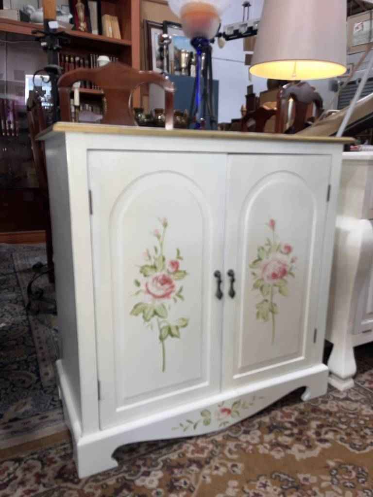 Mueble auxiliar fabricado en madera de buena calidad de color blanco con unos bonitos detalles de flores pintadas a mano de color rosa. Se trata de un mueble auxiliar recién restaurado que dispone de dos puertas con tiradores metálicos para facilitar su apertura. Es un mueble ideal para ponerlo tanto en un salón comedor como en un vestidor o un dormitorio. Como se ve en las imágenes está en buen estado.