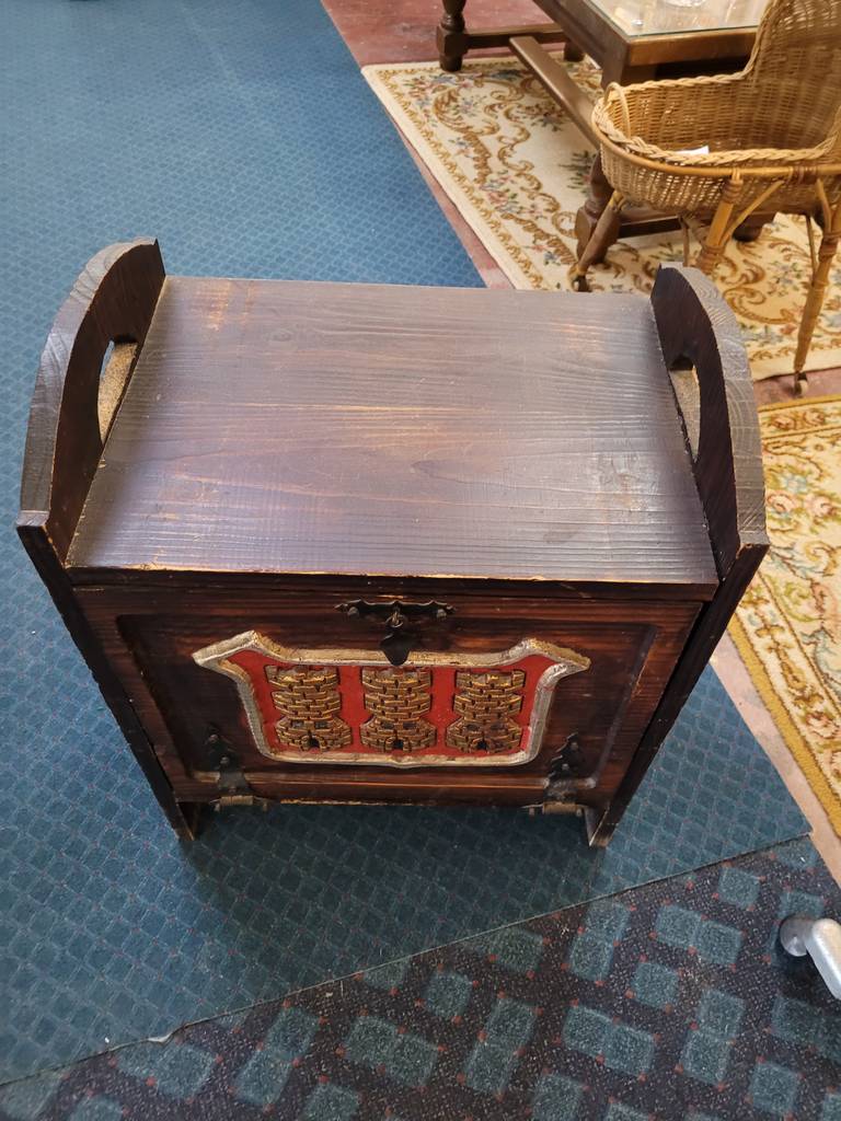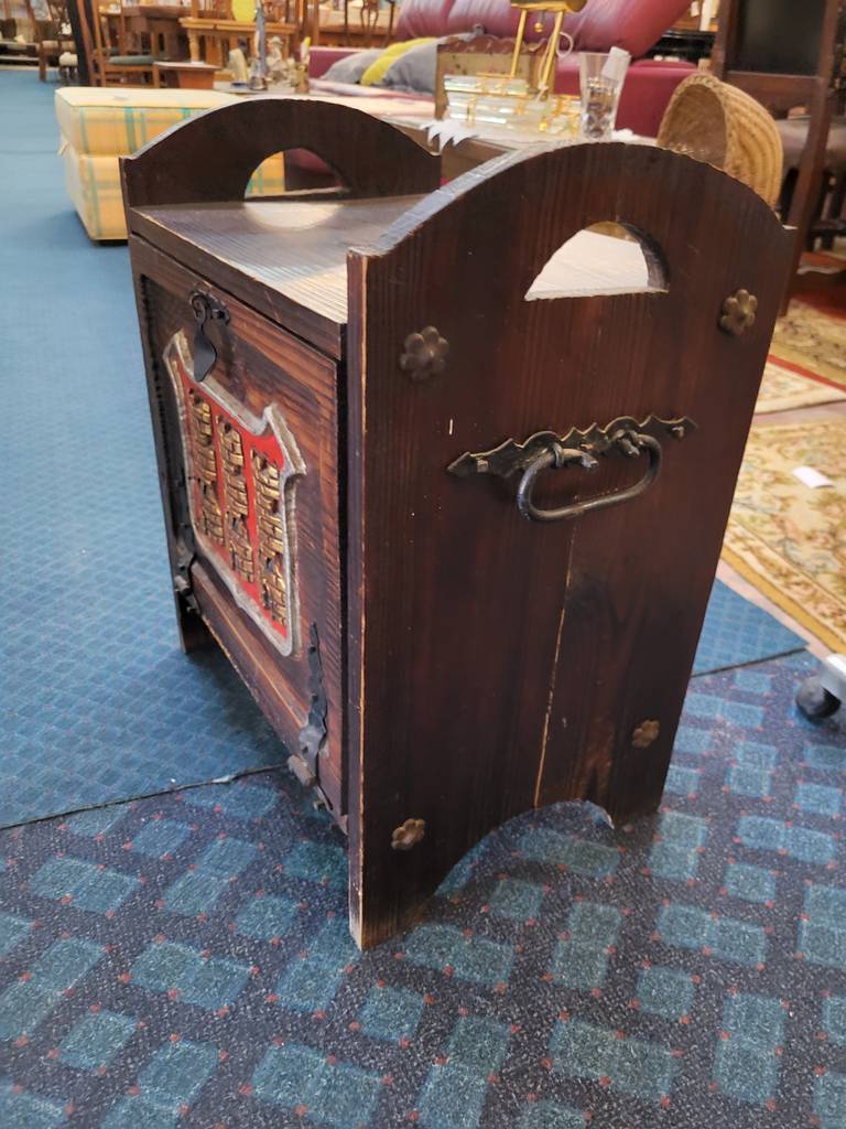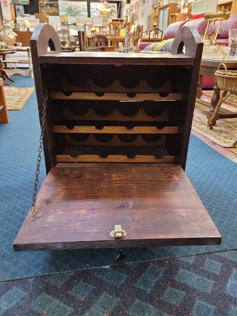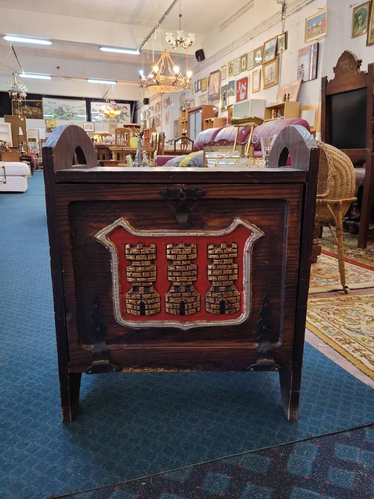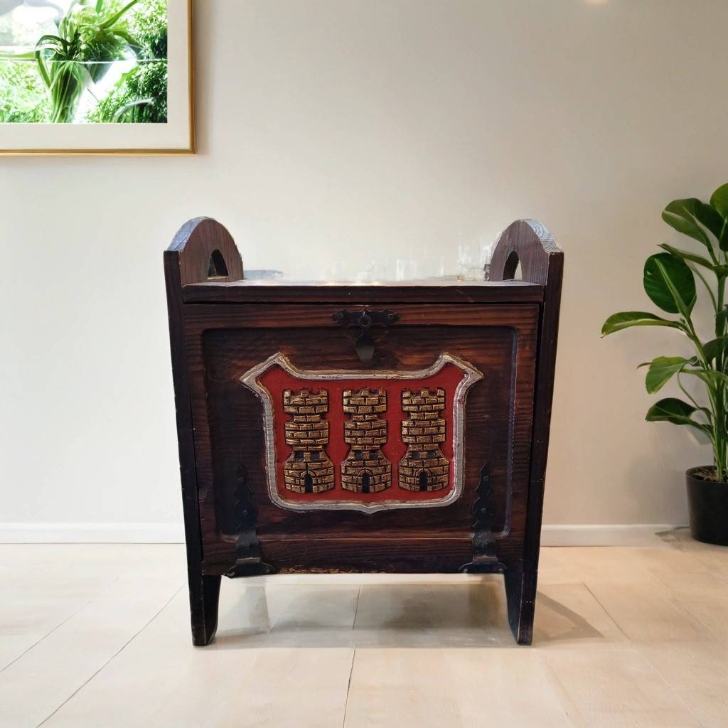 Mueble botellero fabricado en madera de buena calidad de color marrón oscuro. Se trata de un mueble botellero que tiene en la parte frontal un dibujo con tres torres de color marrón claro y rojo. Es un mueble botellero ideal para tenerlo en un salón comedor de estilo clásico para guardar y colocar diferentes botellas. Como se puede observar en las fotografías se encuentra en buenas condiciones.