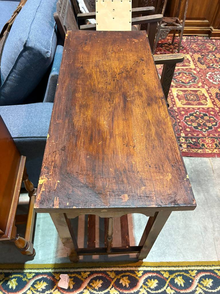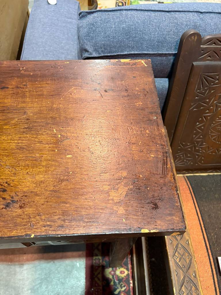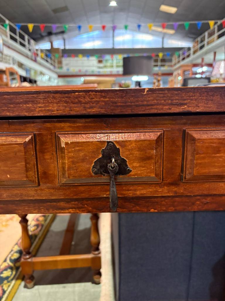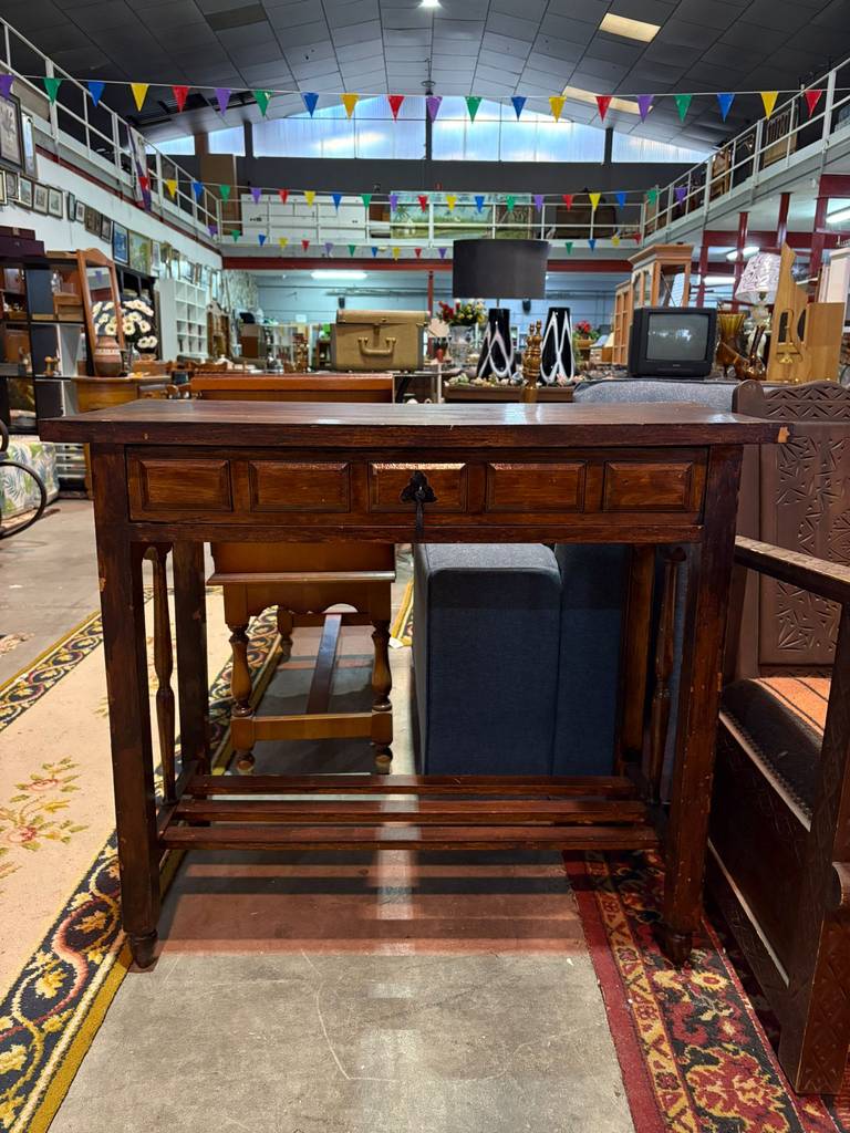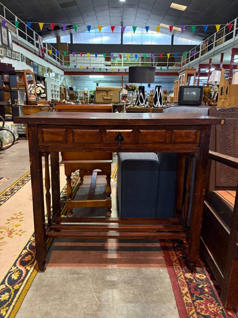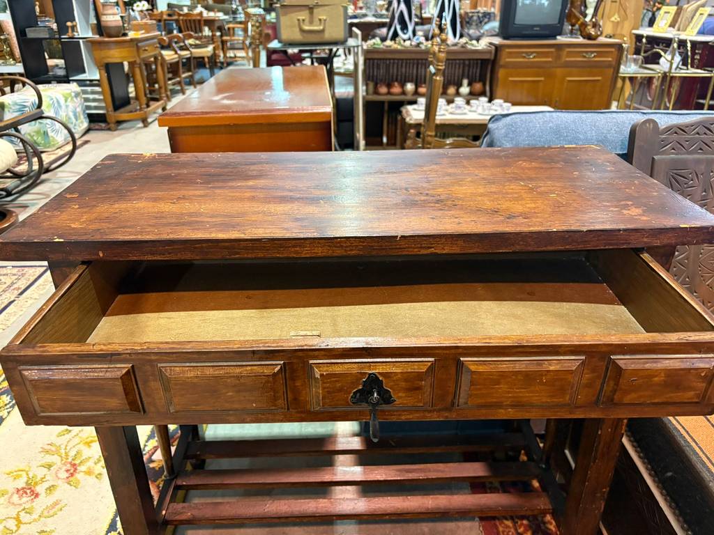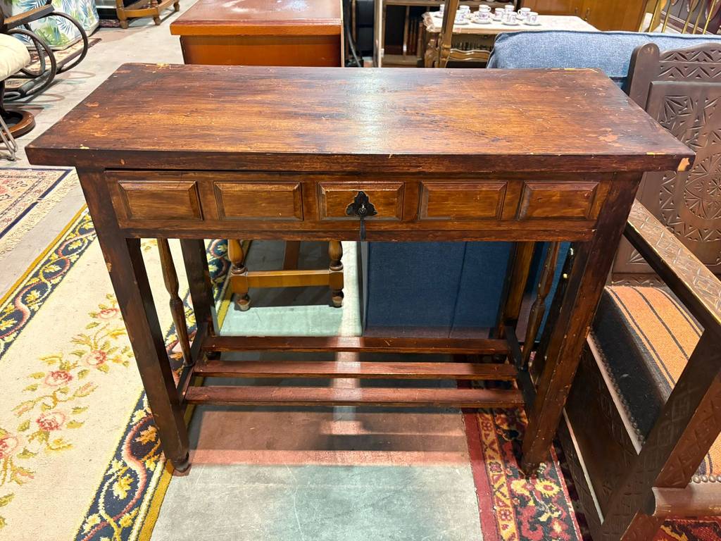 Mesa mueble de estilo castellano que ha sido fabricada con madera de buena calidad y robusta. Se trata de un mueble que incorpora una parte inferior con tres tablones de madera que es ideal para colocar zapatos. También incorpora en el frontal un cajón con un tirador central para abrirlo fácilmente. Es ideal para colocar como recibidor, por ejemplo. Como podemos observar en las fotografías presenta desperfectos.