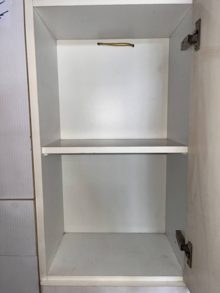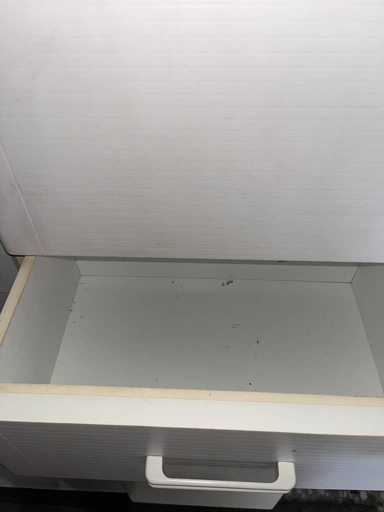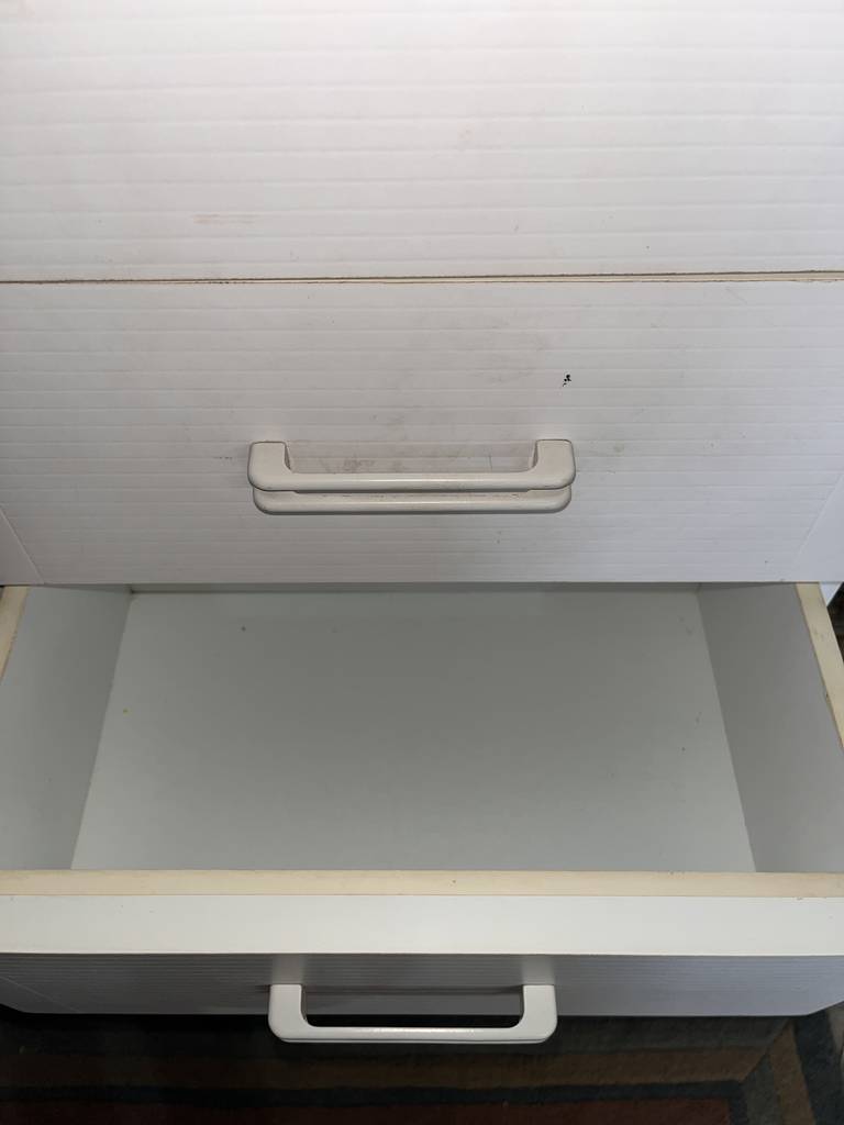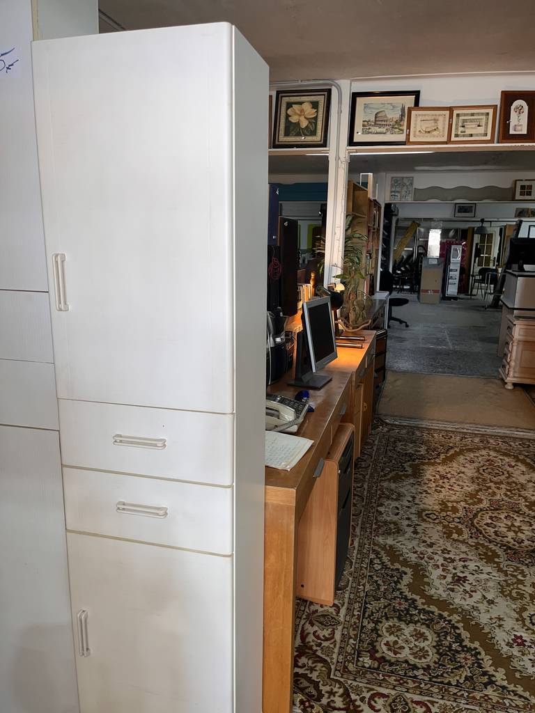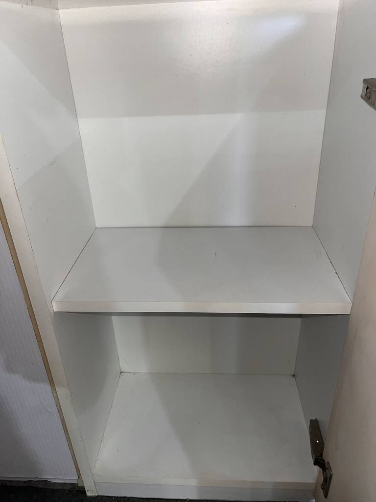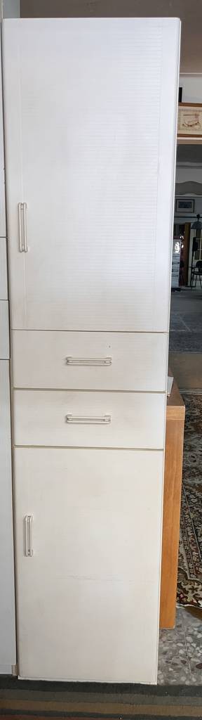 Mueble de baño con una forma vertical estrecha de color blanco. Se trata de un mueble de baño que cuenta con una puerta en la parte inferior, dos cajones en la parte central y otra puerta en la parte superior con tiradores metálicos en forma de asa para facilitar su apertura. Es un mueble ideal para ponerlo en un cuarto de baño del hogar. Como se puede observar en las fotografías se encuentra en buenas condiciones.