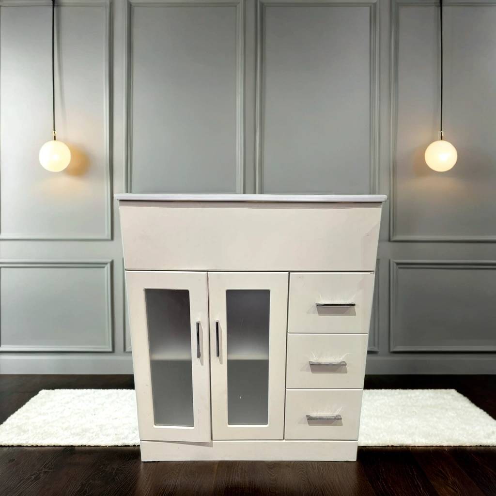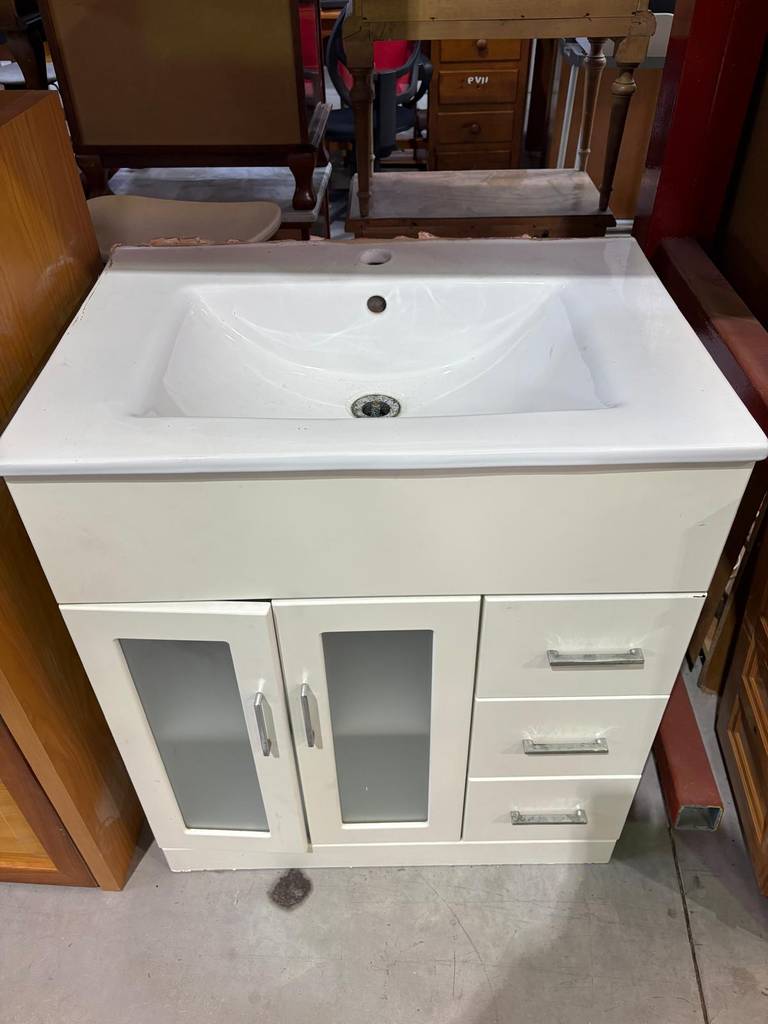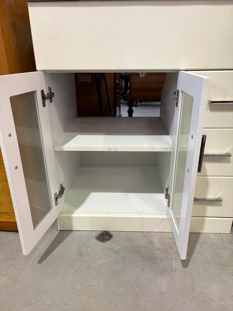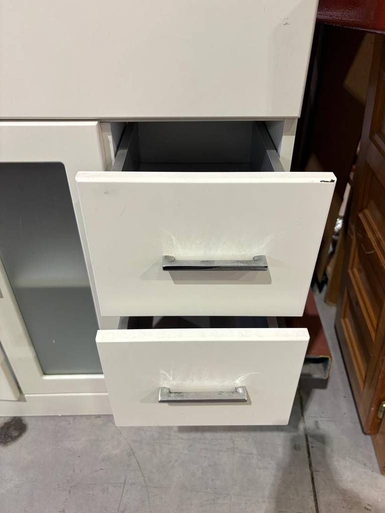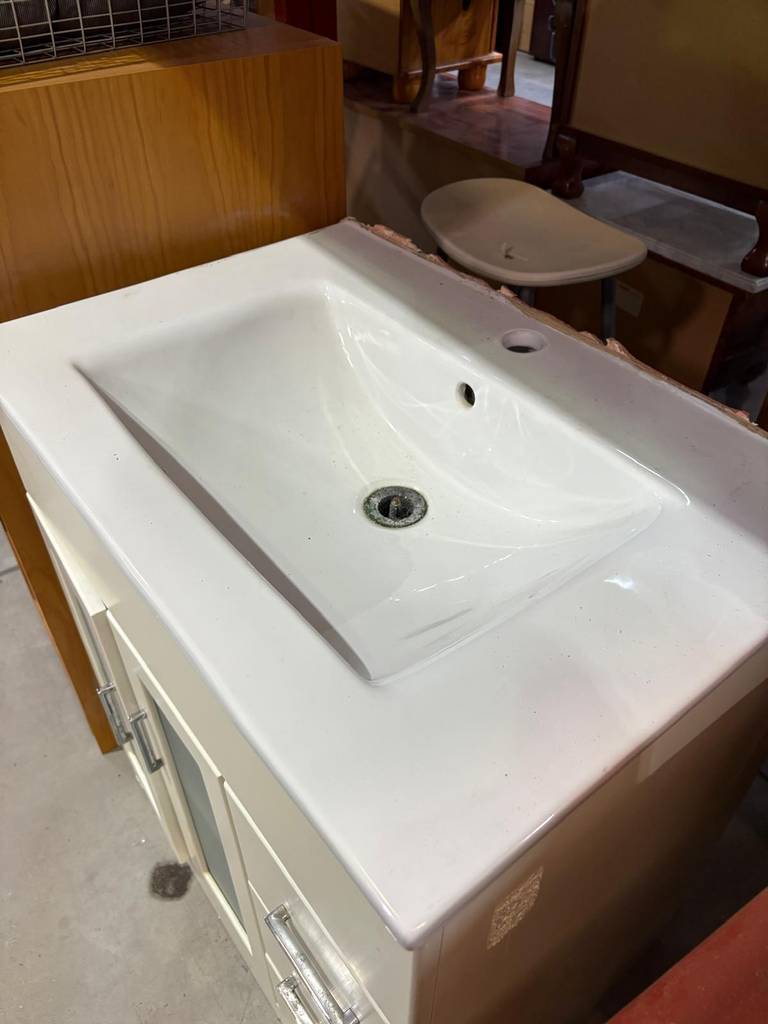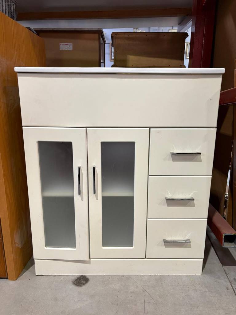 Mueble de baño de color blanco con aseo superior incorporado. El mueble es de madera de buena calidad y robusta. Se compone de una parte frontal con tres cajones laterales y un compartimento con dos puertas con cristal opaco incorporado. Todos ellos tienen tiradores para abrirlos cómodamente. Es ideal para colocar en un baño de tamaño medio. Como podemos observar en las fotografías presenta un ligero desgaste.