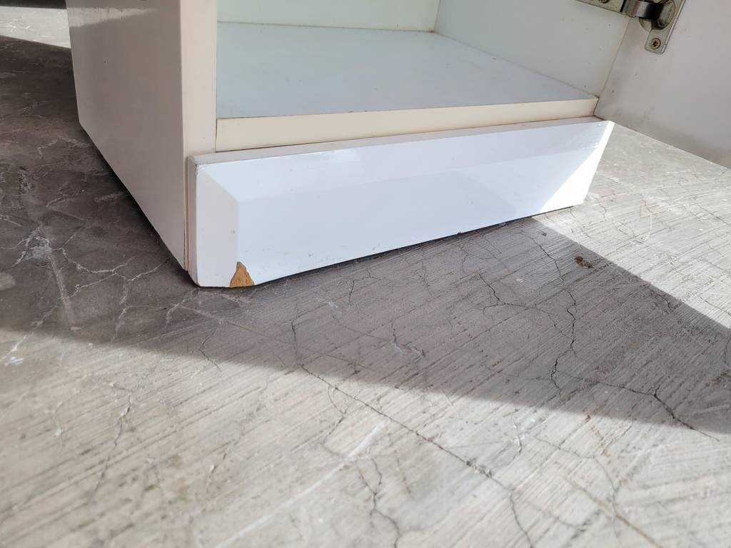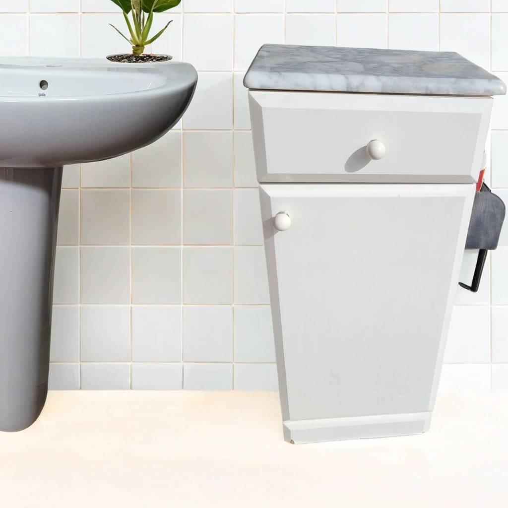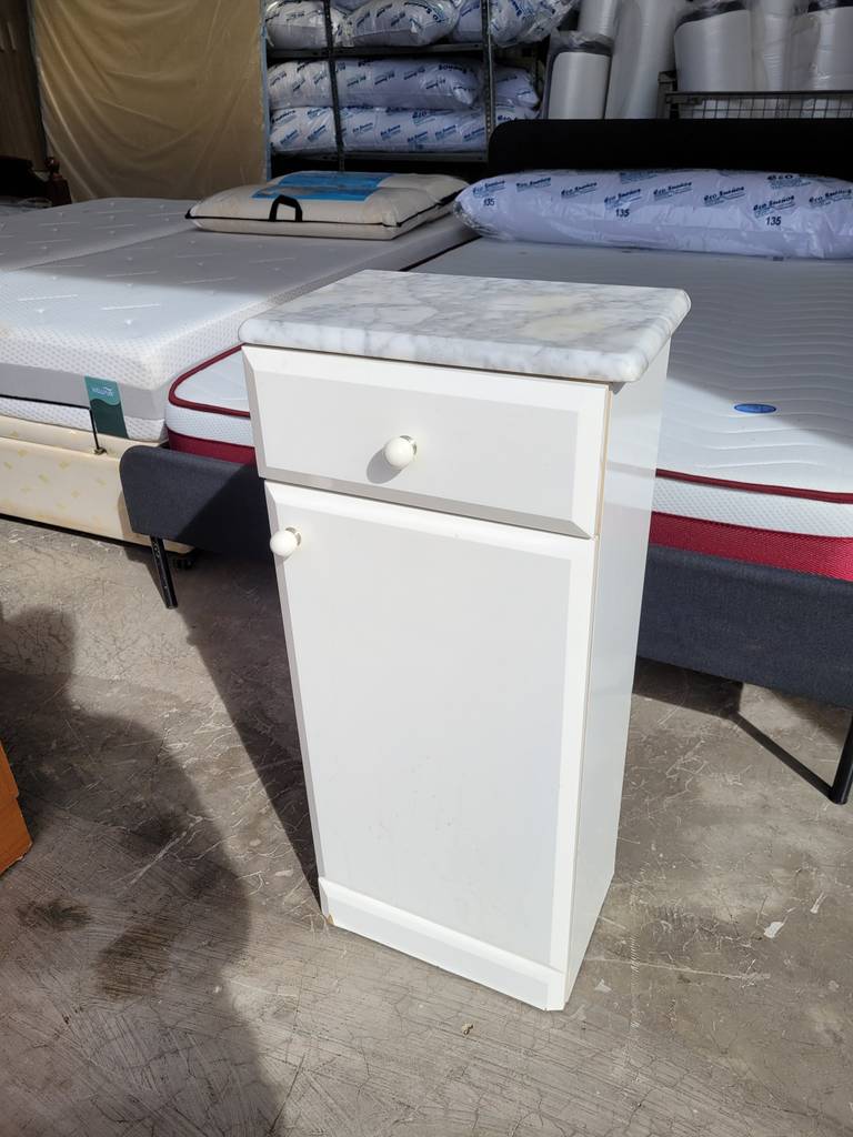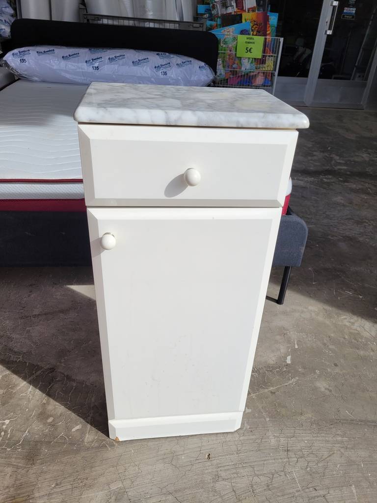Mueble para baño o aseo en color blanco que dispone en la parte superior de una tapa de mármol grueso de buena calidad. Se compone de una parte frontal con un cajón y una puerta que incorporan cada uno un tirador para abrirlos fácilmente. Es ideal para colocar en un aseo nuevo o recién reformado. Como podemos observar en las fotografías presenta un ligero desperfecto inferior.