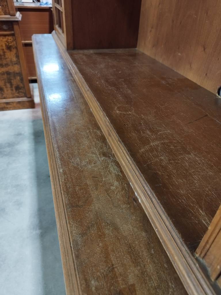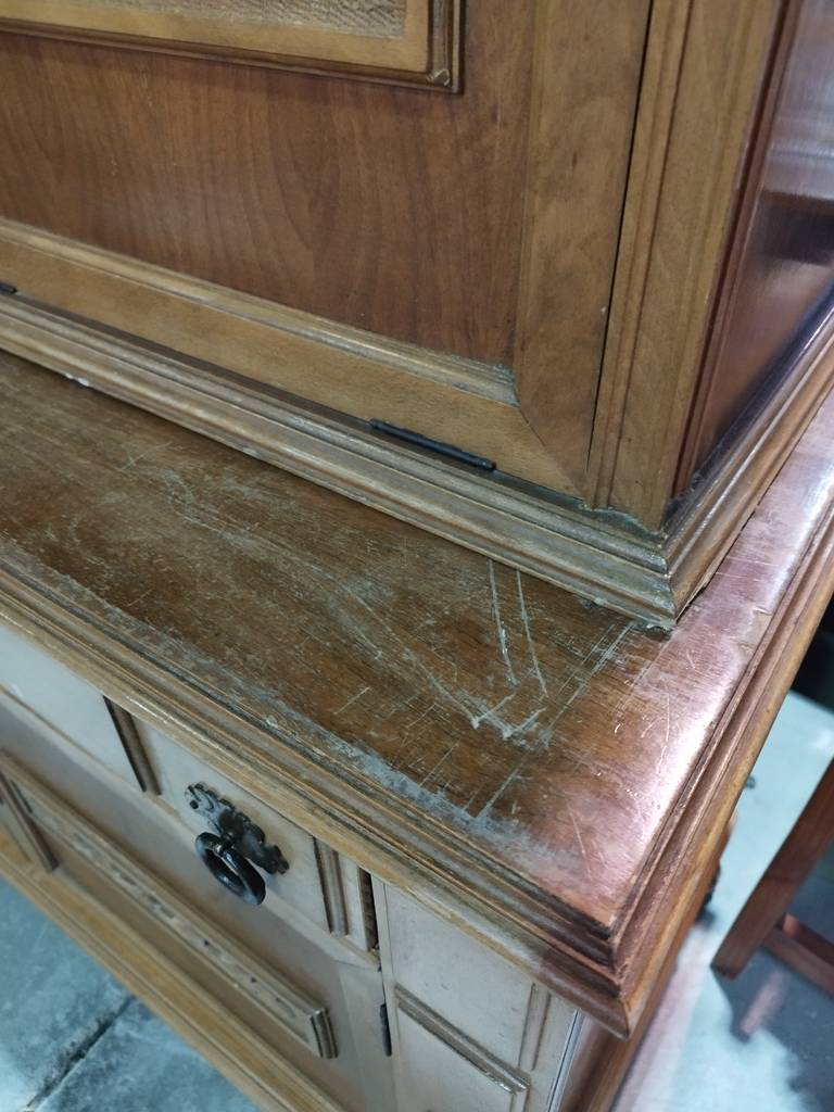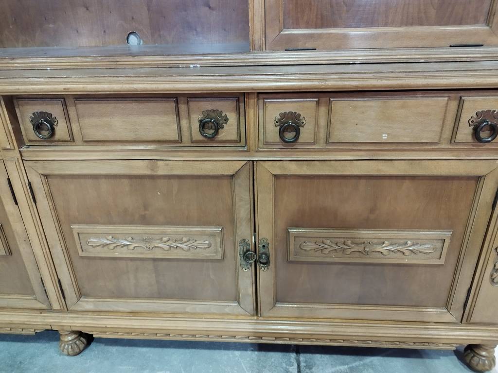 Mueble de comedor de grandes dimensiones que ha sido fabricado con madera de buena calidad y robusta. Se trata de un mueble compuesto por múltiples cajones y puertas, así como habitáculos abiertos y un espacio central grande para colocar un televisor. Dispone de bonitos detalles tallados que lo hacen resaltar. Como podemos observar en las fotografías presenta desperfectos.