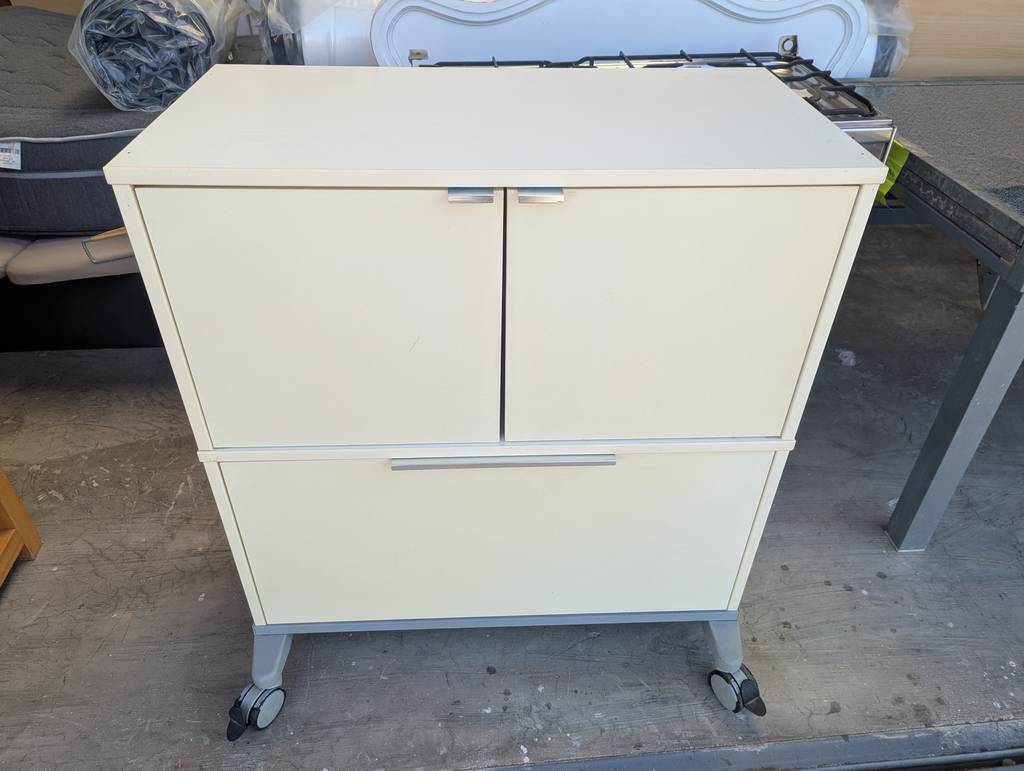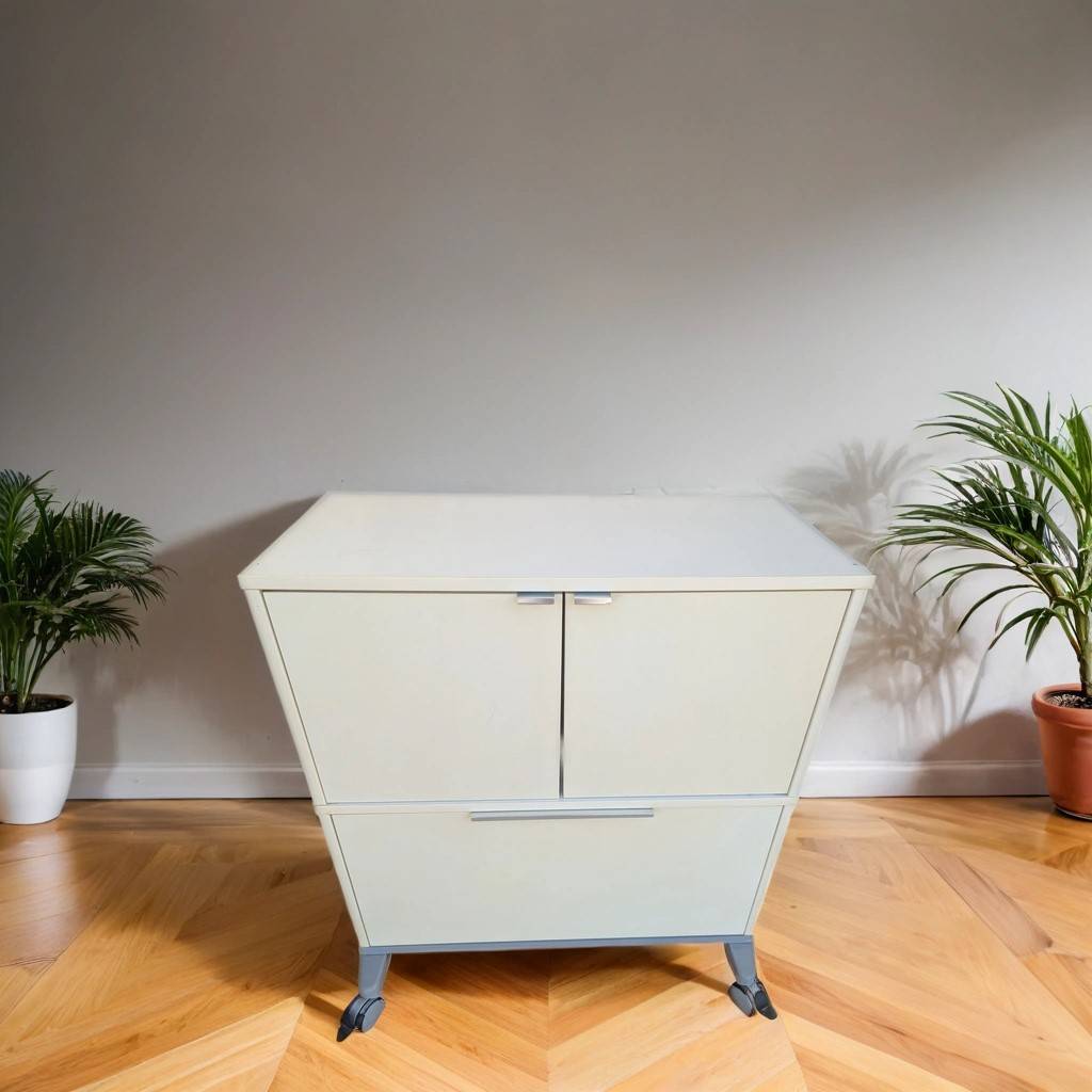 Mueble de oficina fabricado en madera de buena calidad de color blanco. Se trata de un mueble de oficina bajo que cuenta con cuatro ruedas para poder moverlo por las estancias con mayor facilidad. Es un mueble ideal para tenerlo en una oficina o un hogar porque tiene dos puertas y un cajón y resulta perfecto para guardar objetos. Como se puede observar en las fotografías se encuentra en buenas condiciones.