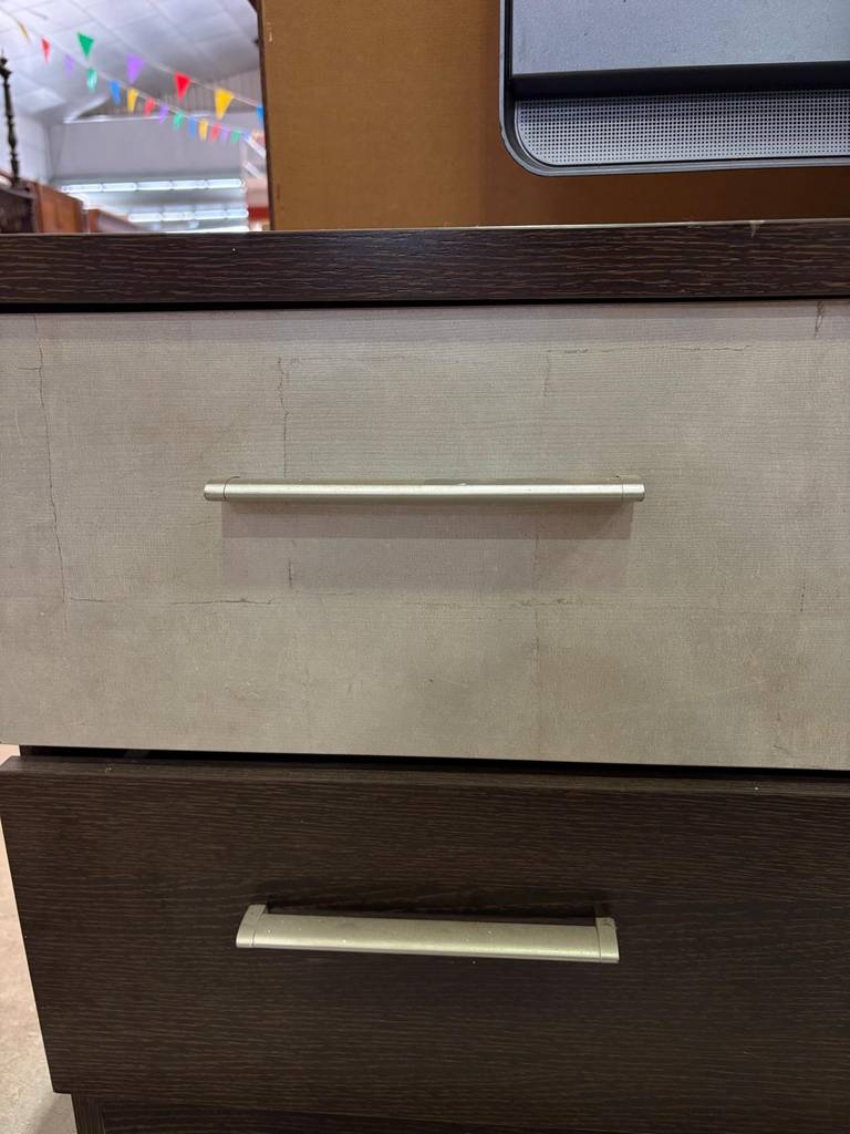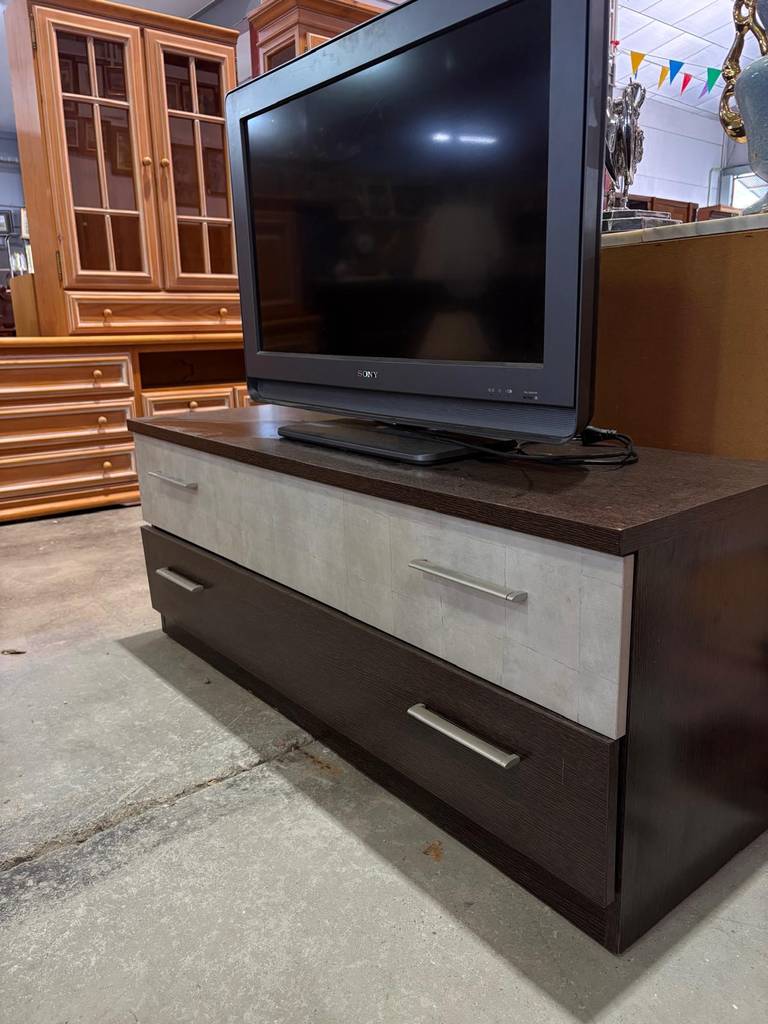 Mueble para televisor de color gris y negro de estilo moderno que ha sido fabricado con madera de buena calidad y robusta. Se compone de dos cajones amplios frontales uno de cada color y con dos tiradores cada uno para abrirlos fácilmente. Es un mueble ideal para colocar en un salón comedor. Como podemos observar en las fotografías se encuentra en buenas condiciones.