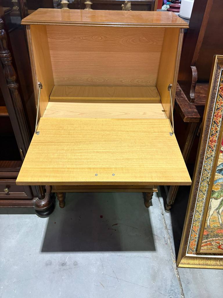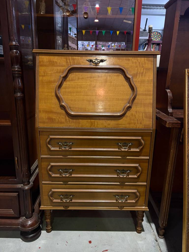 Mueble escritorio fabricado en madera de haya de muy buena calidad de color marrón oscuro. Se trata de un mueble escritorio que cuenta en la parte inferior con tres cajones amplios con tiradores metálicos en forma de asa y en la parte superior dispone de una puerta que al abrirse se transforma en una superficie sobre la que se puede escribir. Como se puede observar en las fotografías se encuentra en buenas condiciones.