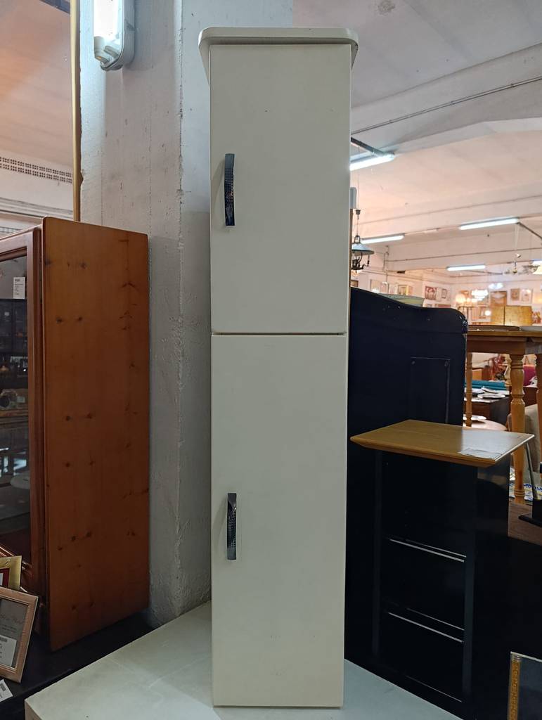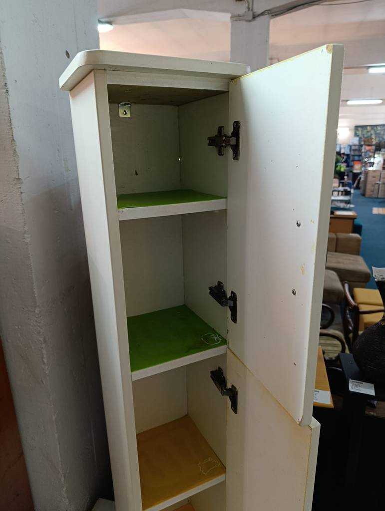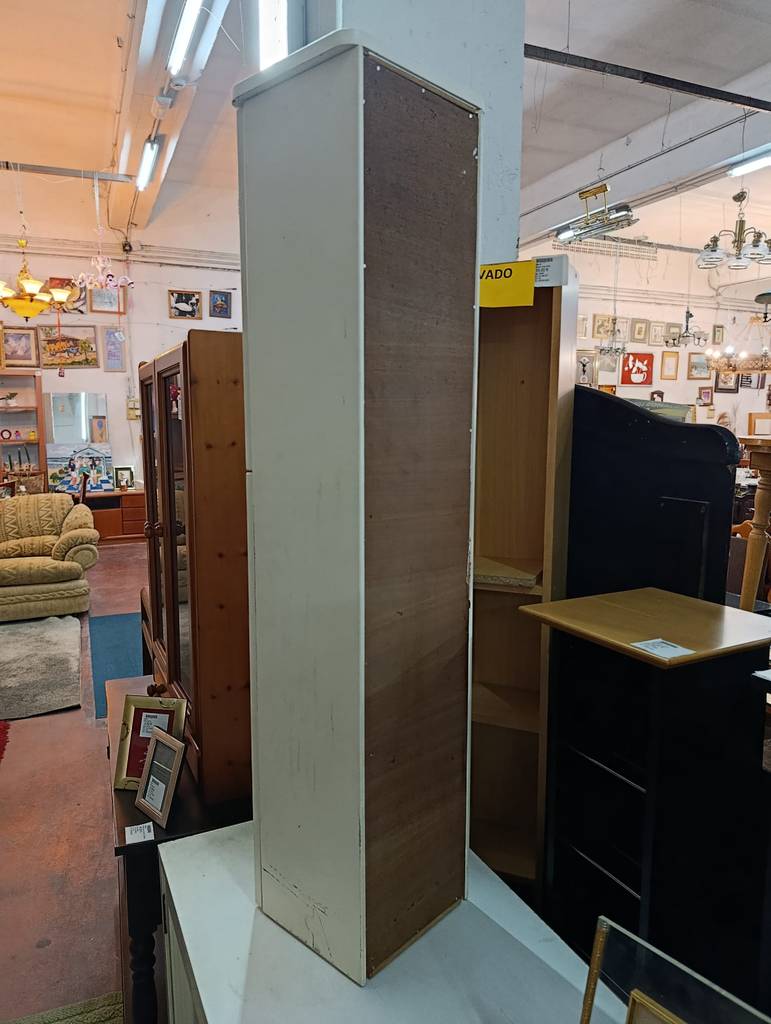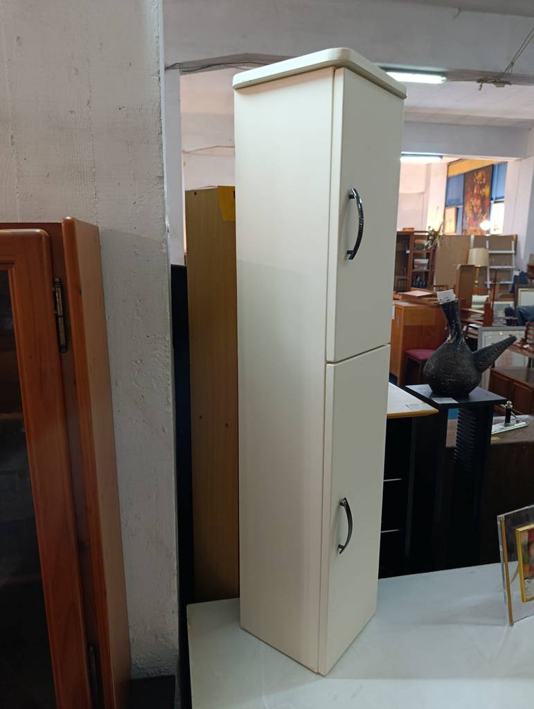 Mueble estrecho y alto fabricado en madera de buena calidad de color blanco. Se trata de un mueble auxiliar de tamaño mediano que cuenta con dos puertas con asas de metal para facilitar su apertura. Es un mueble ideal para colocarlo tanto en el cuarto de baño como en un vestidor. Como se puede observar en las fotografías se encuentra en buenas condiciones.
