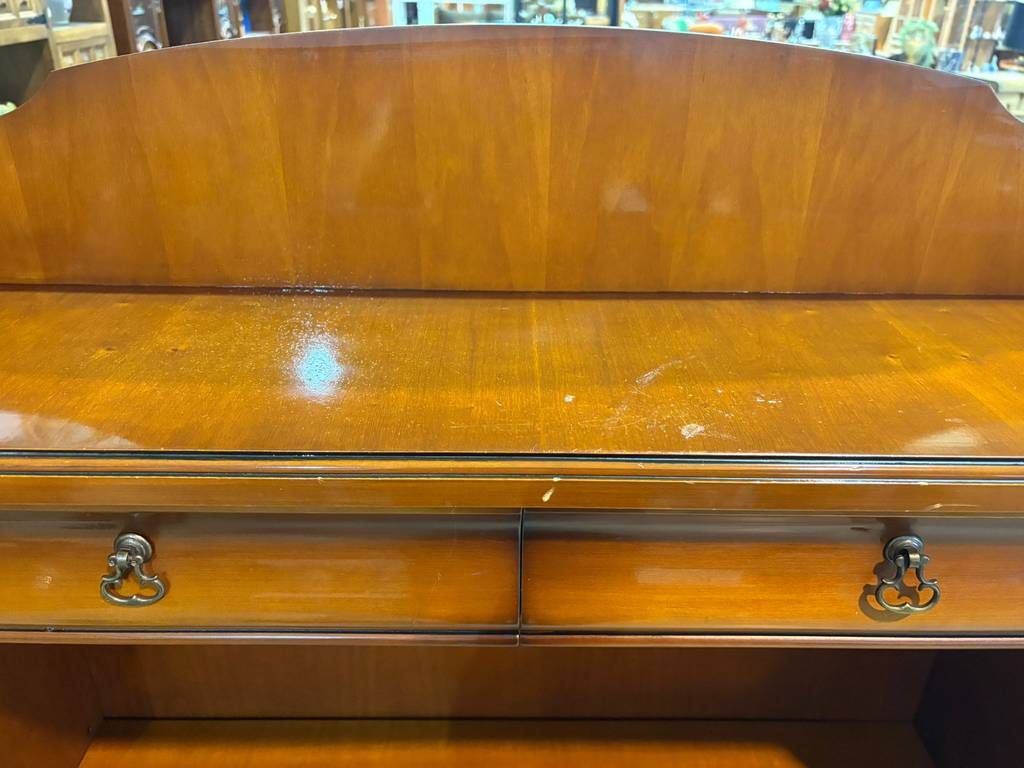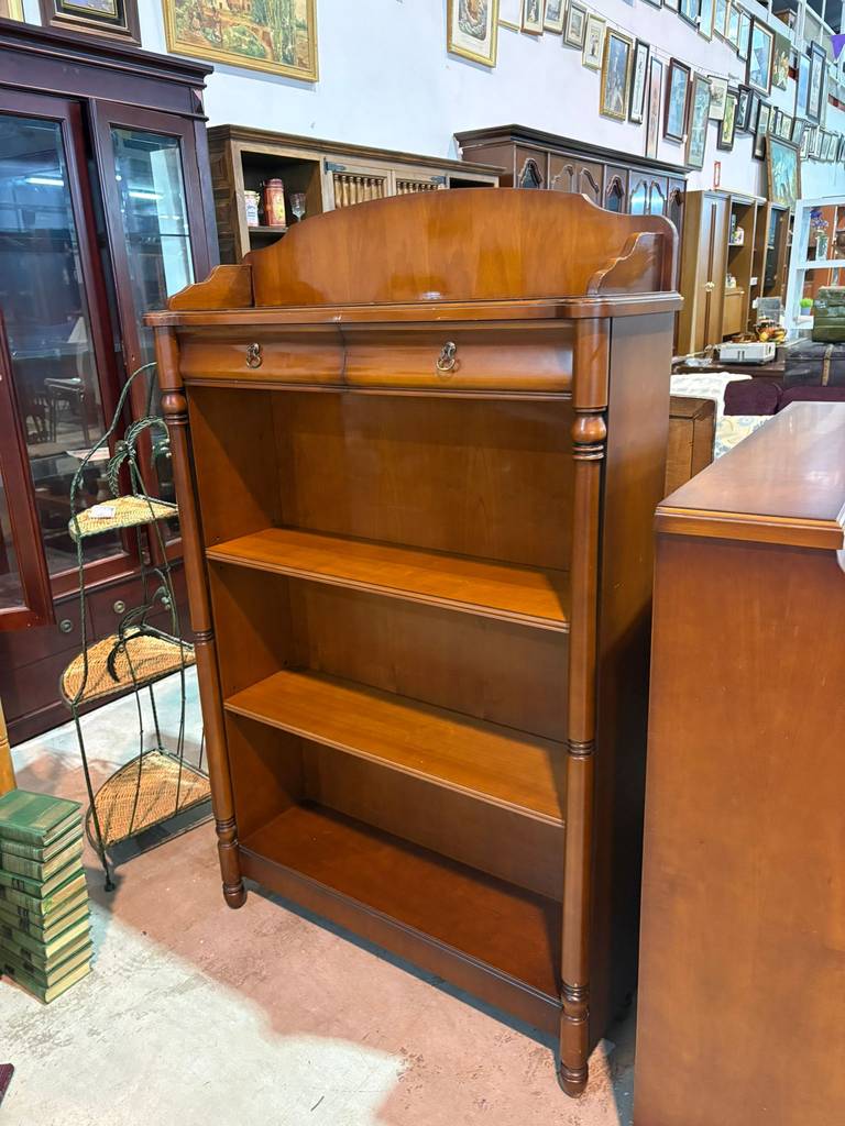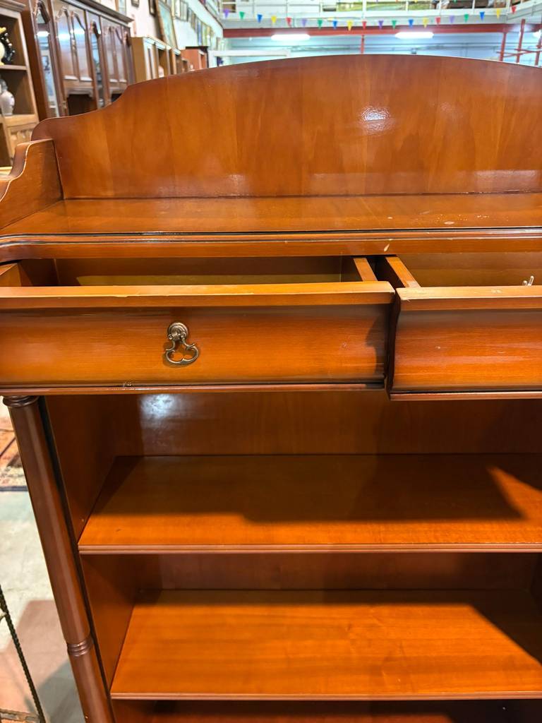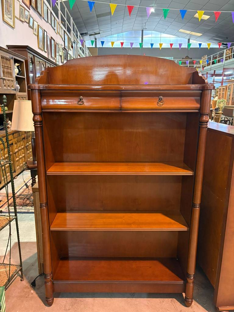 Mueble librería auxiliar que ha sido fabricada con madera de buena calidad y robusta. Se trata de una estantería con dos cajones pequeños en la parte superior y en la inferior tres habitáculos abiertos altos ideales para colocar y exponer figuras o libros. Es ideal para colocar en un salón comedor o estudio. Como podemos observar en las fotografías presenta ligeros rasguños.