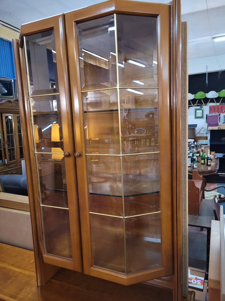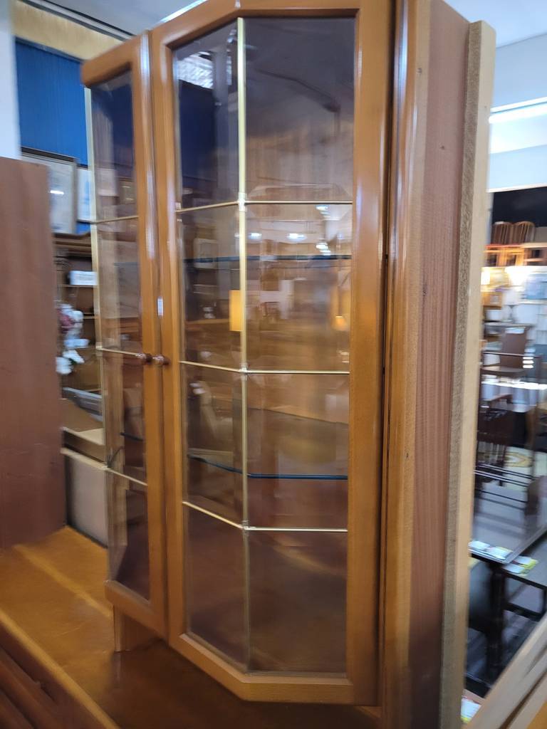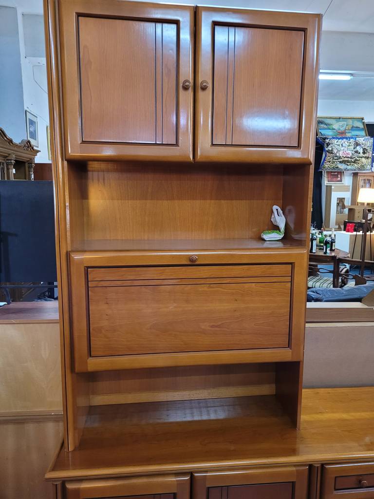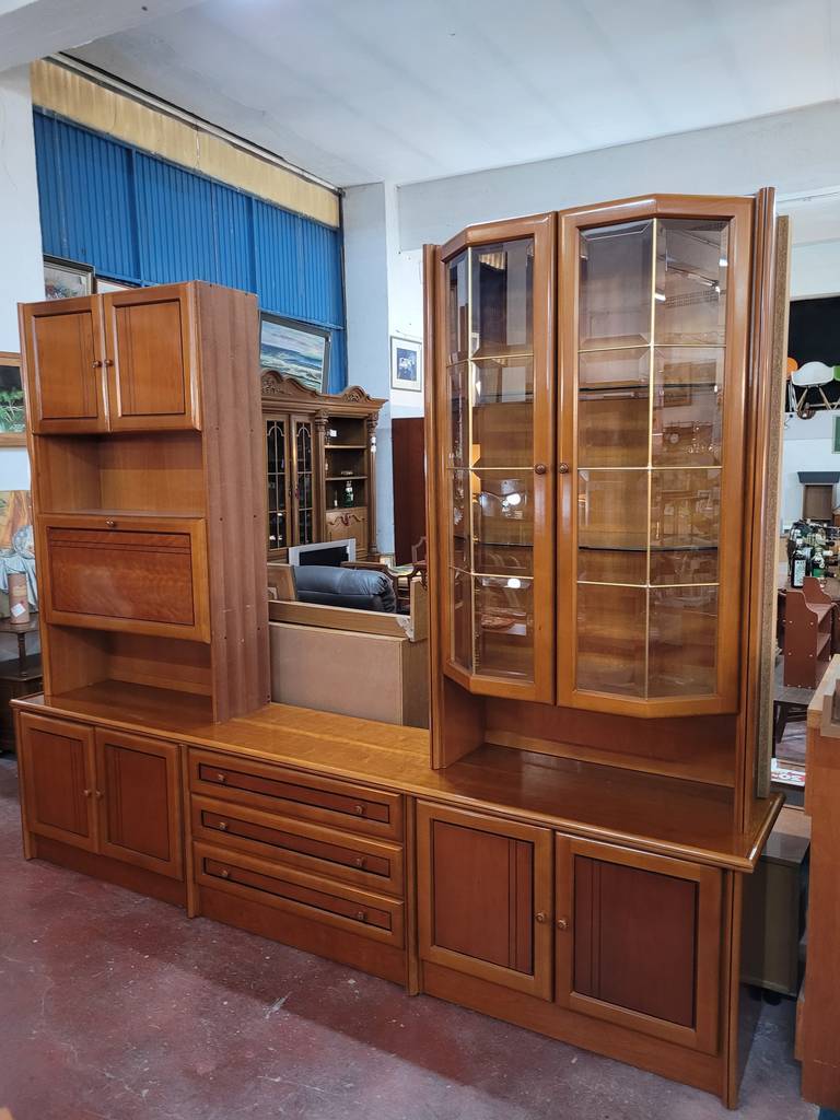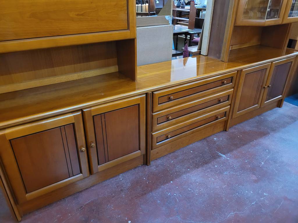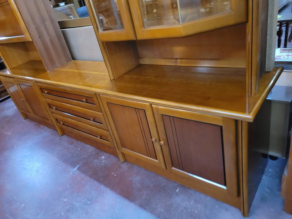 Mueble modular fabricado en madera de buena calidad de color marrón claro. Se trata de un mueble modular que cuenta con una parte baja en la que hay cuatro puertas y tres cajones y una parte alta en la que hay una vitrina con puertas de cristal y otras tres puertas más. Es un mueble perfecto para colocarlo en un salón comedor de estilo clásico. Como se puede observar en las fotografías se encuentra en buenas condiciones.