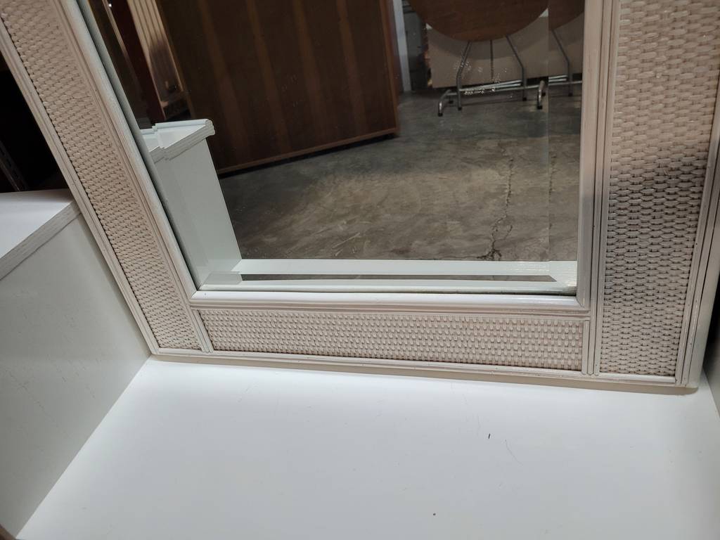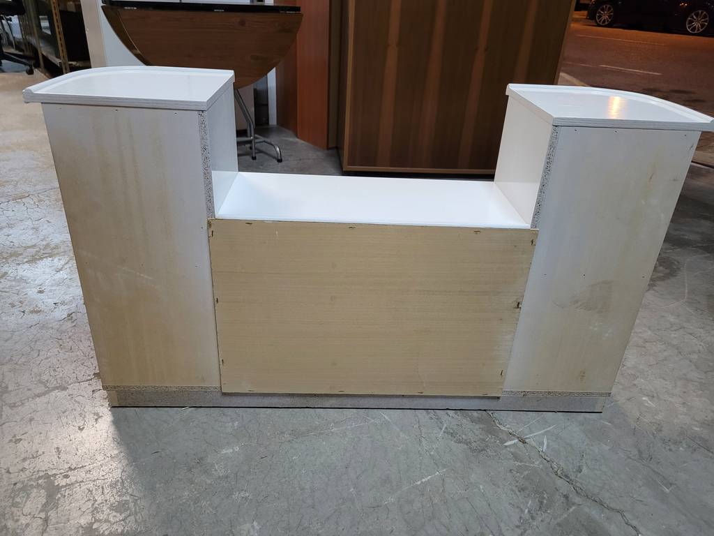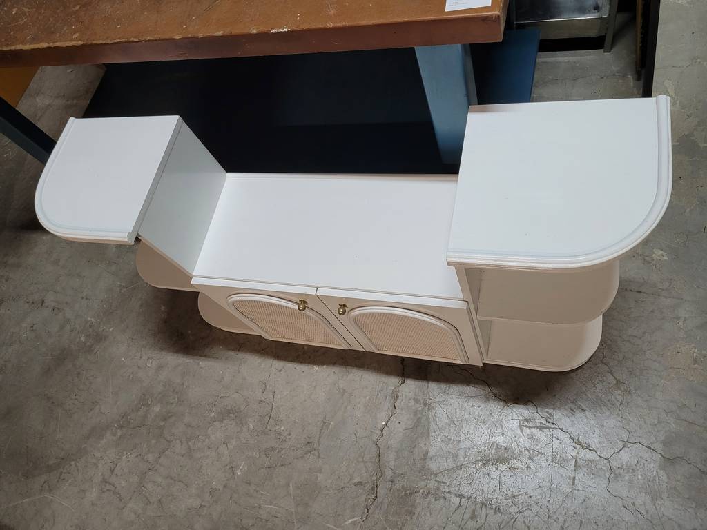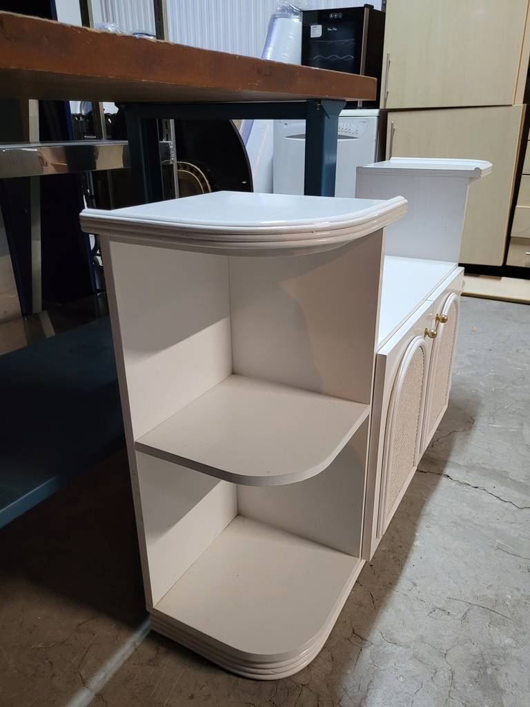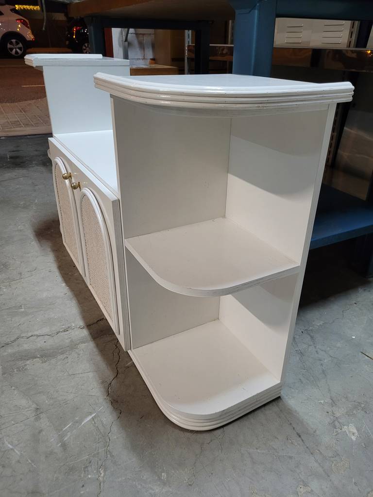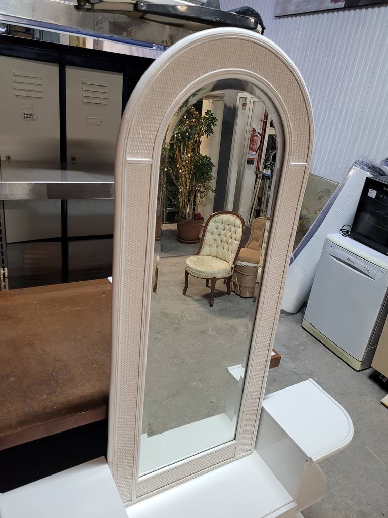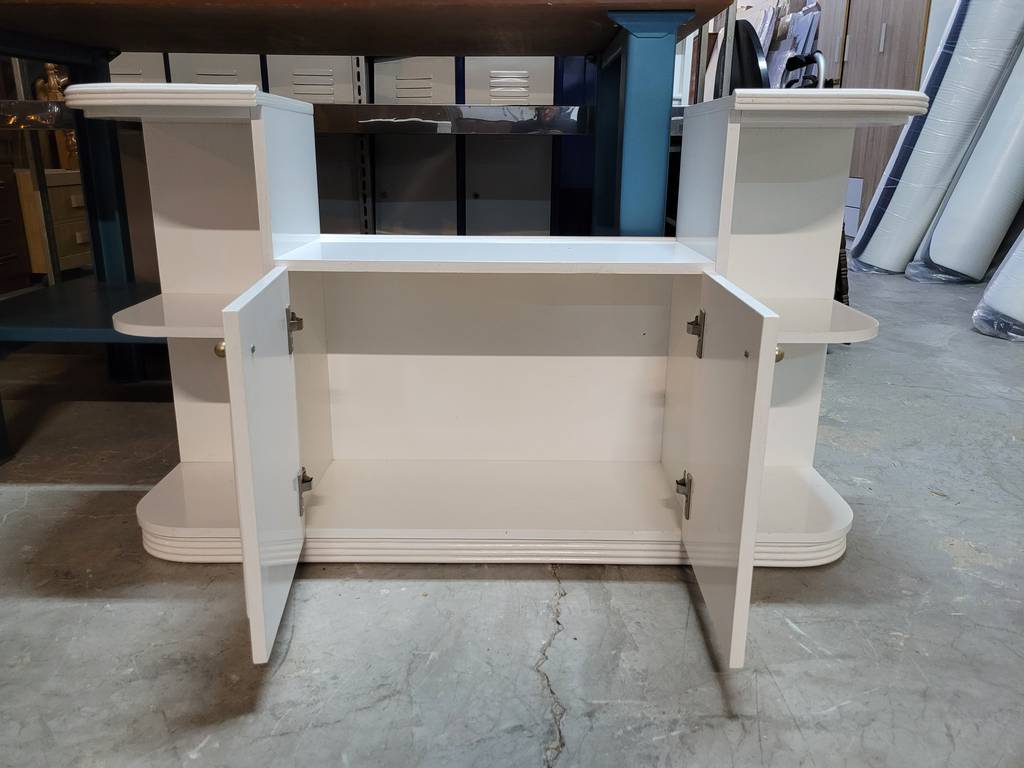 Mueble recibidor o tocador de color blanco muy bonito y original con un espejo a juego incorporado en la parte central. Es un recibidor con repisas en los laterales para exponer figuras y en el centro un compartimento con dos puertas. Es un mueble ideal para darle un toque elegante y moderno a nuestro salón comedor. Como podemos observar en las fotografías presenta desgaste en la parte posterior pero en general se encuentra en buen estado.