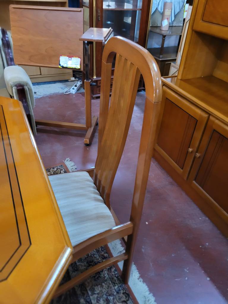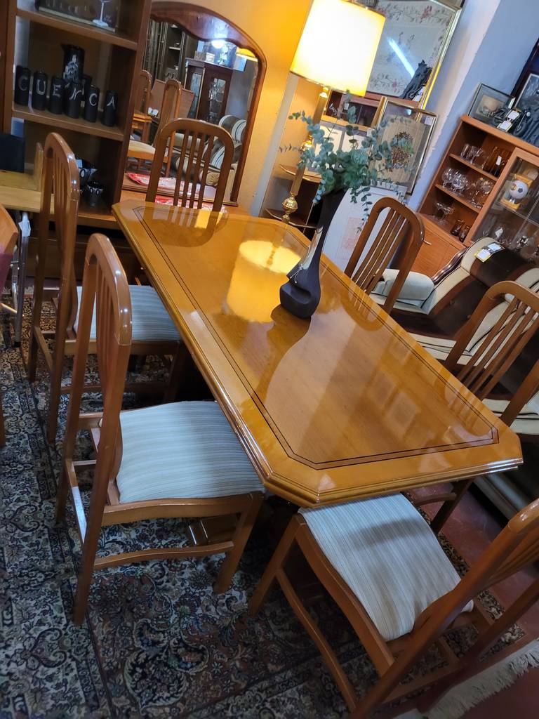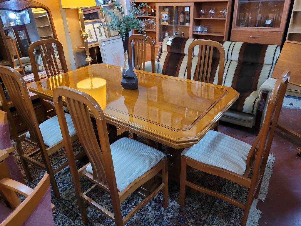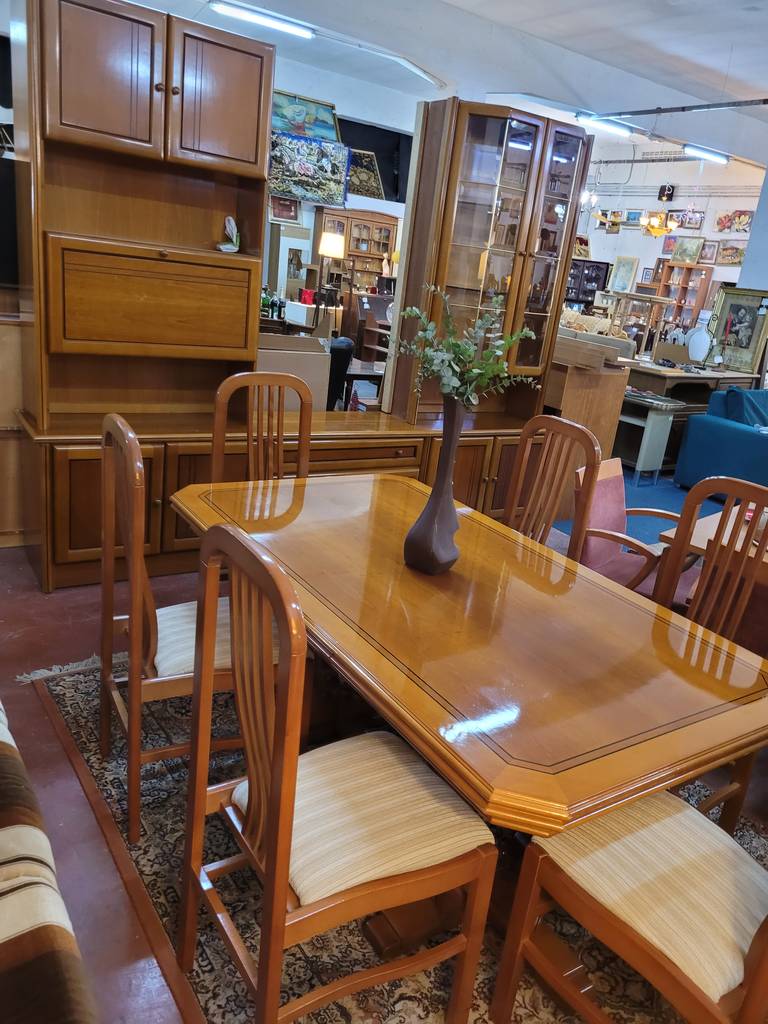 Conjunto de muebles de comedor fabricados en madera de buena calidad de color marrón claro. Se trata de una mesa de gran tamaño y un mueble de grandes dimensiones que tienen un estilo clásico. Son dos muebles perfectos para amueblar todo un salón comedor de estilo vintage. Como se puede observar en las fotografías se encuentran en buenas condiciones.