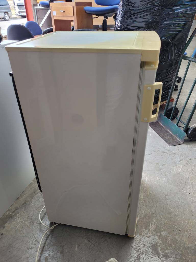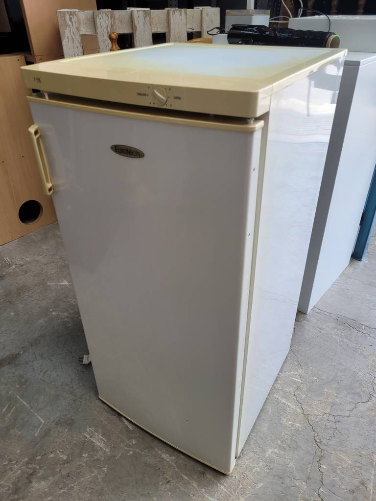 Nevera de la reconocida marca de electrodomésticos Eurotech de color blanco. Se trata de una nevera que tiene una única puerta con un asa en un lateral y en su interior cuenta con dos baldas y dos cajones para conservar los alimentos frescos. Es una nevera ideal para ponerla en una cocina. Como se puede observar en las fotografías se encuentra en buenas condiciones.