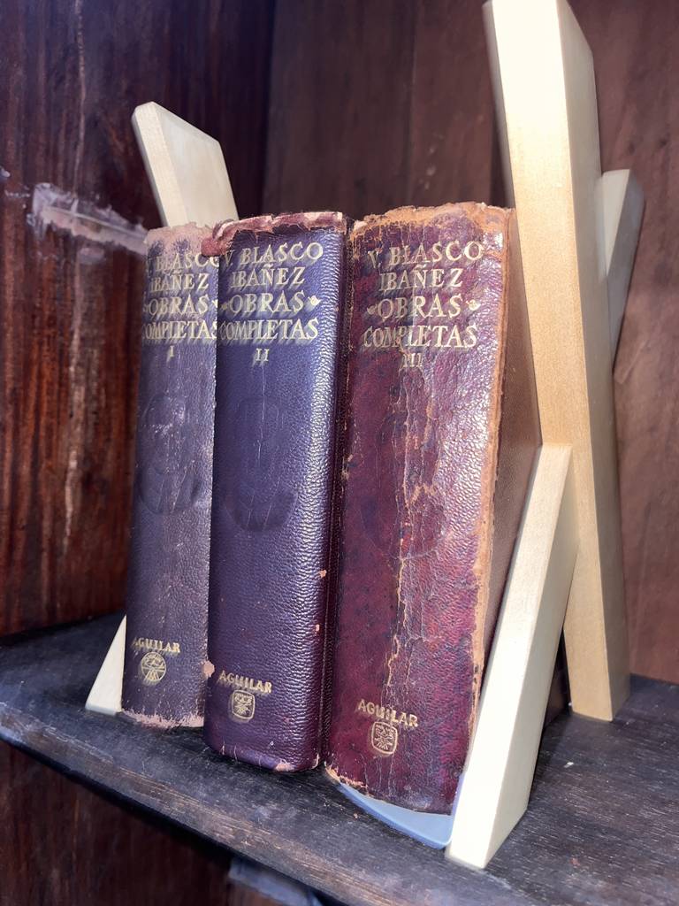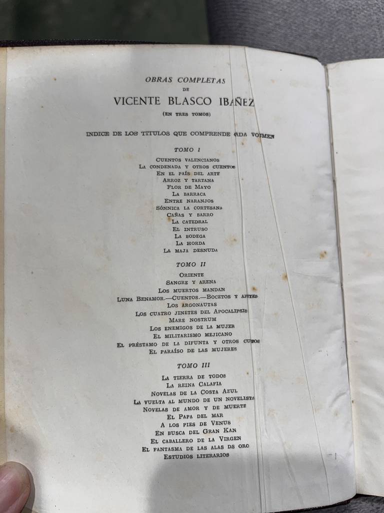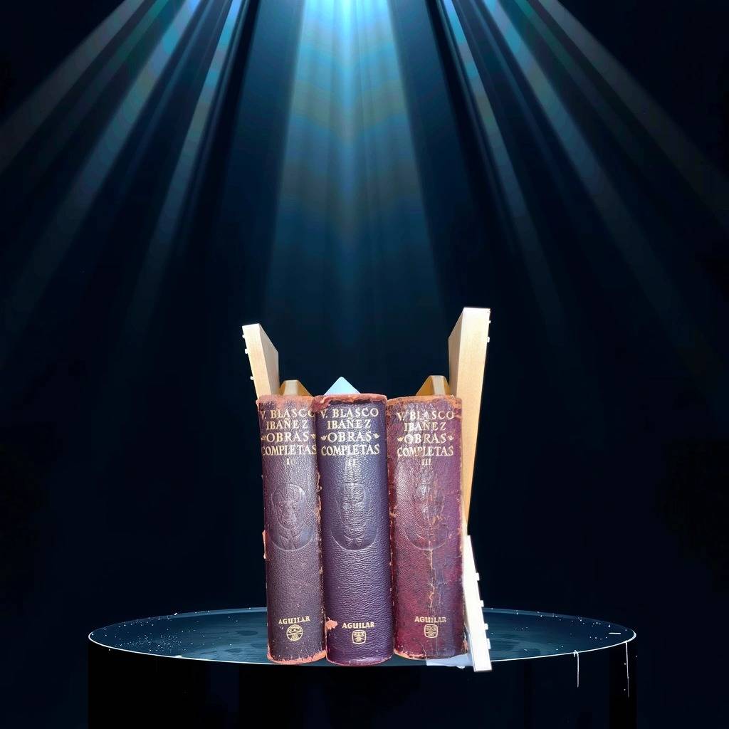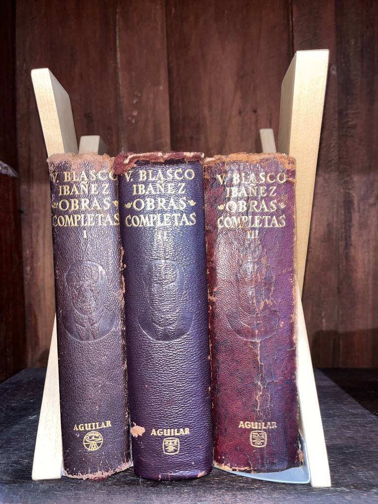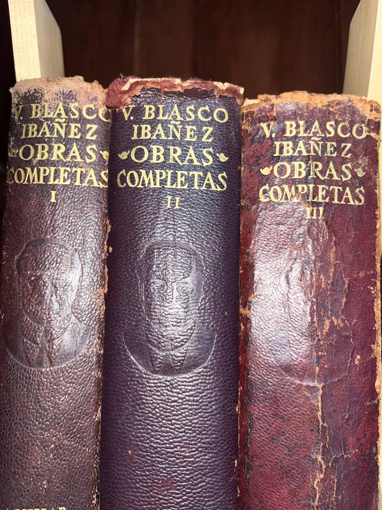 Conjunto de tres libros clásicos que recogen las obras completas del famoso escritor y periodista español Vicente Blasco Ibáñez. Se trata de un conjunto de tres libros de la editorial Aguilar que tiene unas cubiertas de piel algo desgastadas pero el interior se puede leer sin problemas. Son unos libros perfectos para coleccionistas de obras de este autor. Como se ve en las imágenes las obras están algo desgastadas por fuera.