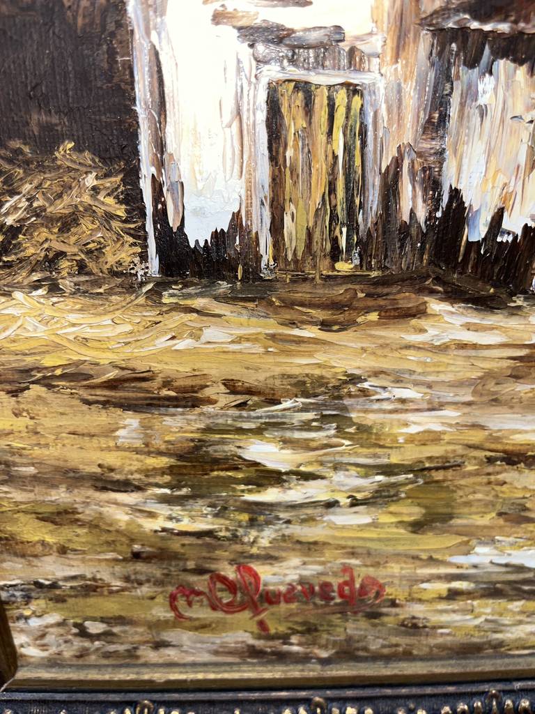 Pintura al óleo realizada por el autor M. Quevedo realizada con mucha precisión y detalle. Está enmarcada en un buen marco elegante en color dorado que ha sido tallado con mucho cuidado y gusto. Se trata de una pieza única y original que decorará con encanto nuestro recibidor, pasillo o salón comedor. Como podemos observar en las fotografías se encuentra en buenas condiciones. Aprovecha esta oportunidad de llevarte un producto exclusivo a buen precio.
