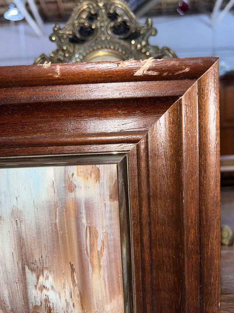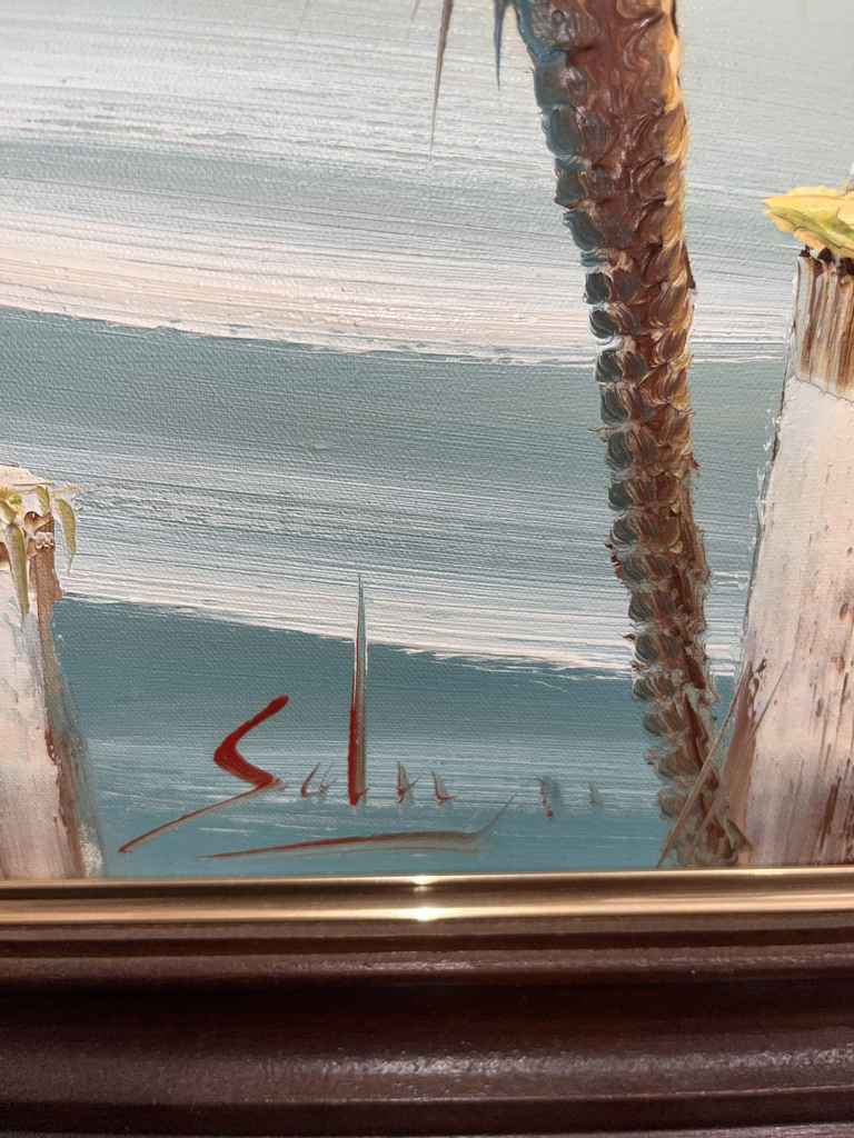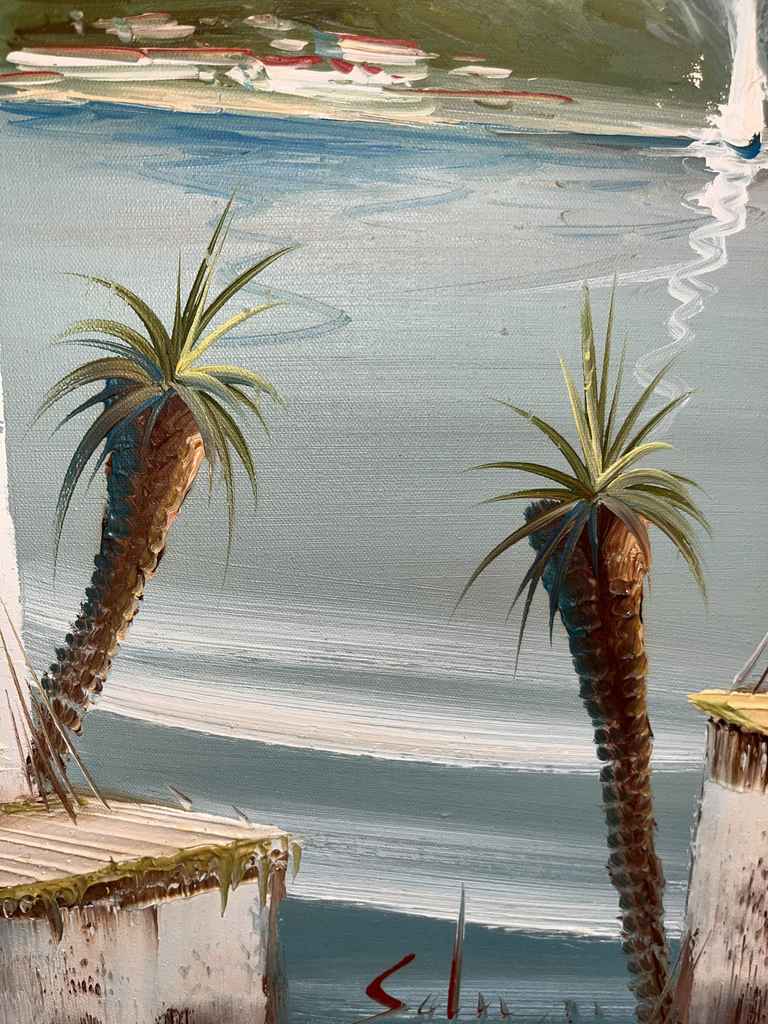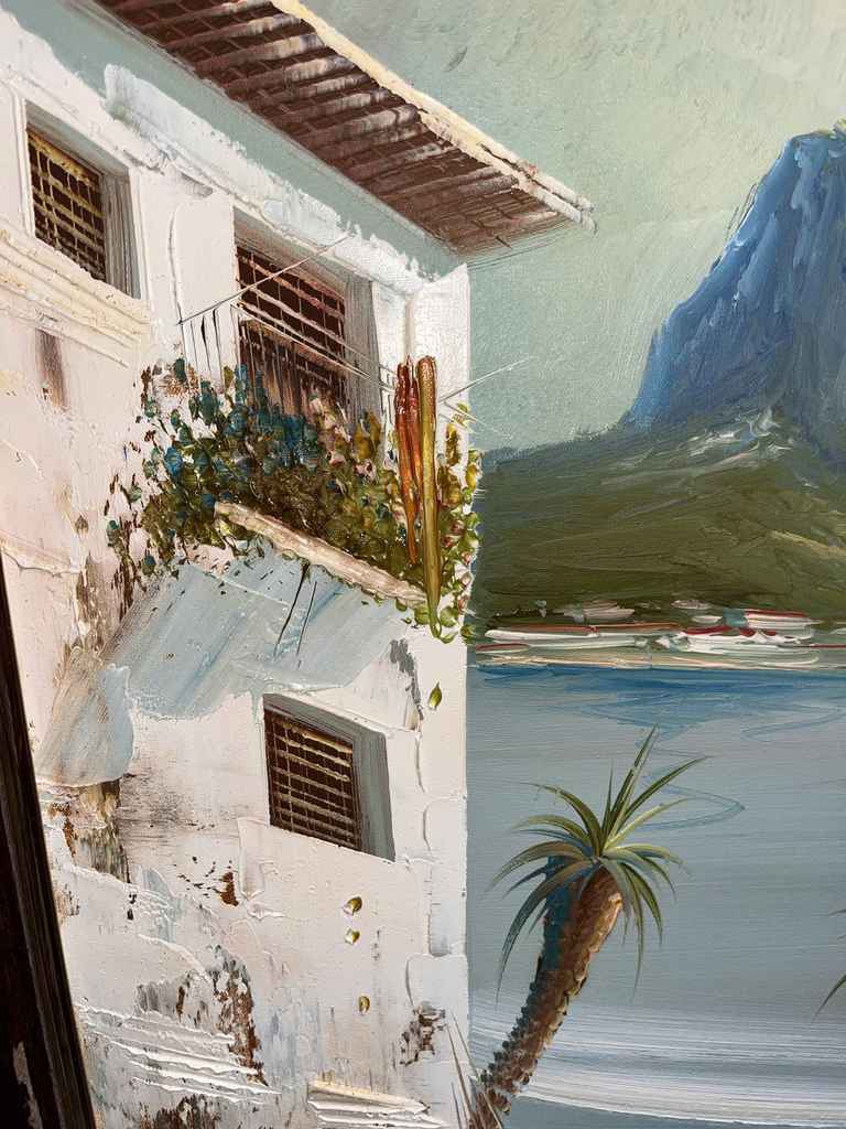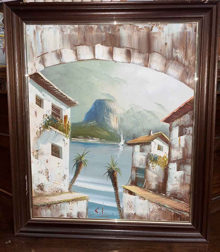 Cuadro pintado al óleo sobre lienzo de tamaño mediano con un marco de madera de buena calidad de color marrón oscuro. Se trata de un cuadro al óleo en el que se observan unas edificaciones a los lados y un mar con una montaña al fondo. Es un cuadro muy bonito que resulta perfecto para colocarlo en la pared de un salón comedor. Como se ve en las imágenes se encuentra en buen estado.