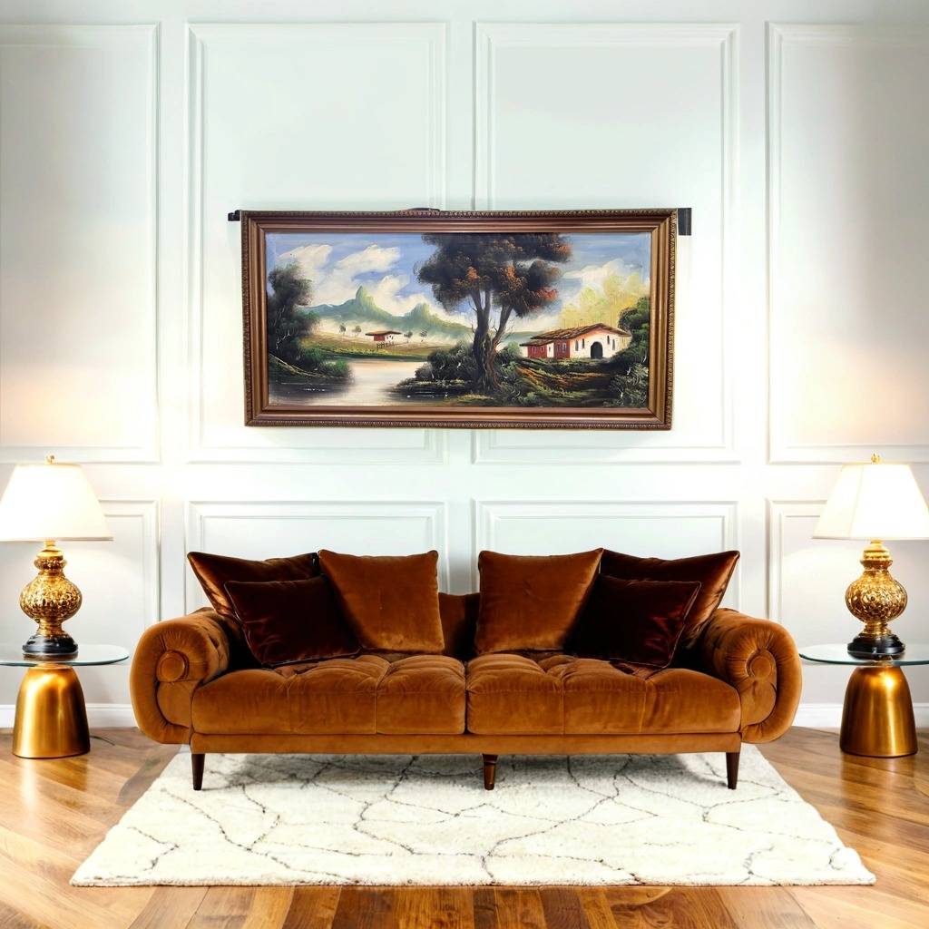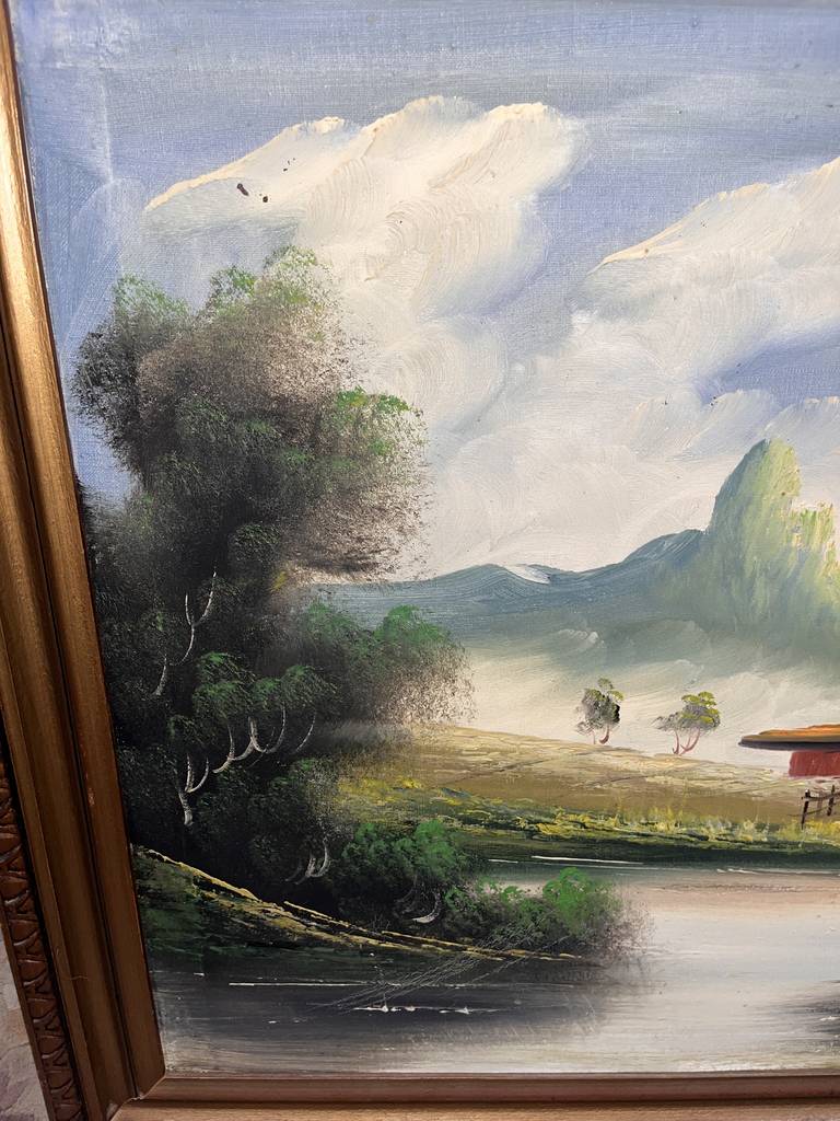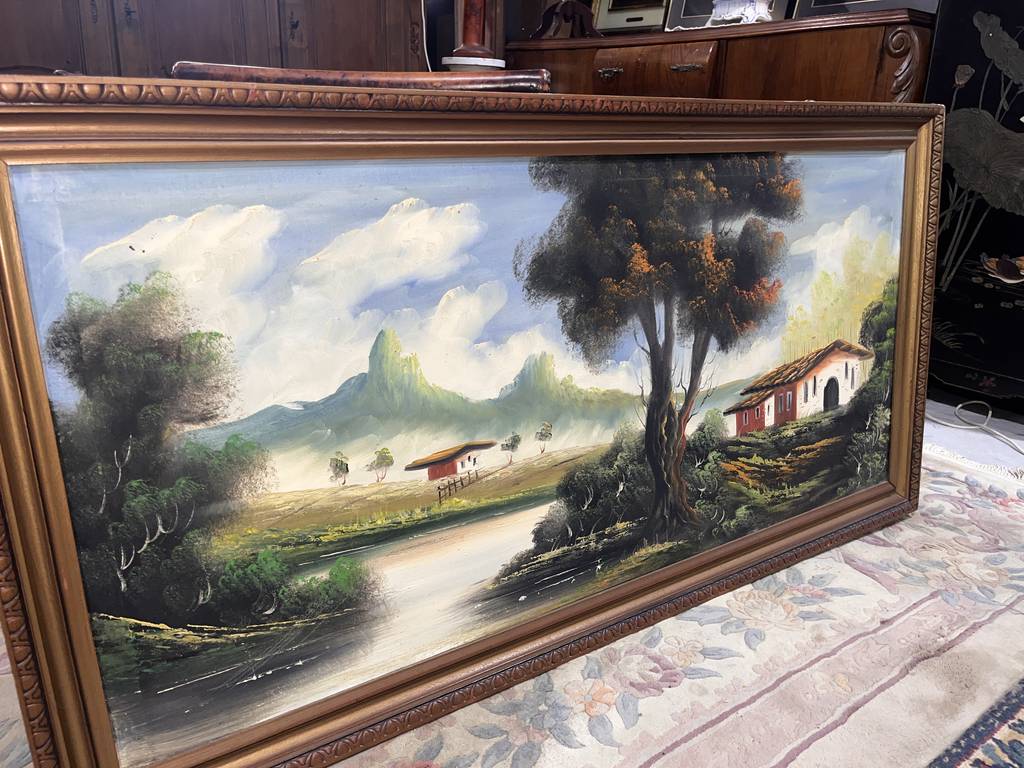 Cuadro pintado al óleo sobre lienzo muy bonito y original en el que podemos observar un paisaje de unas montañas con un lago con dos casas, una a lo lejos y otra cerca y en la parte central un gran árbol. Es un óleo único, ideal para decorar nuestra casa, en especial un recibidor o un salón comedor. Como podemos observar en las fotografías se encuentra en buenas condiciones.